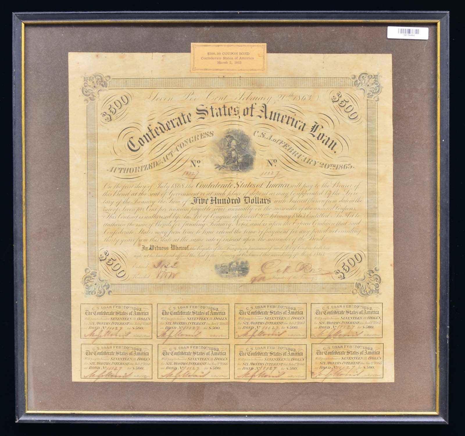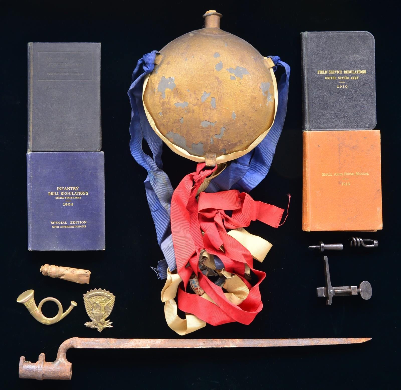 1) 14" X20" framed 1853 Enfield bayonet recovered from Reynolds Woods, Gettysburg Battlefield, PA in the late 1980s by Larry Sharp. 2) Picture framed 18-1/2" x 17-1/2" 1863 $500 coupon bond from Confederate States of America. 3) Model 1816 Conversion Musket tools consisting of mainspring vice, 69 cal. ball puller & musket wiper. 4) Window boxed Civil War era 69 cal. buck & ball cartridge w/ three 00 buckshot. 5) 4 hardbound pocket size manuals: 1913 Small Arms Firing Manual printed 1914 / U.S. Army 1910 Field Service Regulations / 1931 first edition of Machine Gunners Pocket Manual / 1904 Infantry Drill Regulations Special Edition copyrighted 1908. 6) Pancake shaped canteen w/ gold over gray paint having red, white & blue ribbons along w/ bronze medals indicating Grand Army of the Republic veteran plus Ohio Survivor of Gettysburg. 7) Boxed reproduction metal pins depicting spread eagle plus bugle. CONDITION: all items very good appearing. (02-16464-2/NW). $400-600.
