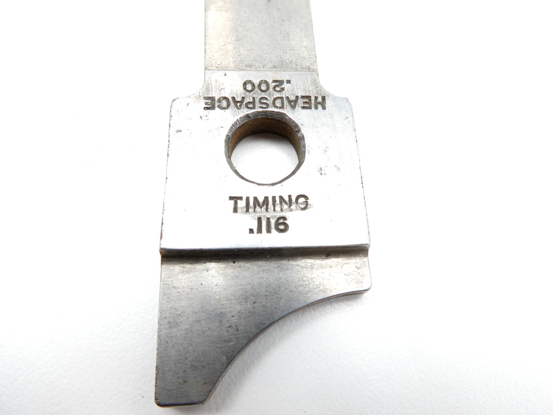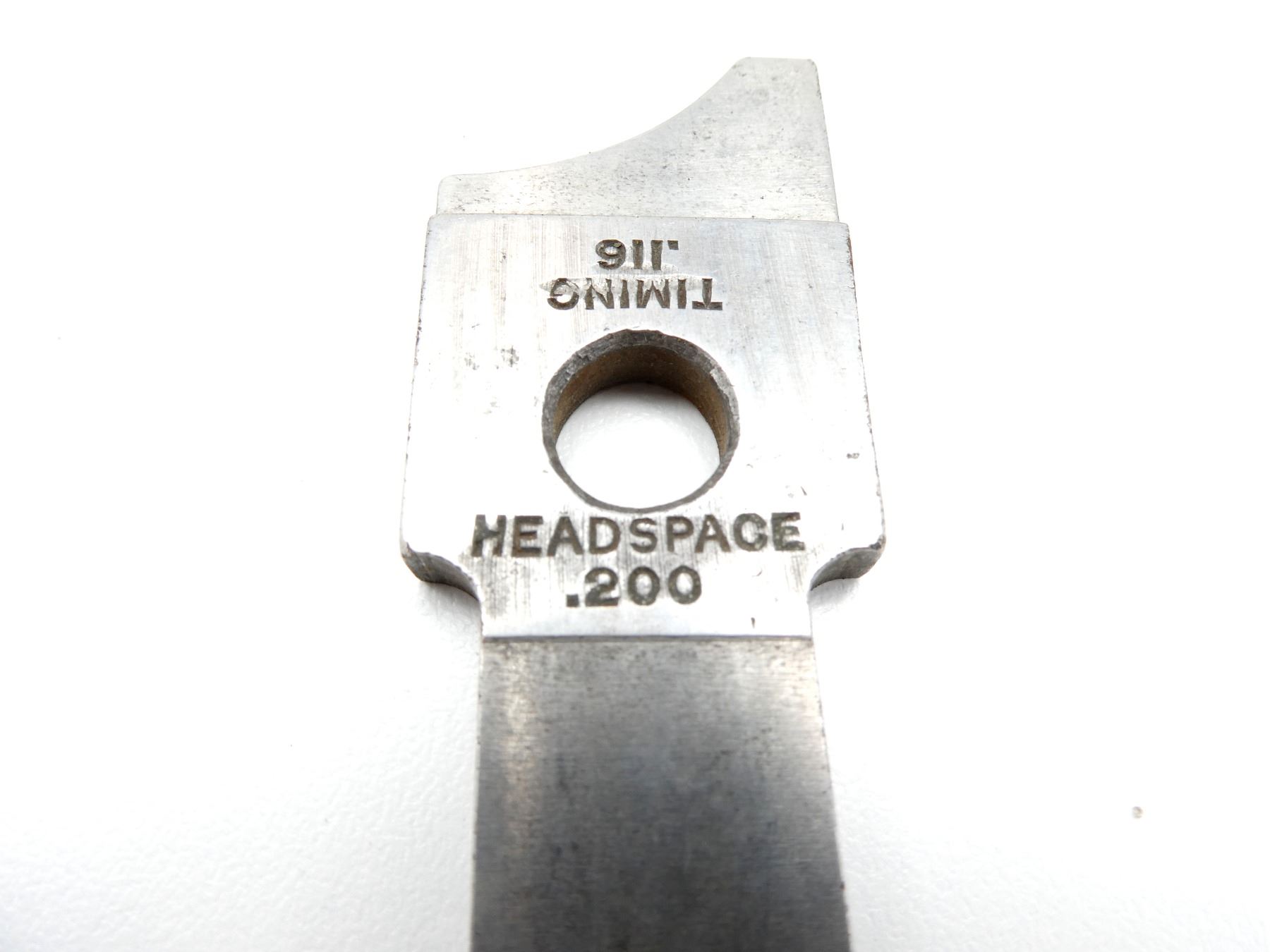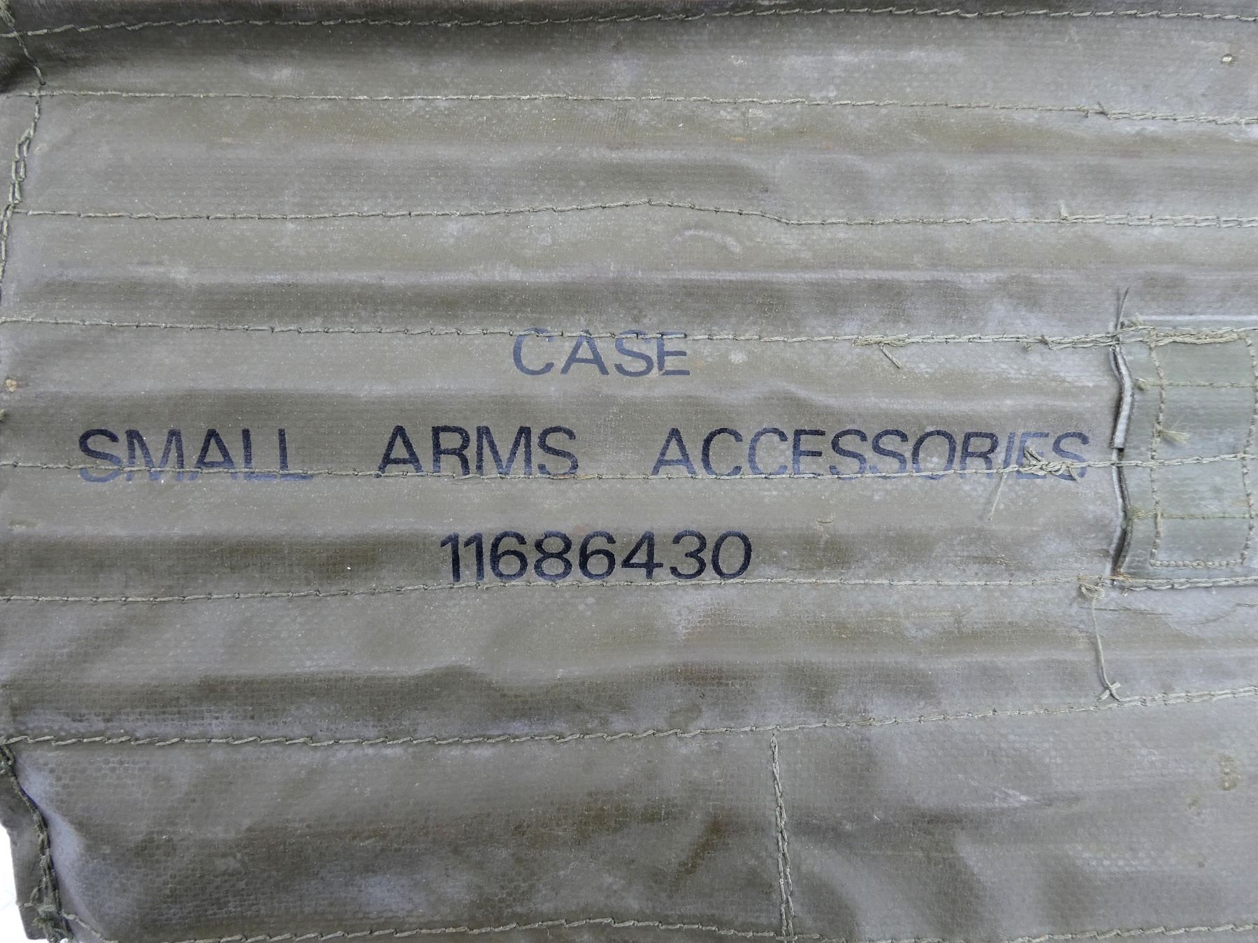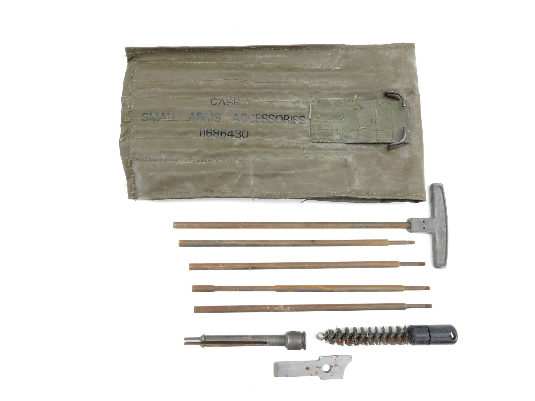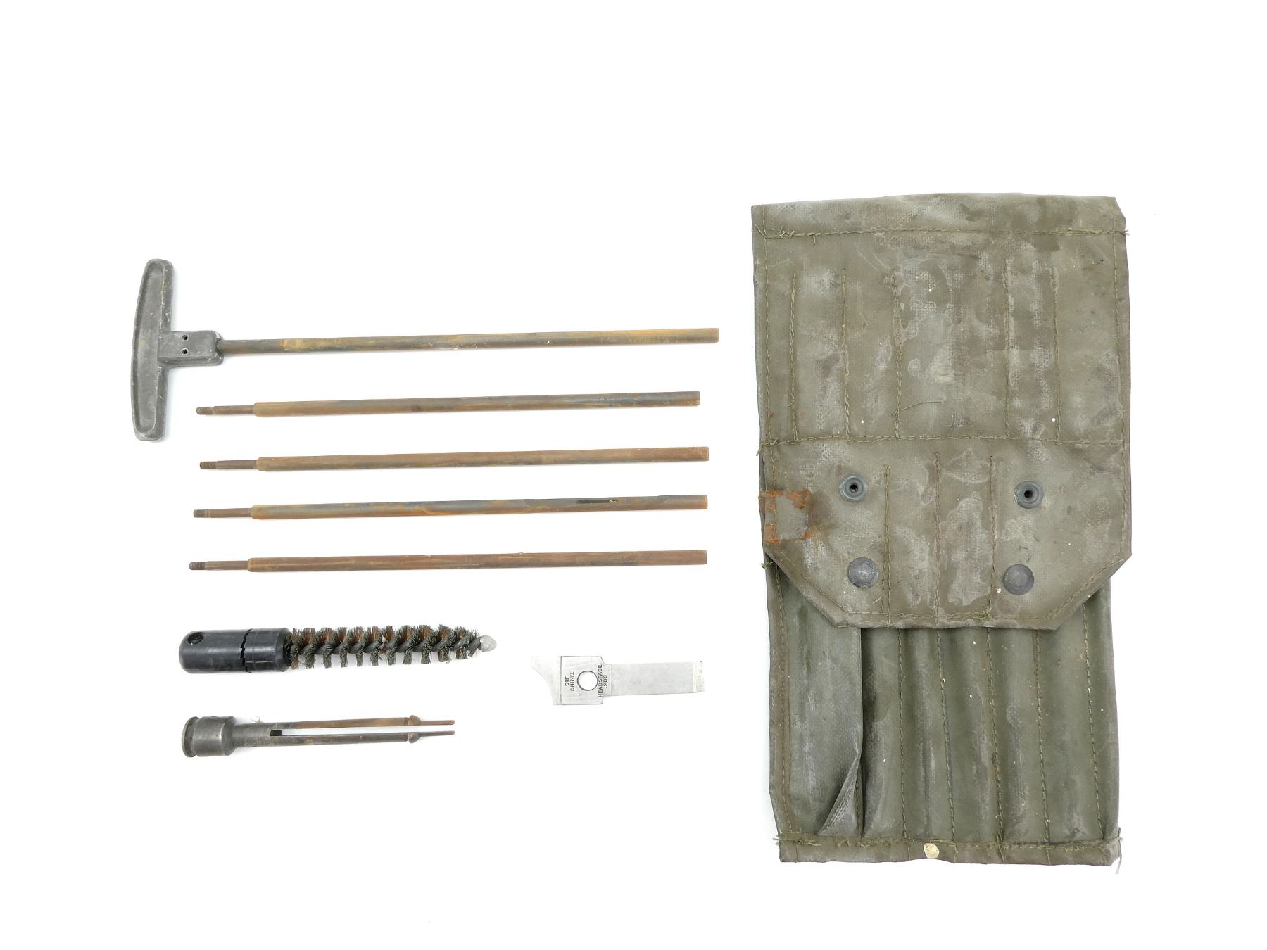 (1) .50 CAL. CLEANING KIT WITH 5-PIECE CLEANING ROD, RUPTURED CASE EXTRACTOR, BORE BRUSH, HEADSPACE / TIMING GAUGE, MARKED: "TIMING, .116" & "HEADSPACE, .200" & GREEN NYLON CASE WITH BELT HOOK, MARKED: "CASE, SMALL ARMS ACCESSORIES, 11686430", SHOWS AGE / WEAR. SEE PHOTOS.