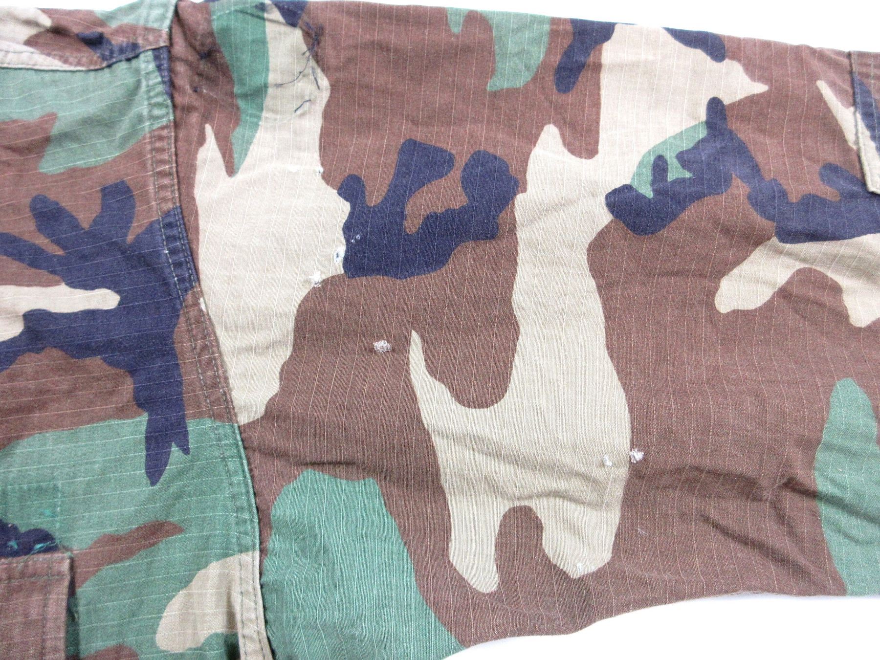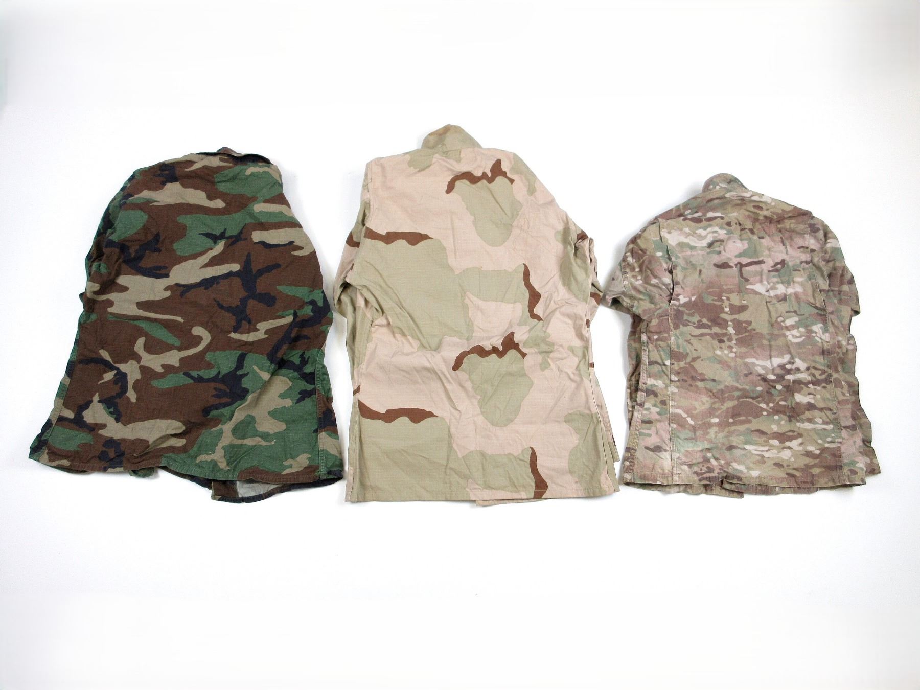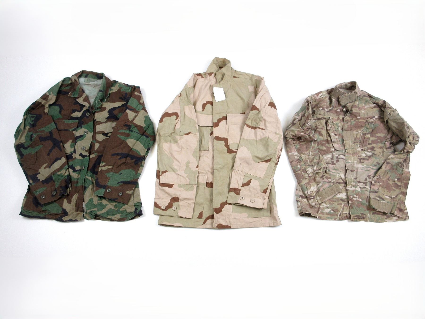 LOT INCLUDES; (3) CAMO COMBAT COATS, ONE DESERT CAMO, ONE HOT WEATHER WOODLAND CAMO, ONE ARMY COMBAT CAMO, SIZES XSMALL-REGULAR / SMALL-LONG / MEDIUM-REGULAR, TWO WITH BUTTON FRONTS, ONE WITH VELCRO / ZIPPERED FRONT (WORKS), ALL SHOW AGE / SOME WITH SLIGHT TEAR. SEE PHOTOS.