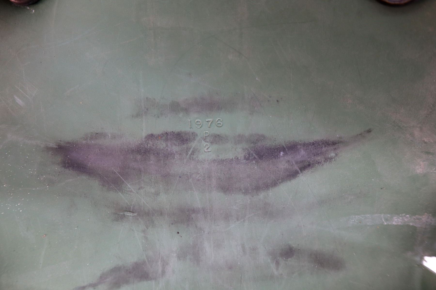 (1) BLACK PAINTED FOLDING METAL ENTRENCHING TOOL, CAN BE USED AS AN AXE/SAW/SHOVEL, FOLDS 3 TIMES TO FIT IN GREEN RUBBERIZED CASE, CASE HAS TWO BELT HOOKS ON BACK, TOOL MARKED: "U.S." & "AMES 84", CASE MARKED: "1976, P, 2", TOOL HEAD APPROX. 5 7/8" WIDTH, WHEN UN-FOLDED OAL APPROX. 23 3/8", OAL APPROX. 9.25" ONCE FOLDED. SEE PHOTOS.