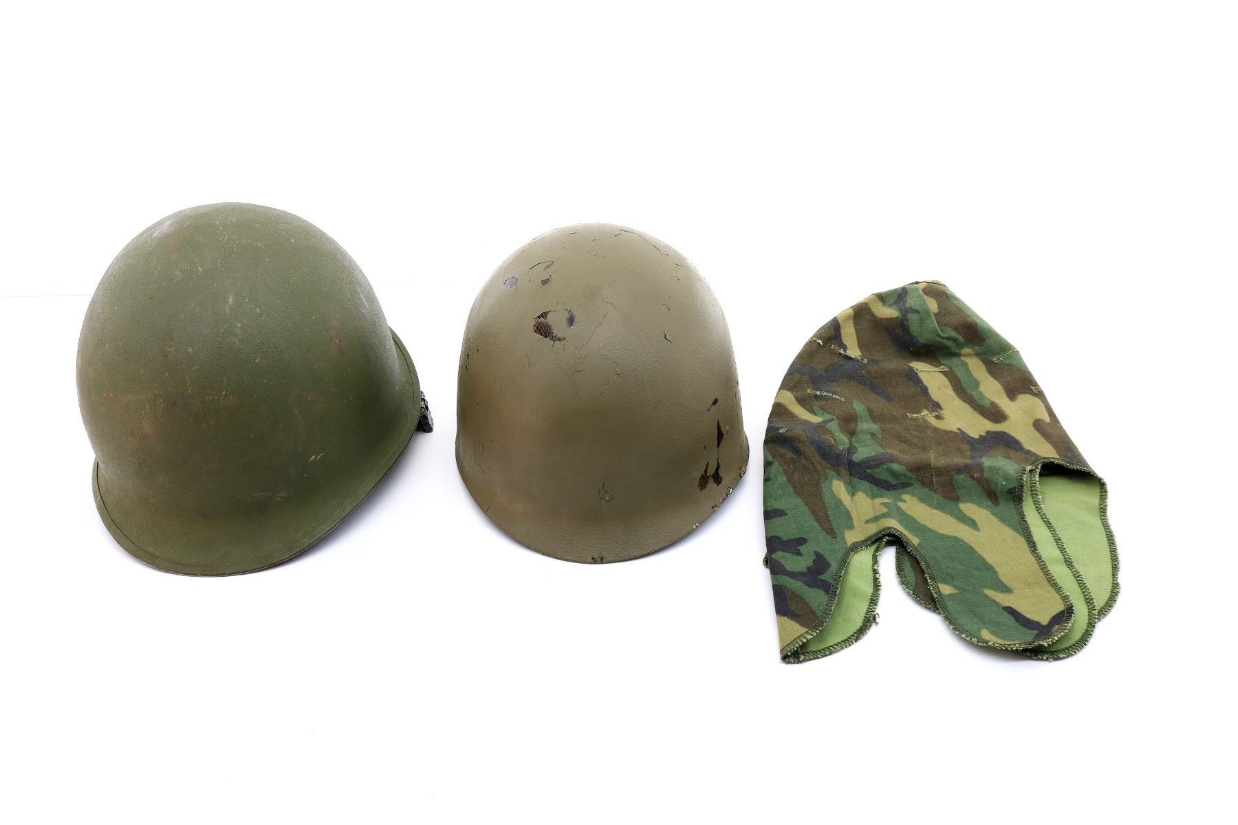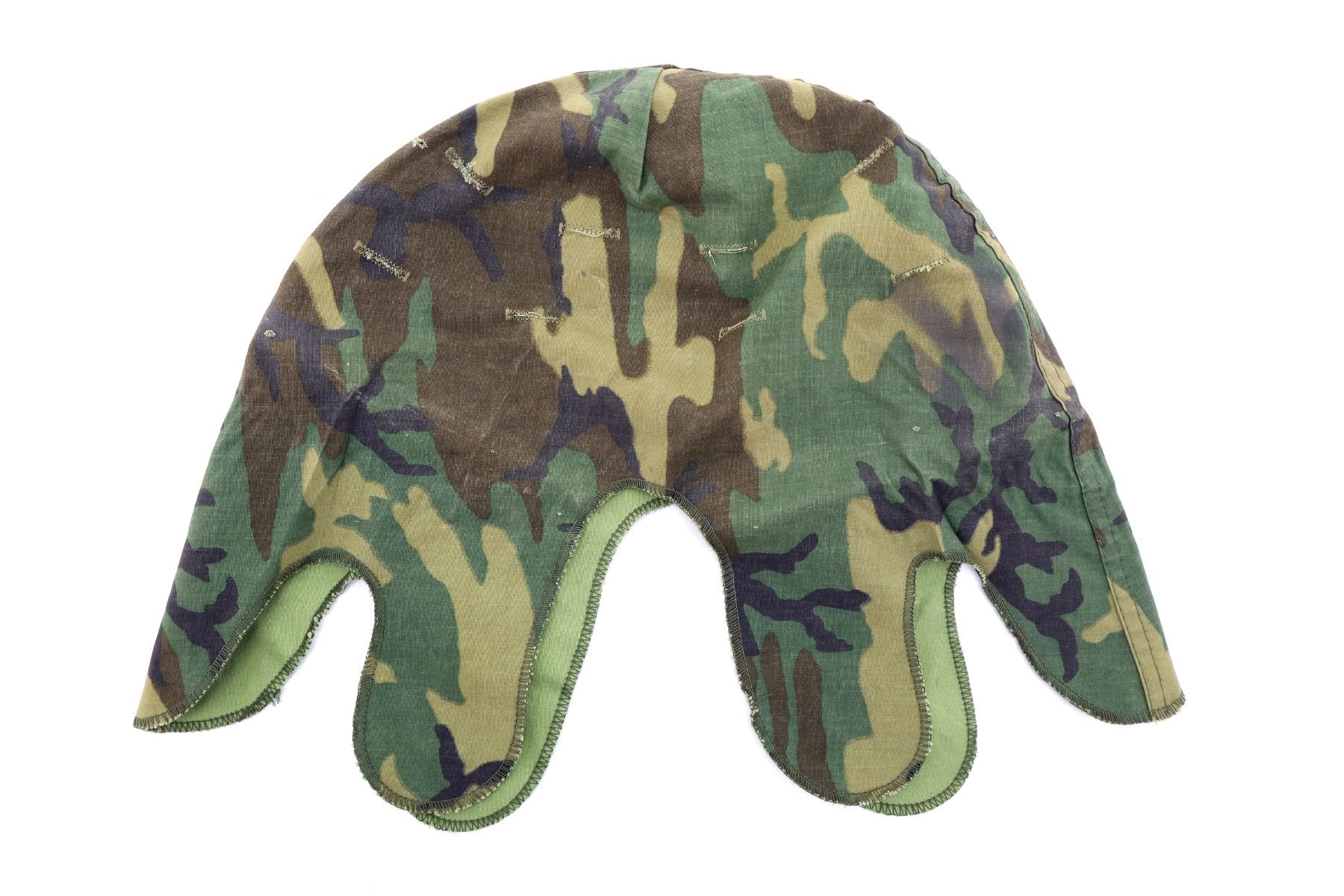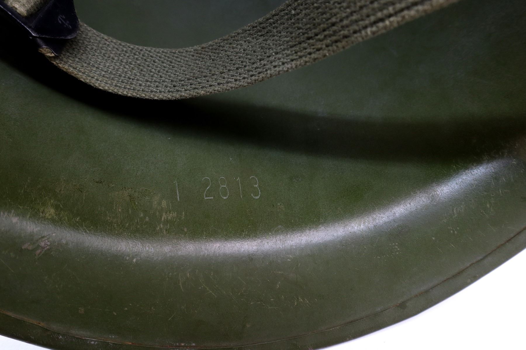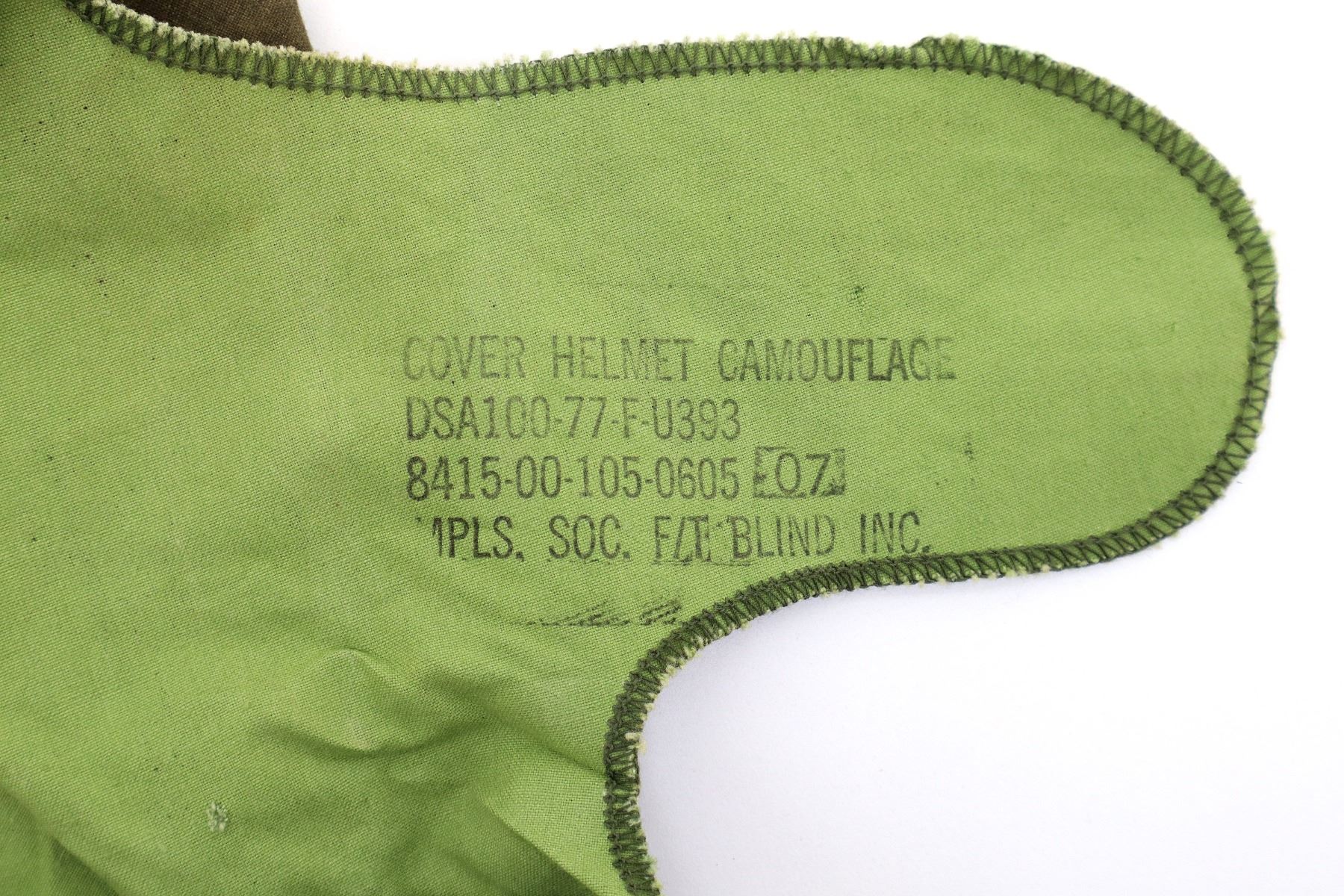 (1) GREEN PAINTED STEEL SHELL, MARKED: "1 2813", GREEN CANVAS CHIN STRAP WITH METAL FITTINGS, GREEN / BROWN PAINTED HELMET LINER, PAINT IS CHIPPED / SHOWS WEAR, CANVAS & LEATHER HEAD LINER, VARIOUS FAINT / UN-CLEAR MARKINGS ON CANVAS HEAD BAND, MIDDLE OF HELMET LINER MARKED: "MX", CAMO HELMET COVER, MARKED: "COVER HELMET CAMOUFLAGE, DSA100-77-F-U393, 8415-00-105-0605" ETC., SHOWS WEAR. SEE PHOTOS.