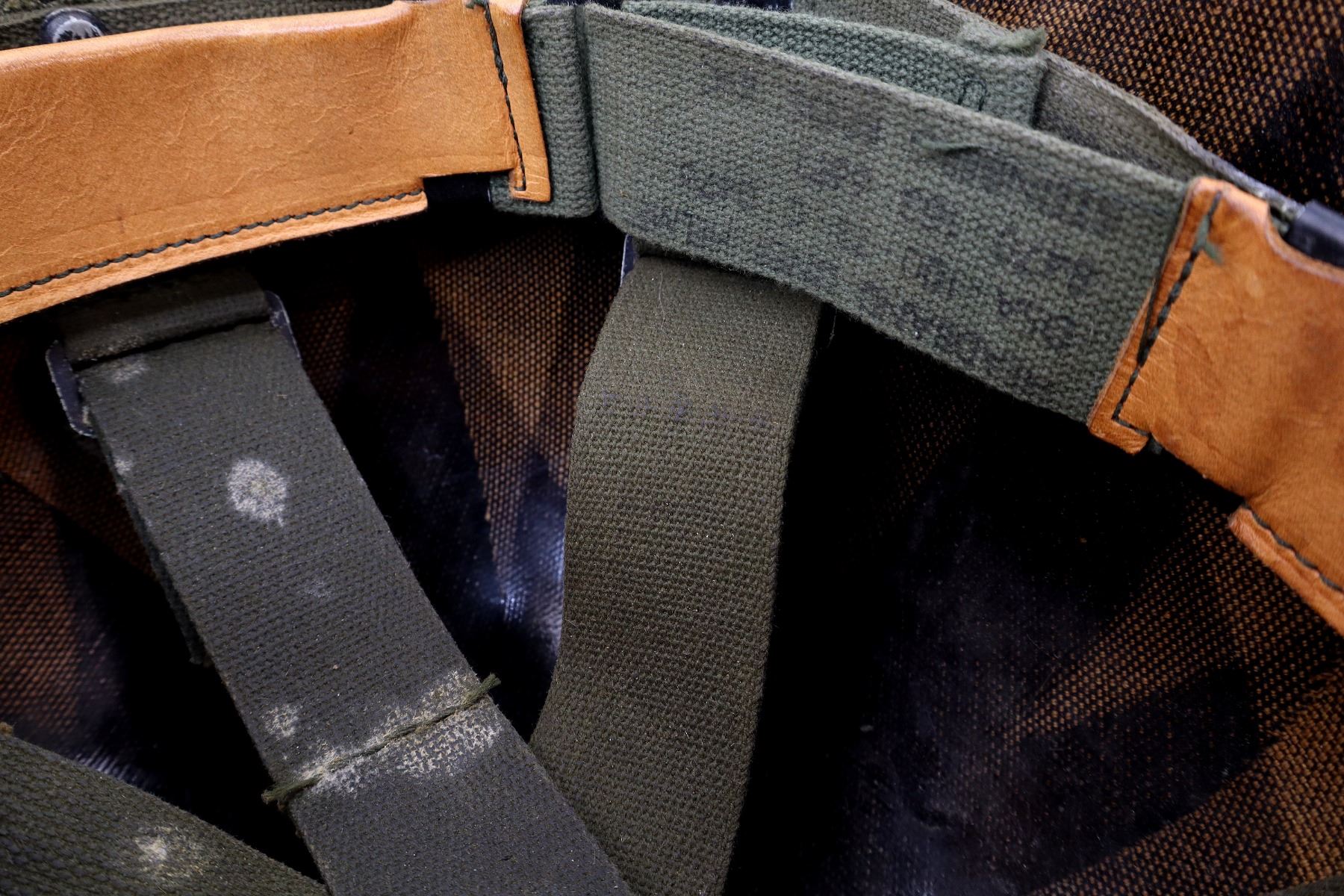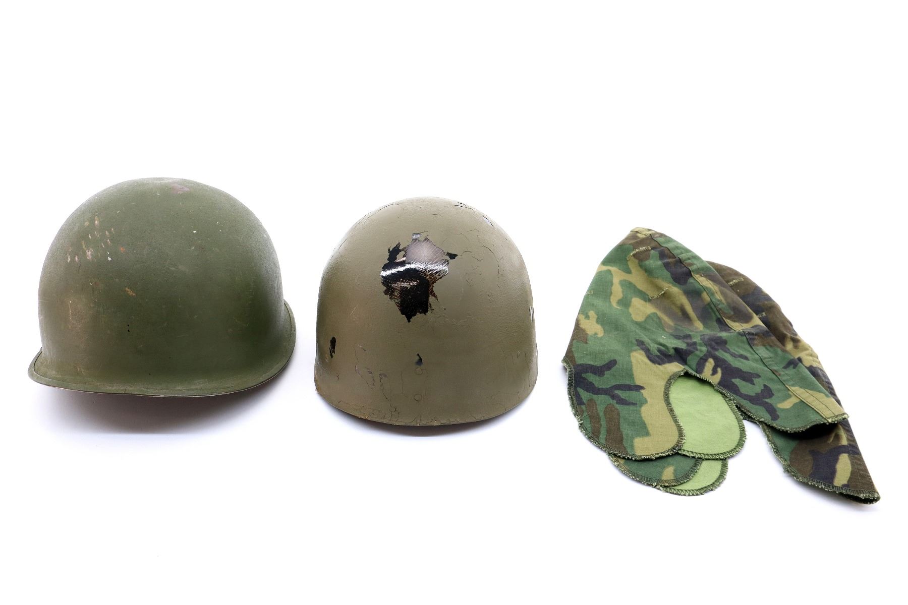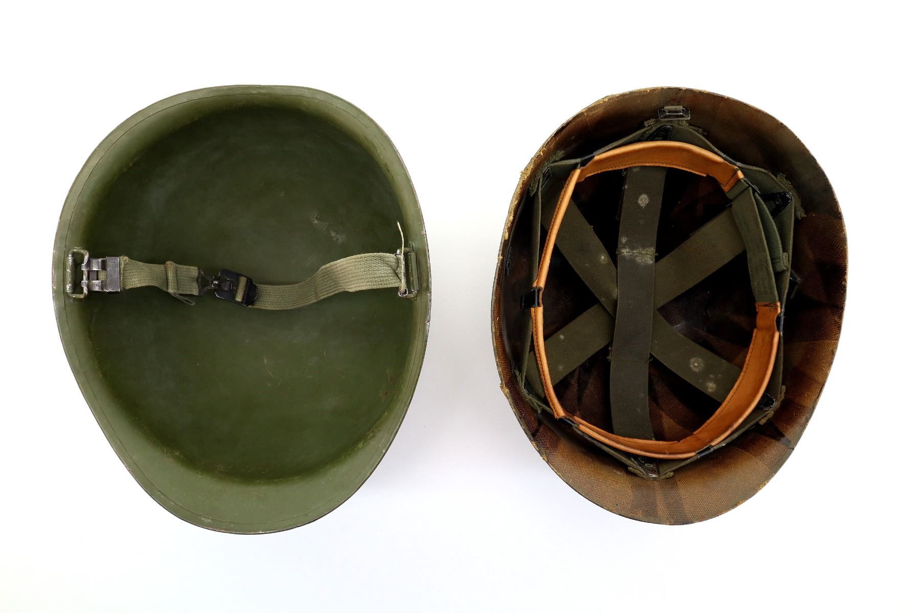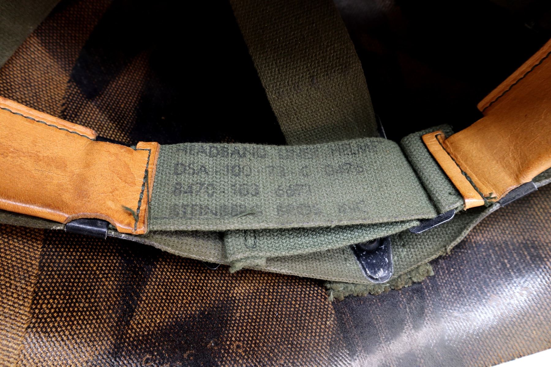 (1) GREEN PAINTED STEEL SHELL, MARKED: "1 2813", GREEN CANVAS CHIN STRAP WITH METAL FITTINGS, GREEN / BROWN PAINTED HELMET LINER, PAINT IS CHIPPED / SHOWS WEAR, CANVAS & LEATHER HEAD LINER, VARIOUS FAINT / UN-CLEAR MARKINGS ON CANVAS HEAD BAND, MIDDLE OF HELMET LINER MARKED: "MX", CAMO HELMET COVER, MARKED: "COVER HELMET CAMOUFLAGE, DSA100-77-F-U393, 8415-00-105-0605" ETC., SHOWS WEAR. SEE PHOTOS.