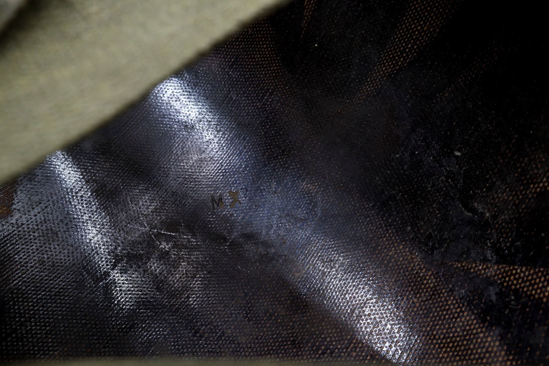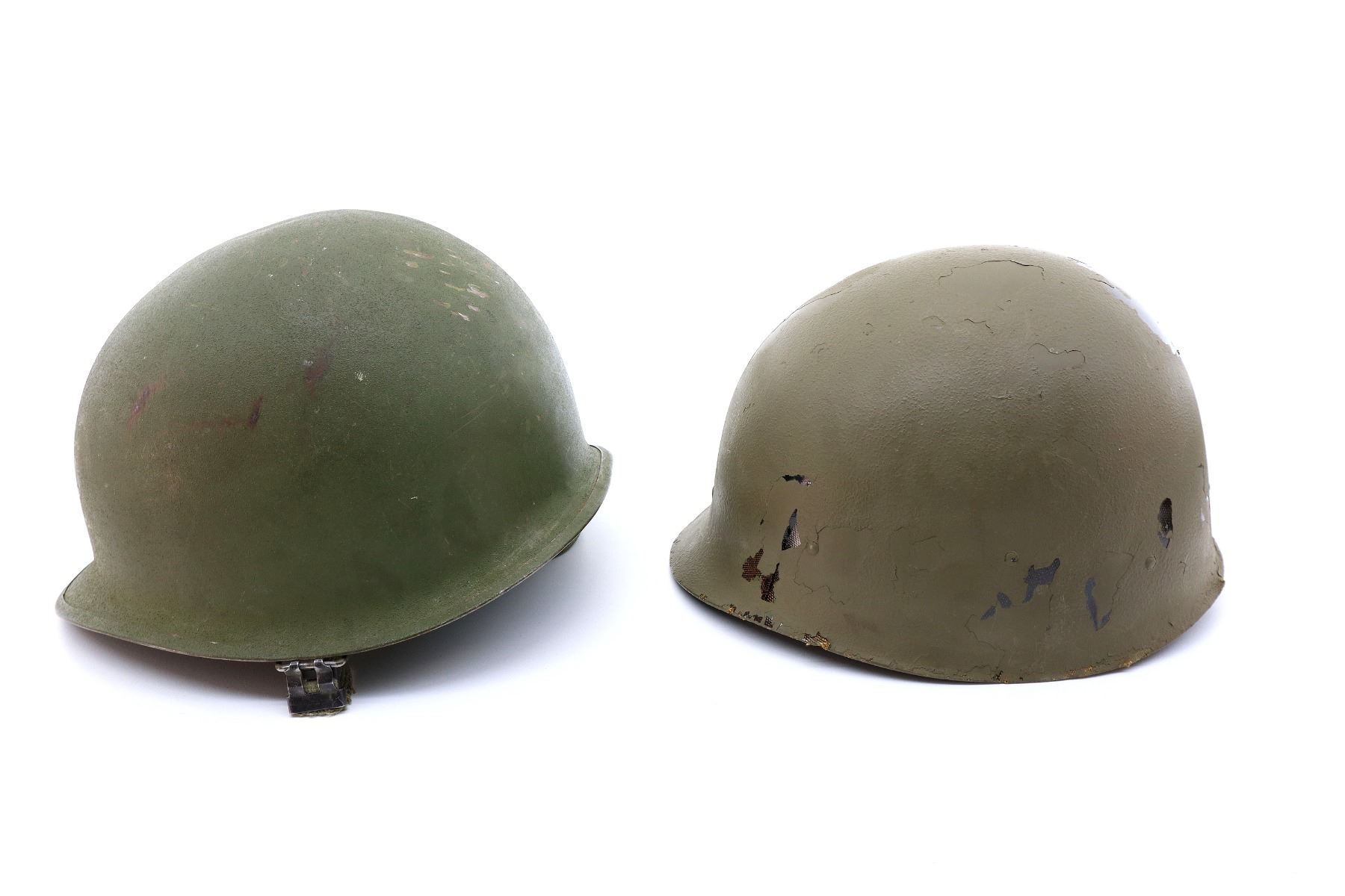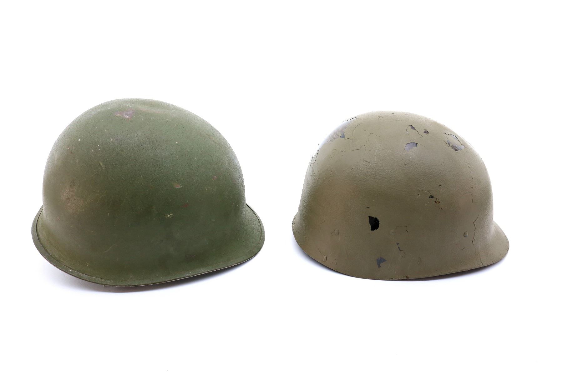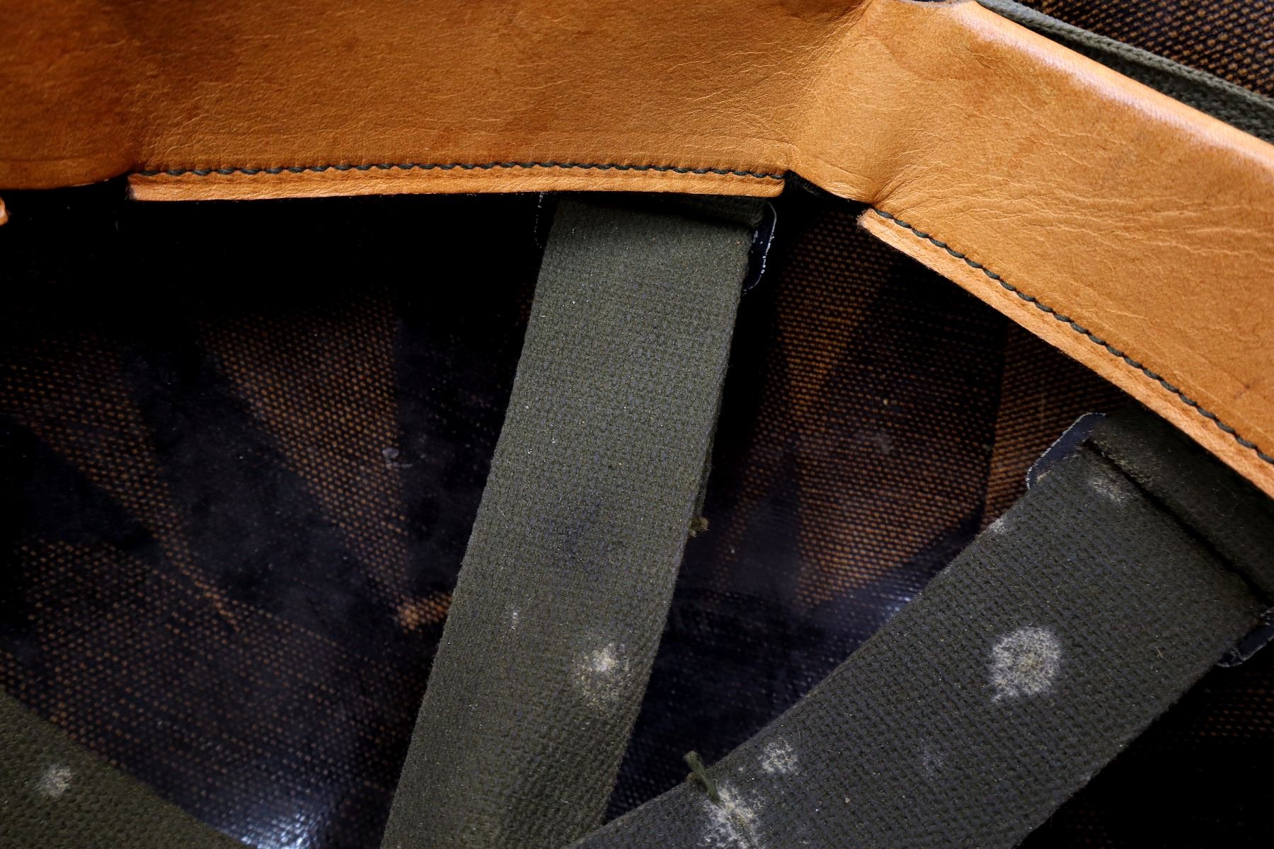 (1) GREEN PAINTED STEEL SHELL, MARKED: "1 2813", GREEN CANVAS CHIN STRAP WITH METAL FITTINGS, GREEN / BROWN PAINTED HELMET LINER, PAINT IS CHIPPED / SHOWS WEAR, CANVAS & LEATHER HEAD LINER, VARIOUS FAINT / UN-CLEAR MARKINGS ON CANVAS HEAD BAND, MIDDLE OF HELMET LINER MARKED: "MX", CAMO HELMET COVER, MARKED: "COVER HELMET CAMOUFLAGE, DSA100-77-F-U393, 8415-00-105-0605" ETC., SHOWS WEAR. SEE PHOTOS.