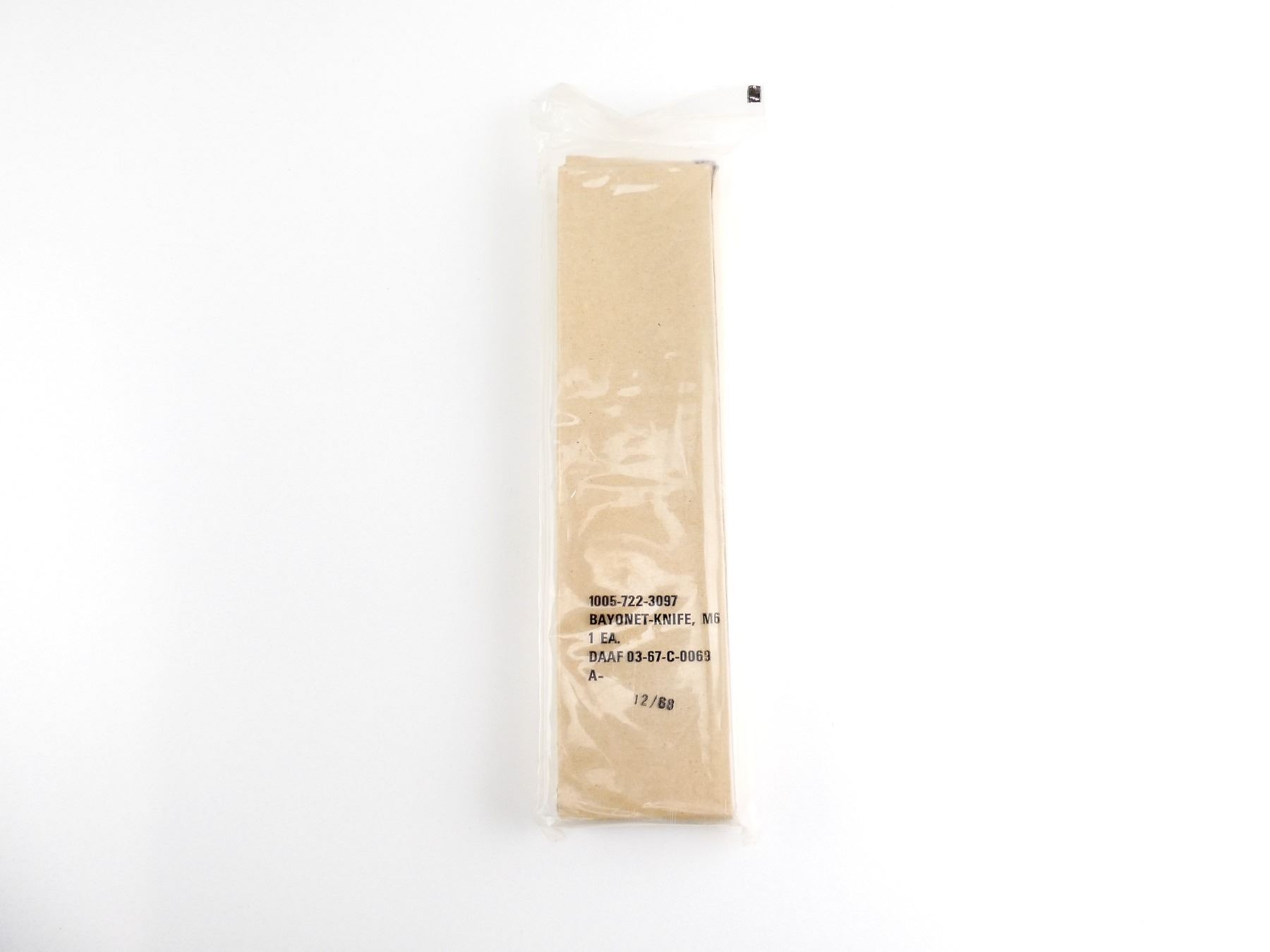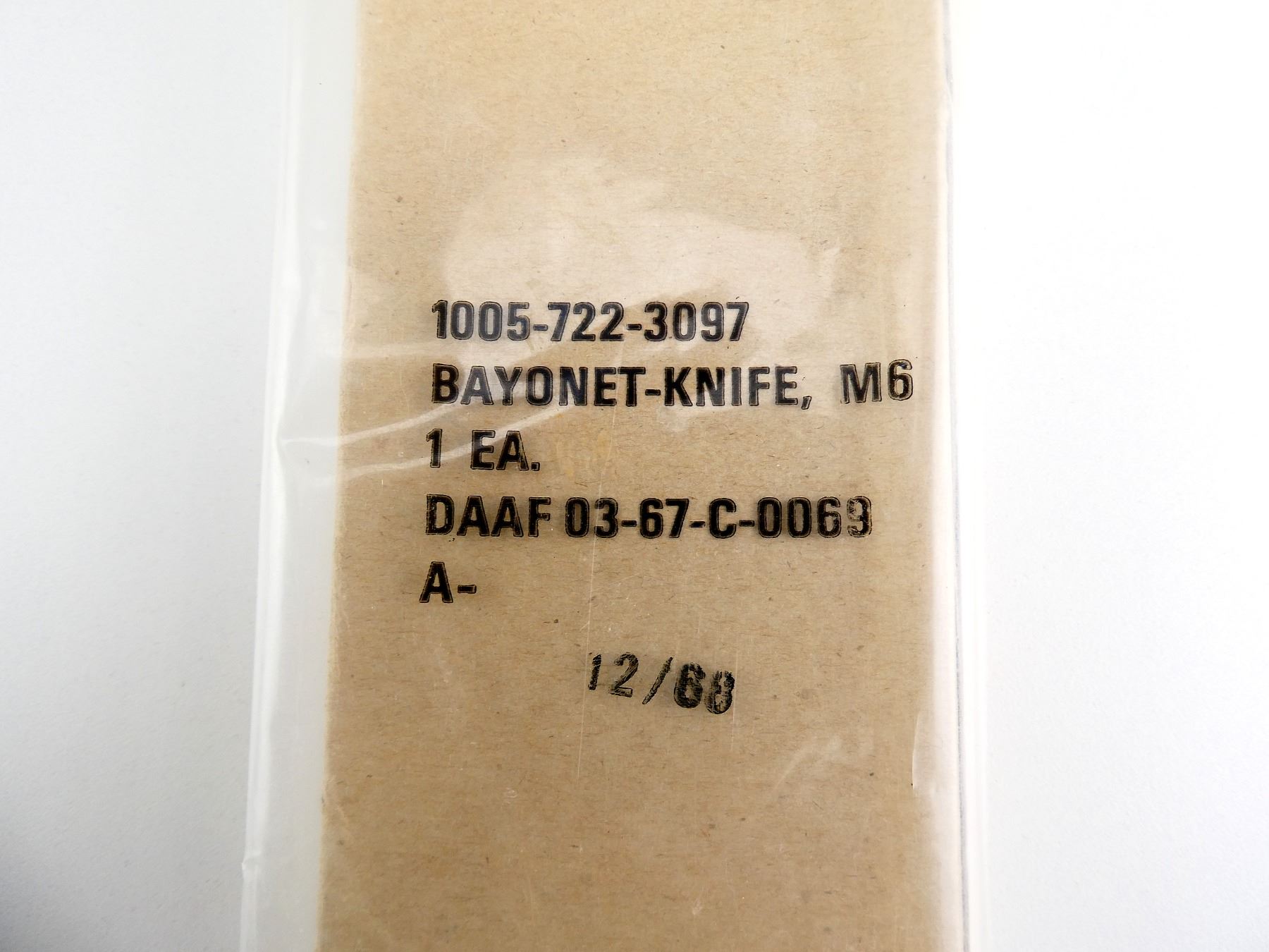 (1) FITS 7.62MM NATO U.S. M14 SELECTIVE-FIRE RIFLES, M6 KNIFE BAYONET, NOS, UN-OPENED ORIGINAL PACKAGING, PACKAGING MARKED: "1005-722-3097, BAYONET-KNIFE, M6, 1EA., DAAF 03-67-C-0069, A-, 12/68". SEE PHOTOS.