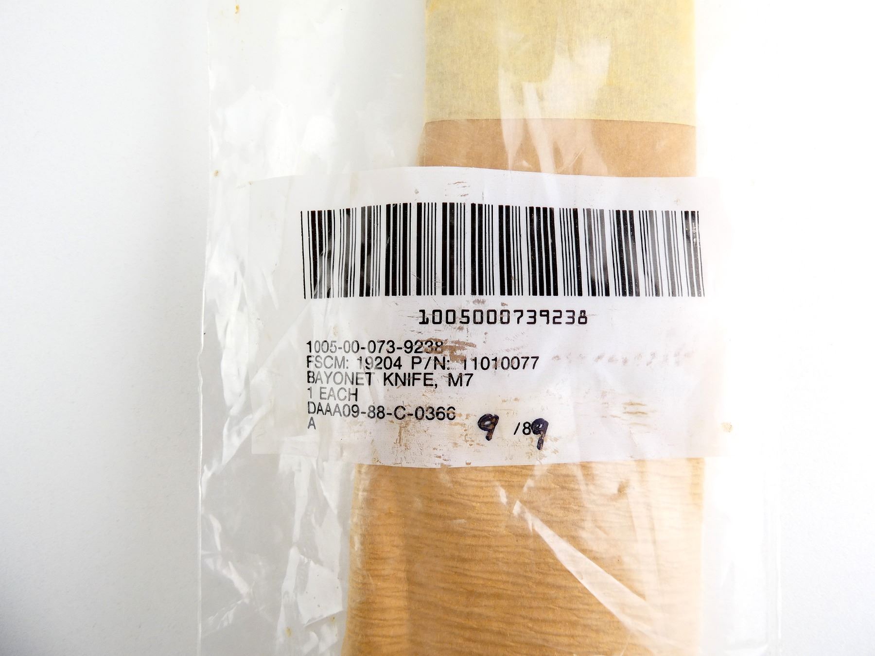 (1) FITS 5.56MM M16 RIFLES, M7 KNIFE BAYONET, NOS, UN-OPENED ORIGINAL PACKAGING, PACKAGING MARKED: "1005-00-073-9238, FSCM: 19204 P/N: 11010077, BAYONET KNIFE, M7, 1 EACH, DAAA09-88-C-0366, A, 9/89" & VARIOUS OTHER MARKINGS. SEE PHOTOS.
