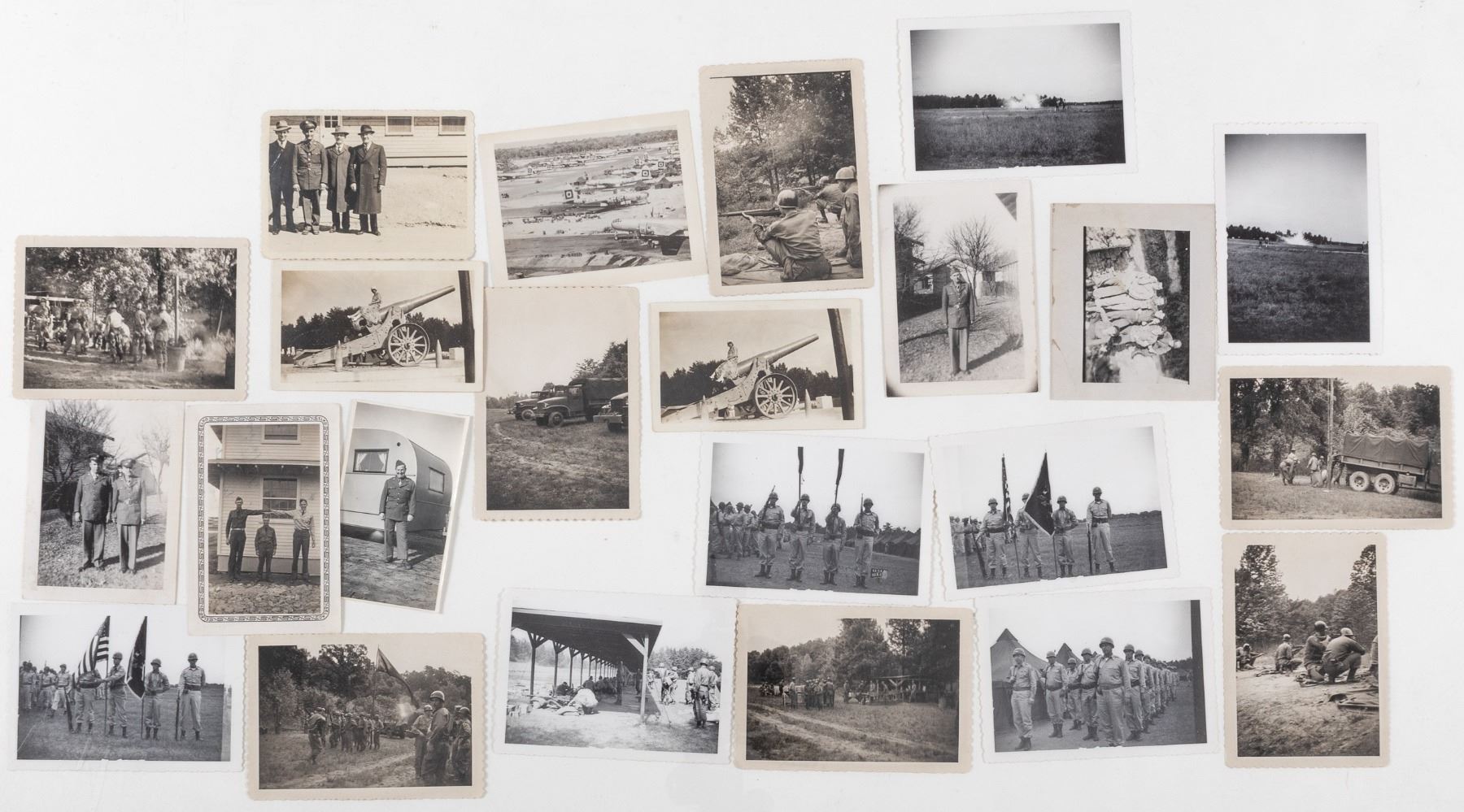 Group of 23 candid and personal photographs of US troops. Most photos are not dated, likely WWII and Korea. Photos show soldiers on the battlefield, at target practice, machinery, and explosion tests. Approx. 3.5 x 5 inches. Some photos have inscriptions or stamps on verso.