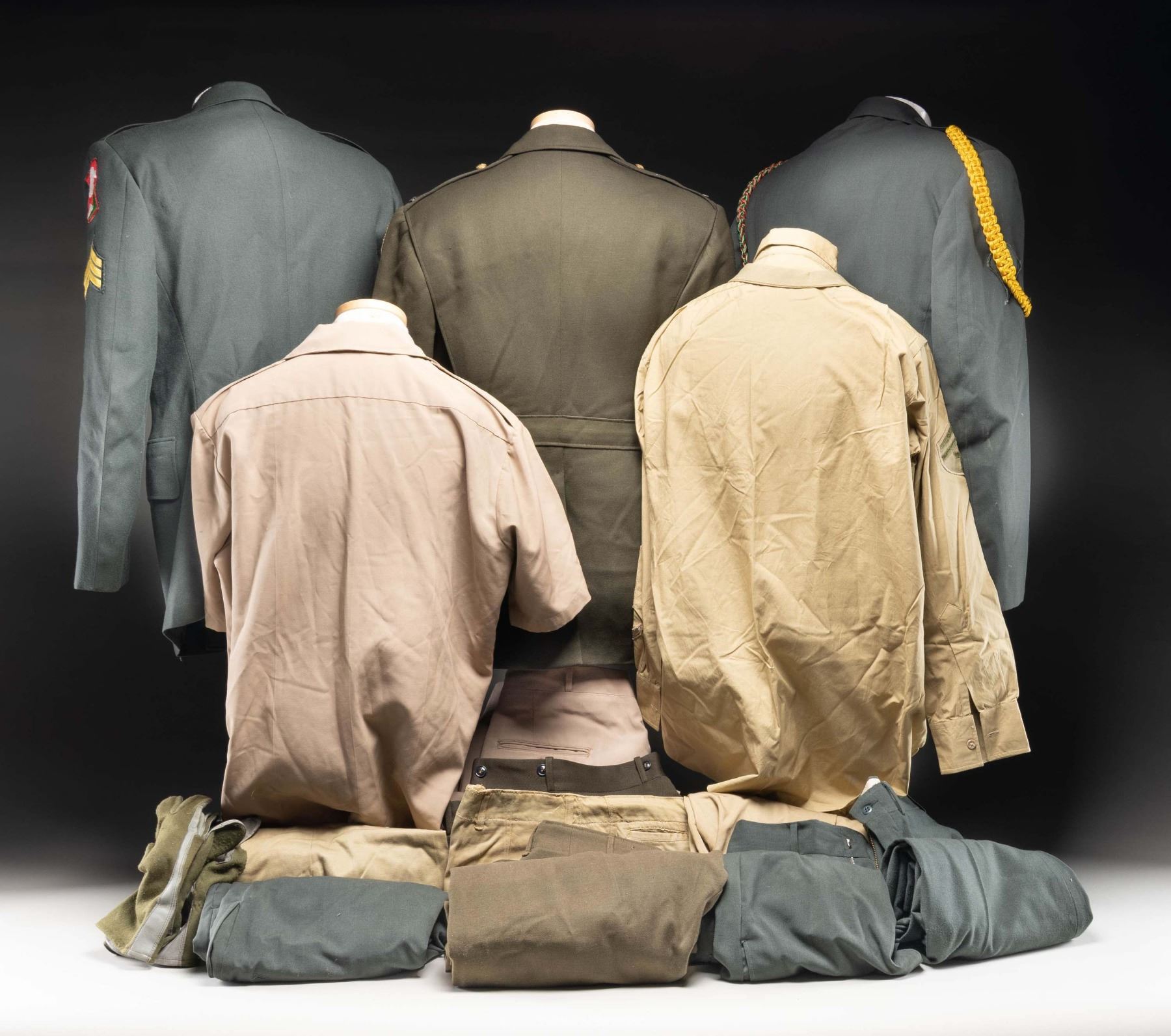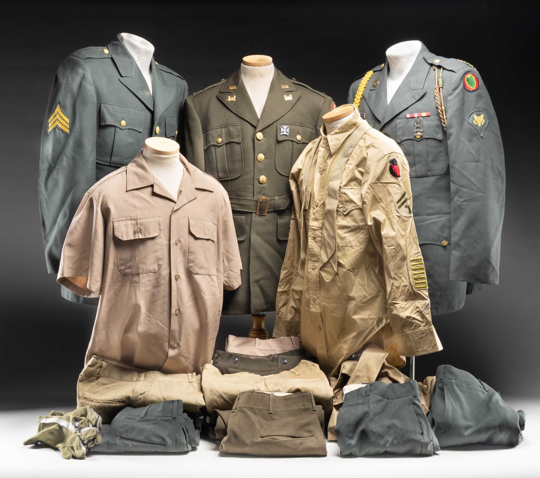 This group of military uniforms includes 1 Vietnam era dress coat and 2 pair of pants for a T-4 specialist with a red-green aiguilette and a gold aiguilette. The left shoulder has a patch for the 24th Infantry division. Uniform has Presidential Unit Citation with two leaves along with Good Conduct and National Defense. / 1 Vietnam era dress coat and 2 pair of pants for a sergeant with the left shoulder having a patch for the 70th Infantry division. / 1 WWII khaki shirt with only a ruptured duck applied. / 1 Khaki short sleeve dress shirt. / 1 Pair of khaki dress pants. / 2 Pair of khaki heavy cotton pants. / 1 WWII era khaki long sleeve dress shirt for a T-5 specialist of the 34th Infantry Division. / 1 WWII dark green dress coat and pants for a First Lieutenant of Engineers with an Army European Base Command patch on the left shoulder. / 3 Gloves. / 1 Khaki tie. CONDITION: all uniform show light wear and are in serviceable condition. (02-24056/BF). NON-GUN. $200-400.