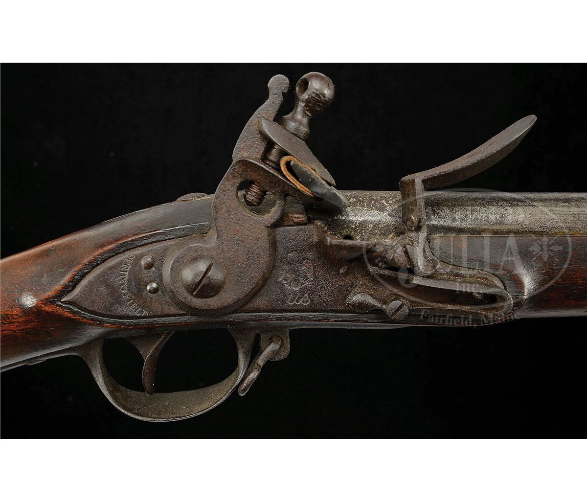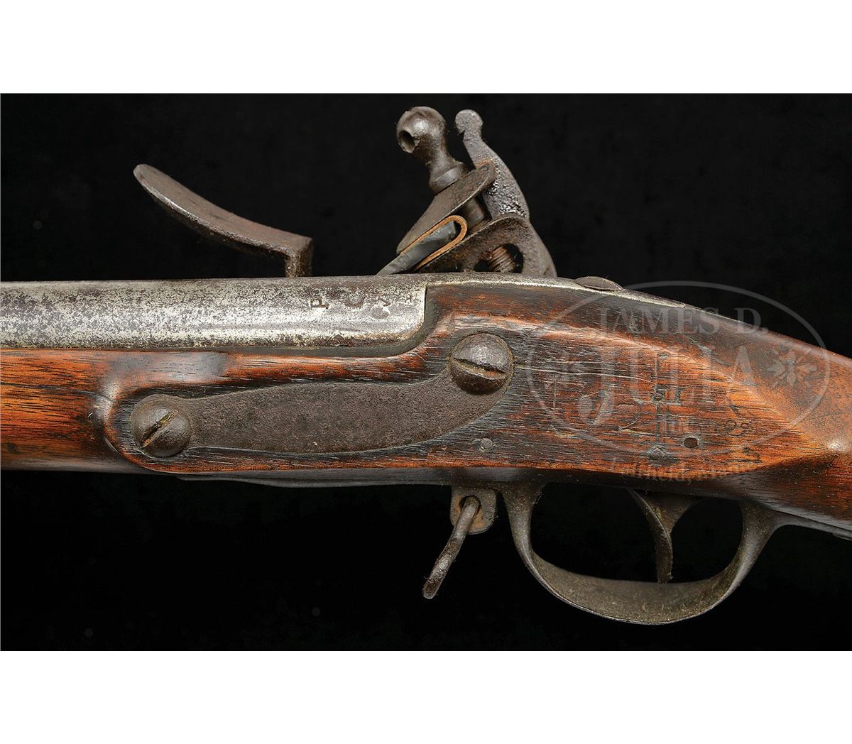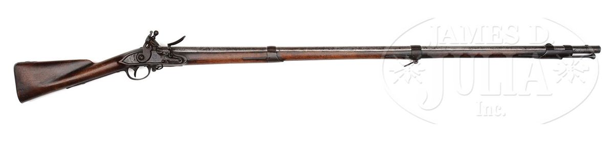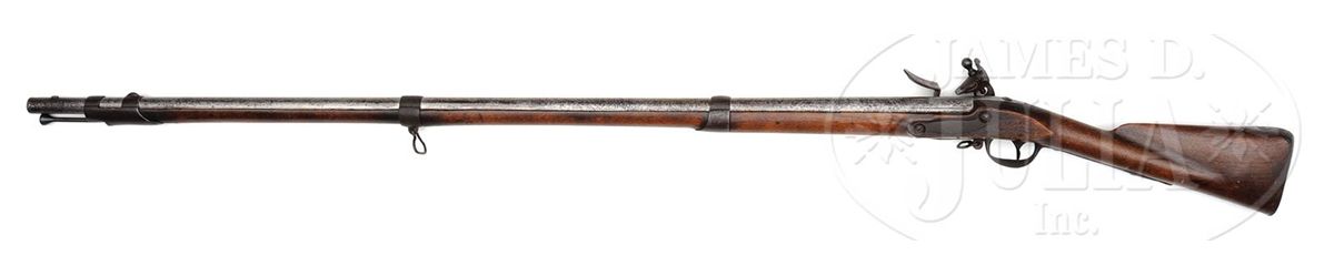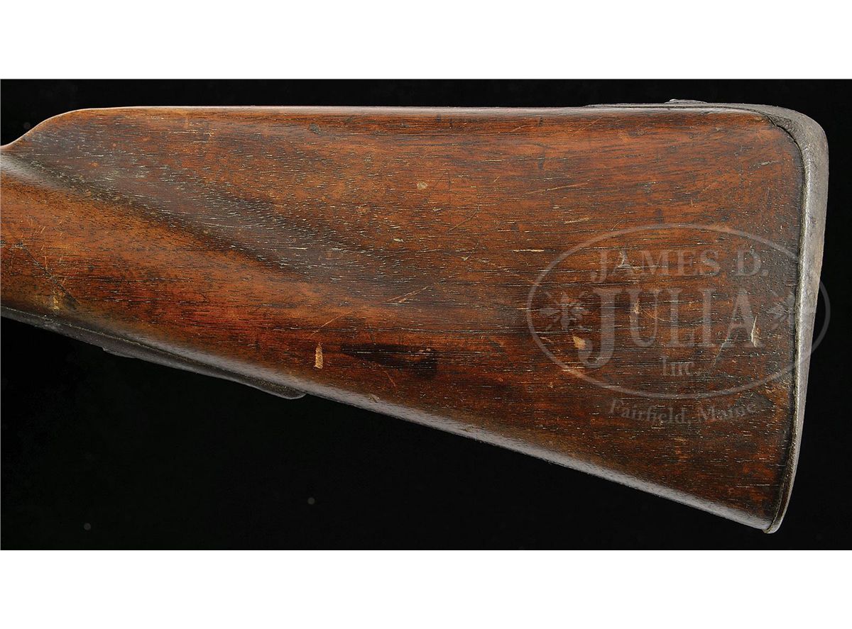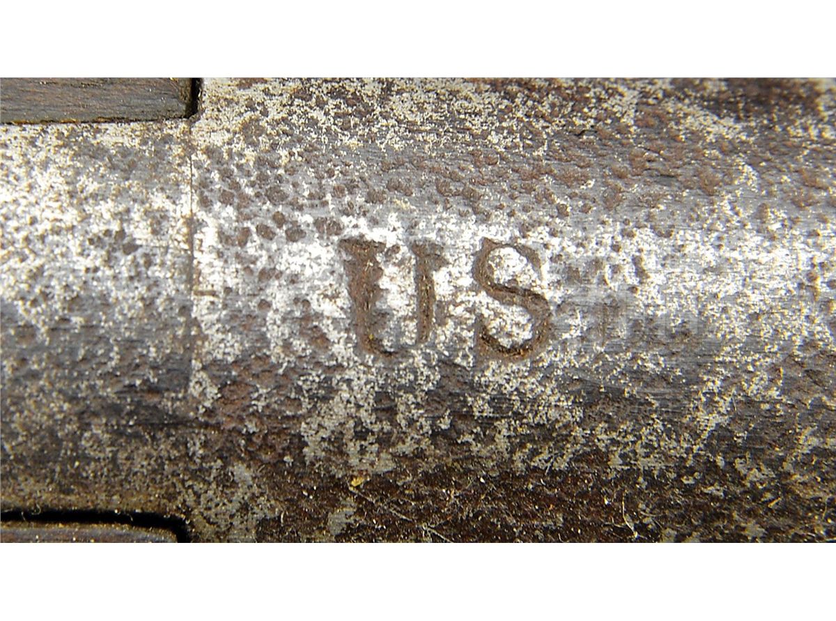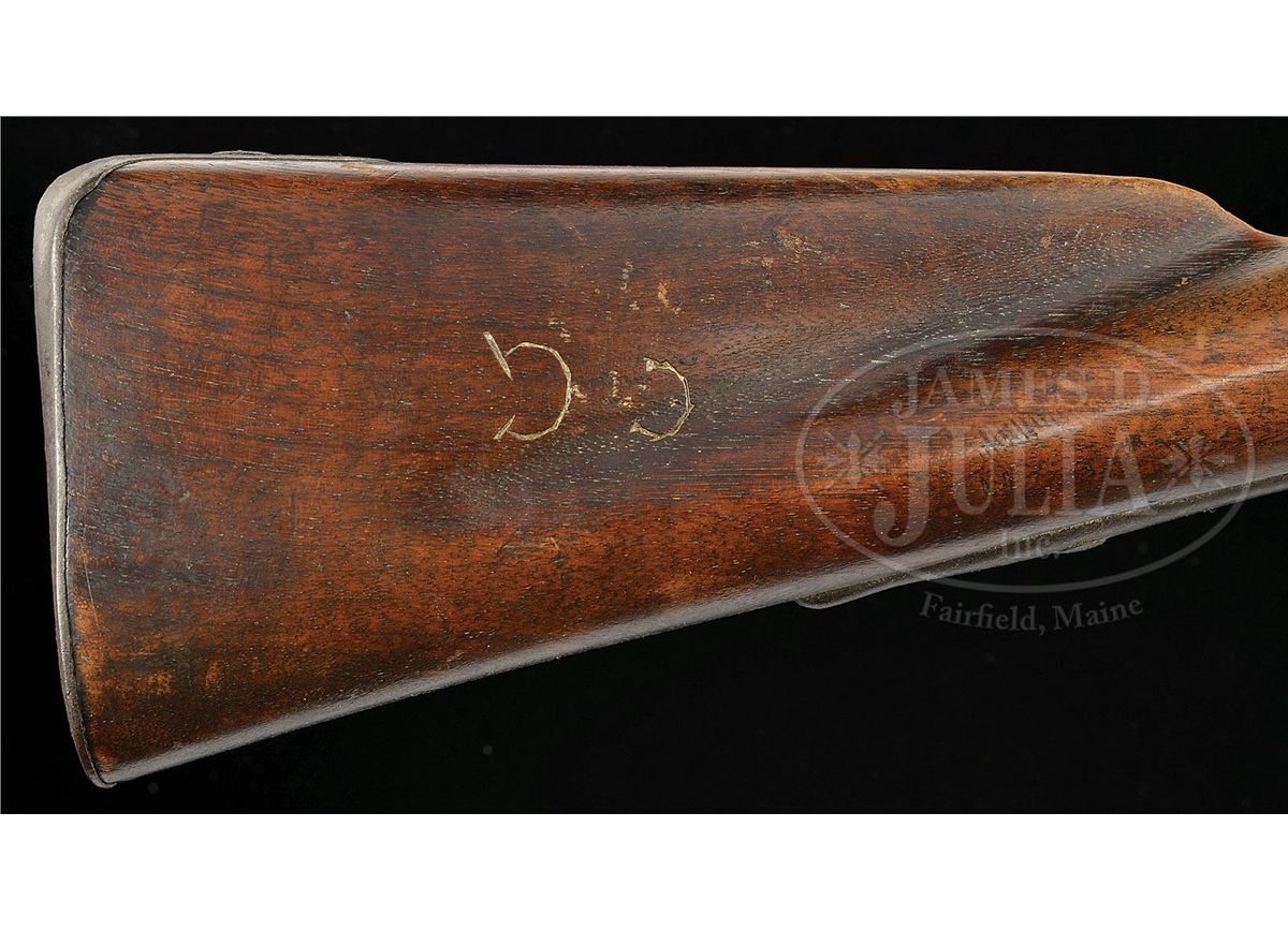 NSN. Cal .69 44 3/4" bbl w/ brass blade sight on the front barrel band, with a bayonet lug on top of the muzzle and "P/V" on the left side and "US" in the center of the breech. The undated lock is marked "SPRINGFIELD" in an arc behind the hammer and "eagle/ US" below the fenced flash pan. Smooth straight grip stock with deeply fluted comb is oil finished, with "US" inspectors mark and "31" behind sideplate and 3 barrel bands, button head ramrod, Trigger guard has long pointed finials at front and back. Flat buttplate marked "08". CONDITION: Generally very good. Lock work and appended metal parts are a pleasing even brown patina overall, showing no evidence of cleaning. Breech area is pitted. Lock markings are strong, the Eagle and "Springfield" are clearly visible. Stock is excellent retaining most of what appears to be orig finish, hand worn, a few cracks radiate from sideplate. Barrel may have been cleaned. Initials "CG" in right stock are recent. 4-49520 JWD44