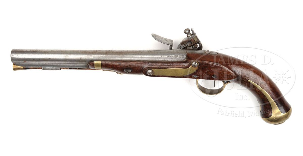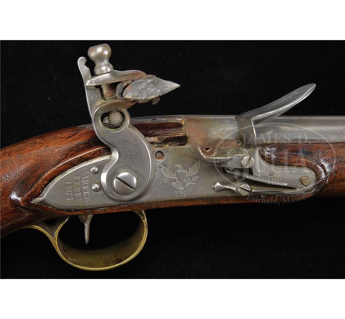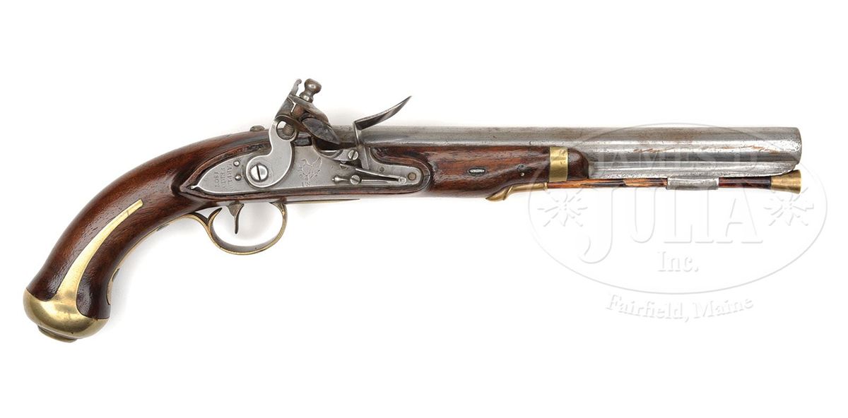 SN 692. Cal. 54. 10" rnd bbl, breech marked with raised eagle over "P" in a sunken oval behind a raised "US" in a sunken oval behind SN 692 (only top of 6 is visible). Lock is marked "HARPERS/FERRY/1807" in vertical arcs behind cock. Under the pan is a spread-winged eagle facing toward the cock over "US". The lock is reconverted to flint. Harpers Ferry furniture consisting of rear rammer pipe, trigger guard, buttcap and side plate all of correct pattern. The wood opposite the lock is unmarked, having been varnished at one time and the inspector's mark has been covered. Harper's Ferry pistols are amongst the most sought after U.S. single shot martial pistols and this piece is a nice representative example. CONDITION: Metal is in overall very good condition with evidence of having been cleaned at one time. The bbl key appears to be orig and the ramrod, a nice replacement with a worm on the entry end. Brass work has a nice yellow color, wood overall is dark with no major wood losses, nicks or dings. 4-48324 PAS45
