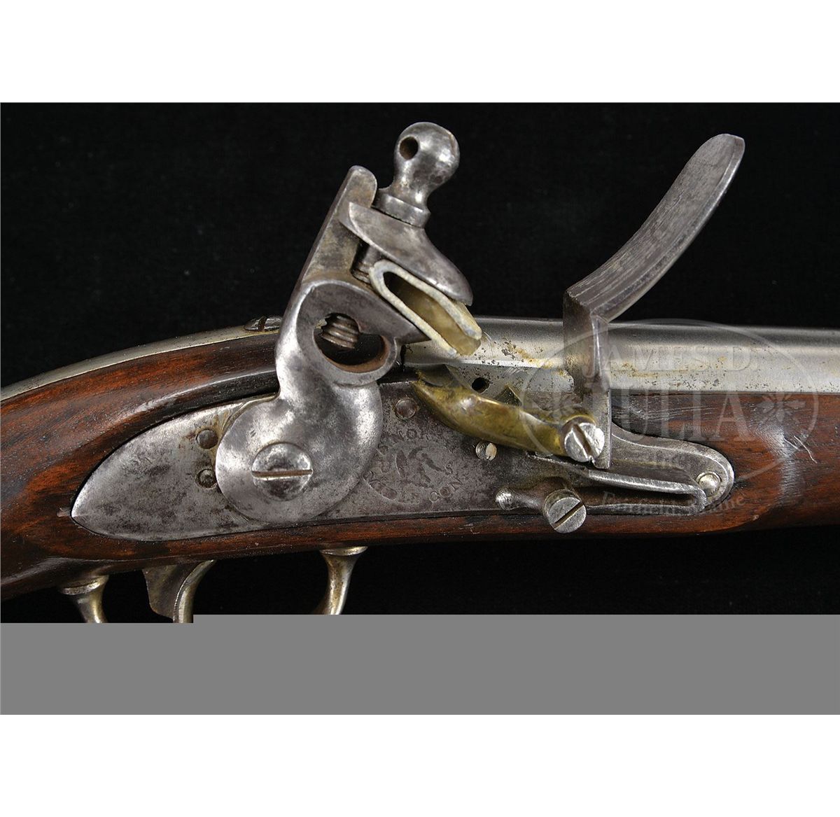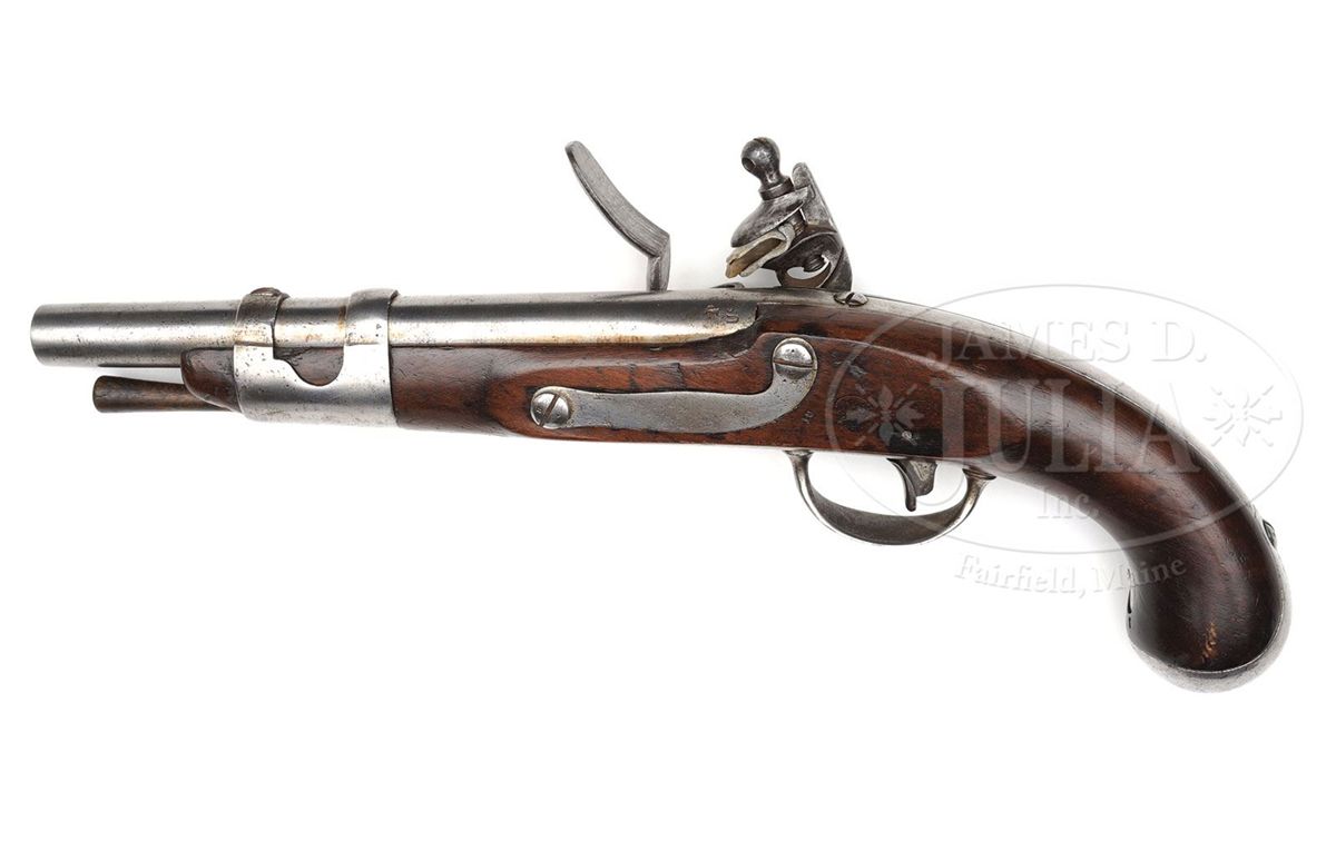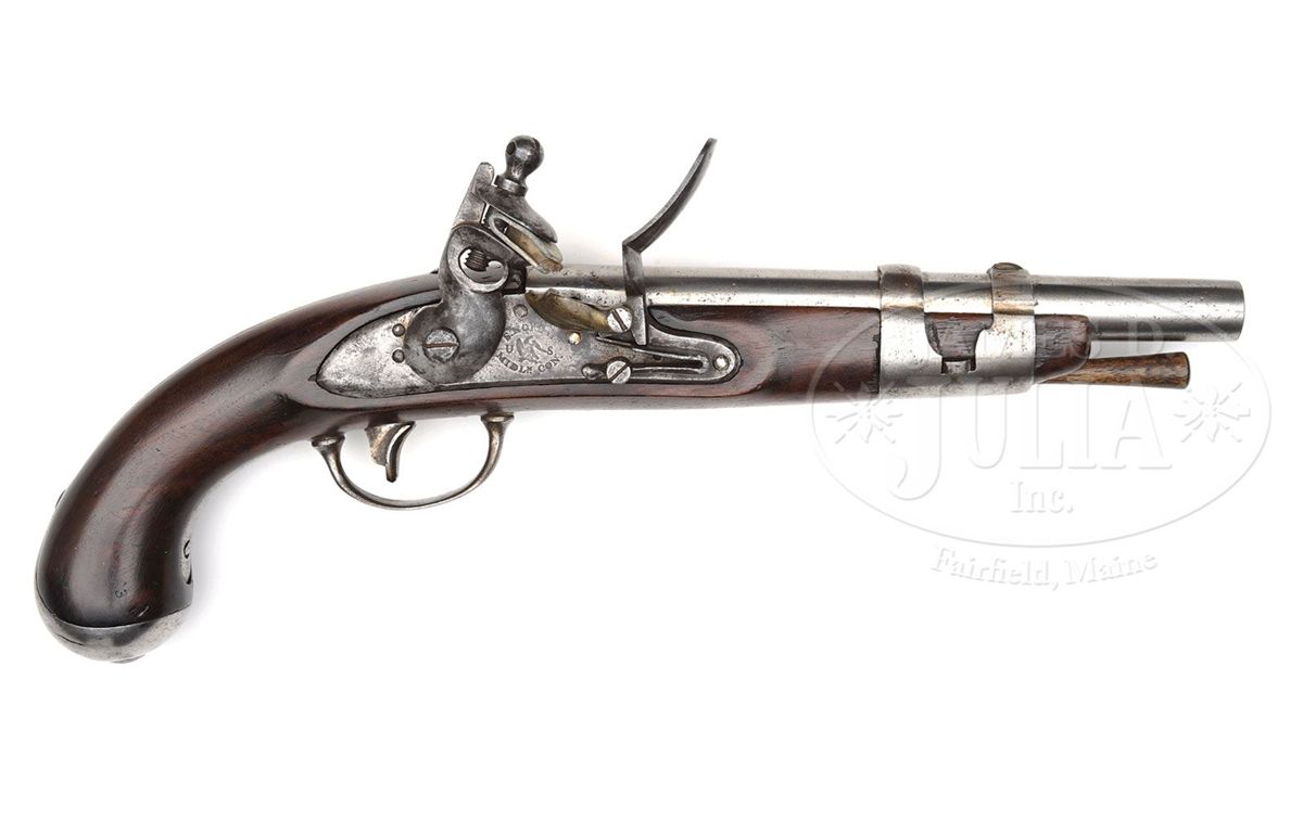 NSN. Cal. 54. 9-1/4" rnd bbl marked left side of breech "P" over "US". Bbl is original flint. Lock marked "S.North" over-arc, over "U" spread-winged eagle "S", over "MIDLtnCON" (earlier production) is under-arc. Lock is orig flint. Buttcap screw, bbl tang screw, and front band carry sub-inspector's stamp of "P", sideplate, lockscrews, and bbl tang carry inspector's mark "B". Inspector's stamp "LS" (Luther Sage) in circle opposite the lock in the wood is barely legible. PROVENANCE: See Guide to American Antique Firearms and Their Values, 1998, by Flayderman. Collection of Dr. Douglas Sirkin. CONDITION: Metal showing normal age with very slight pitting around touch hole. Ramrod is of the correct type. Overall wood is very good having a 1" long stress fracture originating at rear lock screw terminating at the bbl. Overall condition of wood and metal is smooth and overall very good plus condition. 4-49956 PAS50