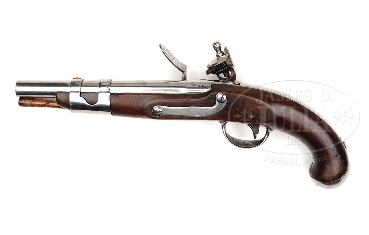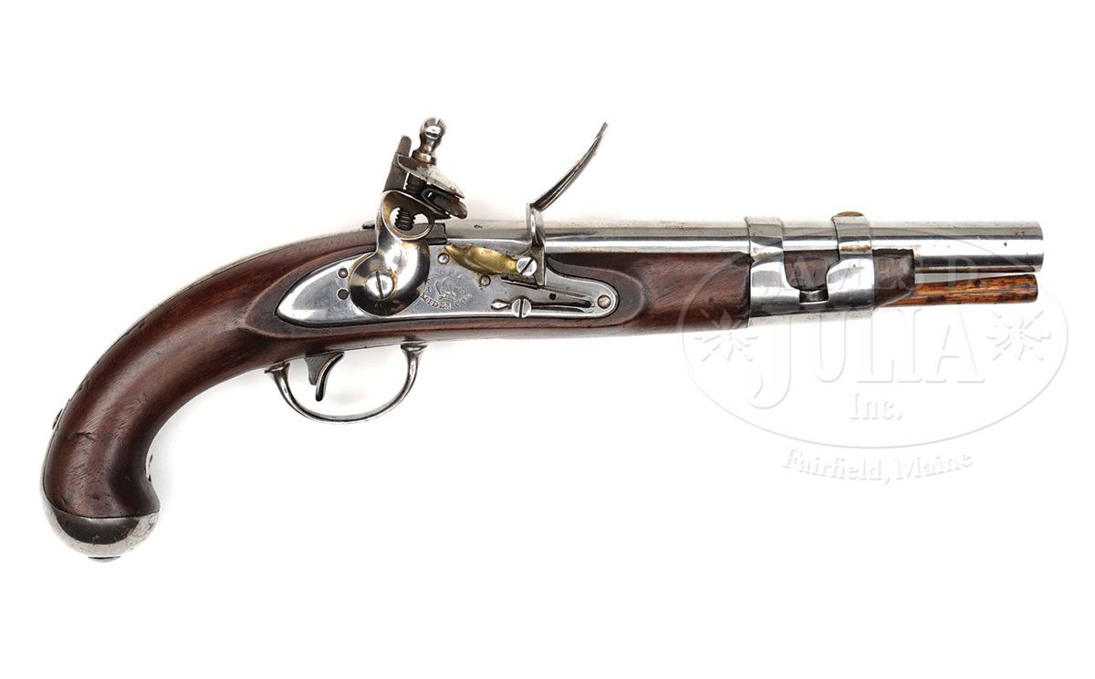 NSN. Cal. 54. 9-1/4" rnd bbl marked left side of breech "P" over "US". Bbl is original flint. Lock marked "S.North" over-arc, over "U" spread-winged eagle "S", over "MIDLtnCON" (earlier production) in under-arc. Lock is orig flint. Buttcap screw, bbl tang screw, sideplate, both lock screws, and front band carry sub-inspector's stamp of "Q". Script inspector's stamp "JN" opposite the lock in the wood is clearly legible. PROVENANCE: See Guide to American Antique Firearms and Their Values, 1998, by Flayderman. Collection of Dr. Douglas Sirkin. CONDITION: Metal has been cleaned to a bright polish. Ramrod is of the correct type. Overall condition of wood and metal is smooth and in very good to fine condition. 4-49743 PAS51