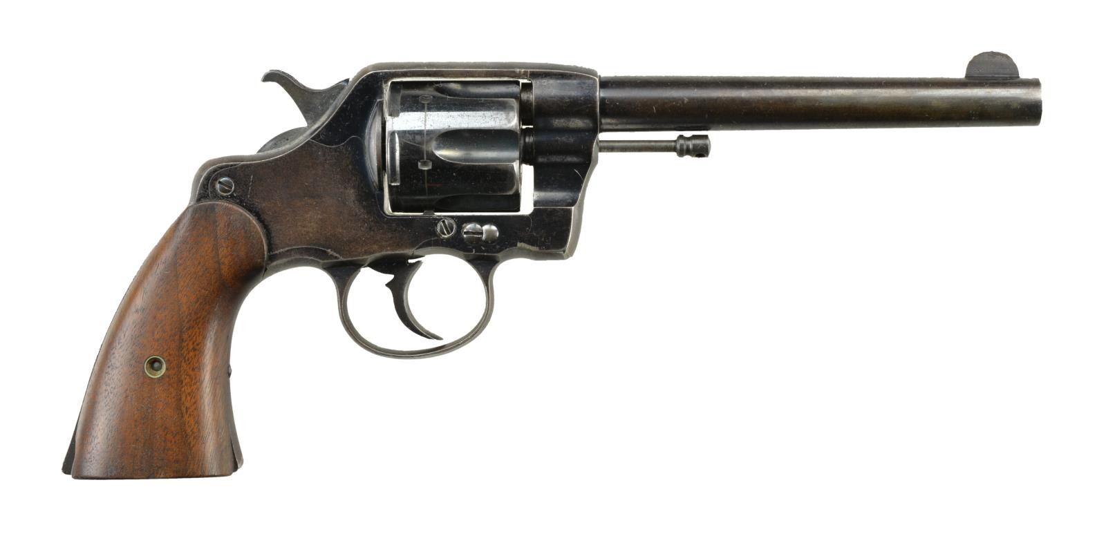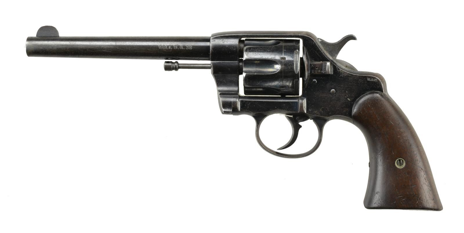 Cal. 38 Colt. S# 152064. Bbl. 6". Mfg. 1901 Rounded notch front sight. Back of cyl., left grip panel & right rear of frame are all marked w/ "RAC" inspector's stamp. Cyl. latch, crane & frame all have matching numbers. Smooth walnut grips. Grip panels are unnumbered & right panel is likely a replacement. Right grip panel has a 1901 date & faint inspector's cartouche. CONDITION: right grip panel has 1/2" chip at rear, grips otherwise show a couple dents, dings & handling marks. Metal retains 30% original blue w/ overall thinning to gray, scattered oxidation, a few scratches & small patches of dings. Good bore w/ some scattered oxidation & light pitting. (22-4404/MJC). CURIO. $300-500.
