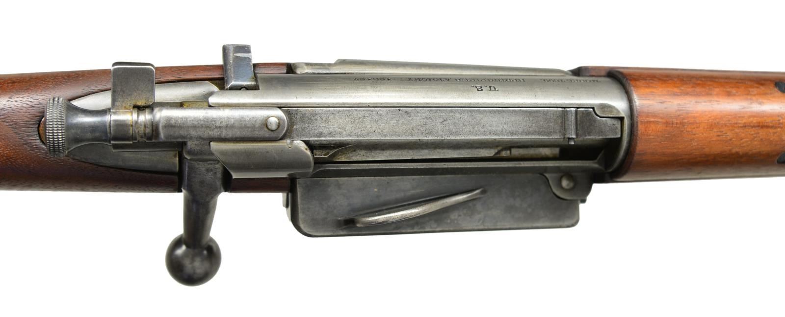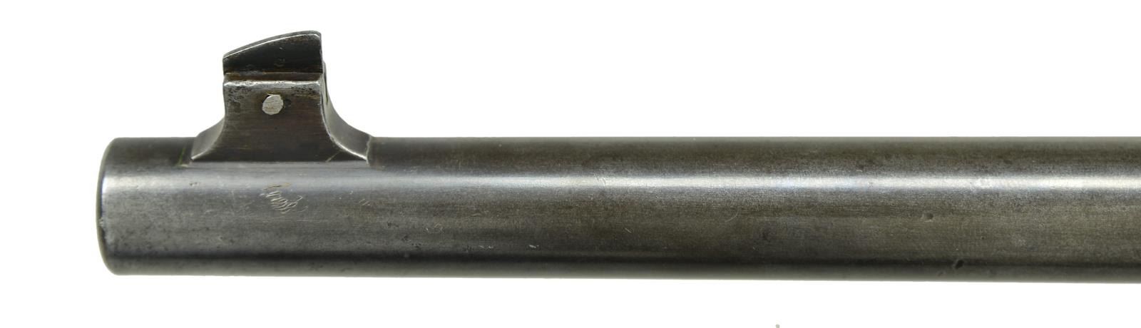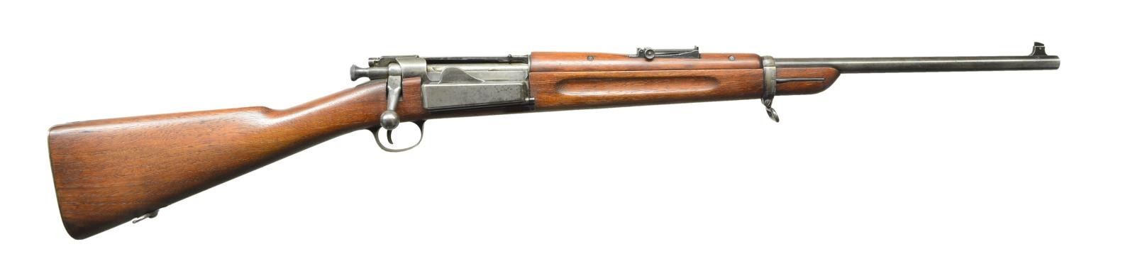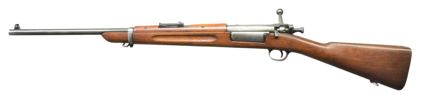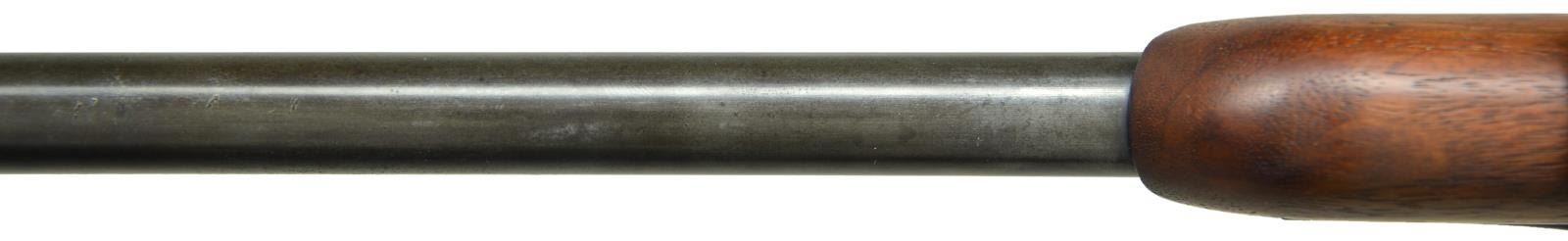 Cal. 30-40 Krag. S# 420427. Standard configuration with 22" bbl. fitted with 1902 type rear sight. Standard Krag action with usual flared cocking knob has model, Springfield and serial number markings on left side. American walnut stock with steel buttplate having trap fastens to bbl. with one band. No inspector’s initials are found on stock. CONDITION: good, metal parts retaining about 30% traces of original blue, mostly with light cleaning to silver gray. Stock with old oil refinish has open grain. Shiny bore shows some scattered light pitting. Mechanically good. (22-3616/MGM). CURIO. $800-1,100.