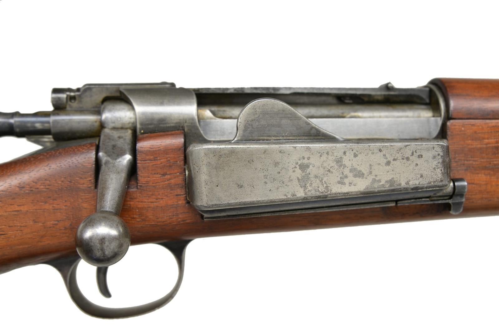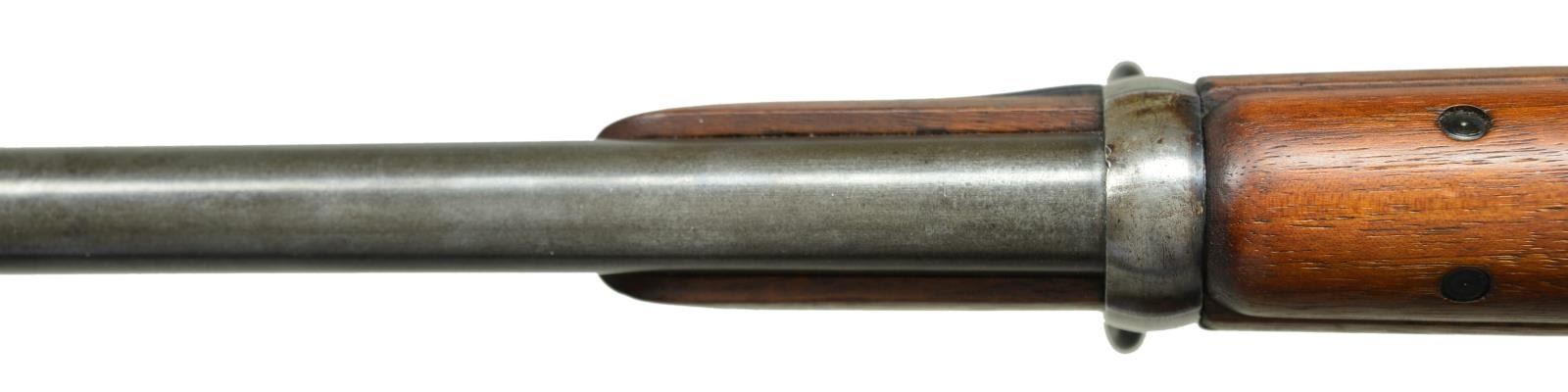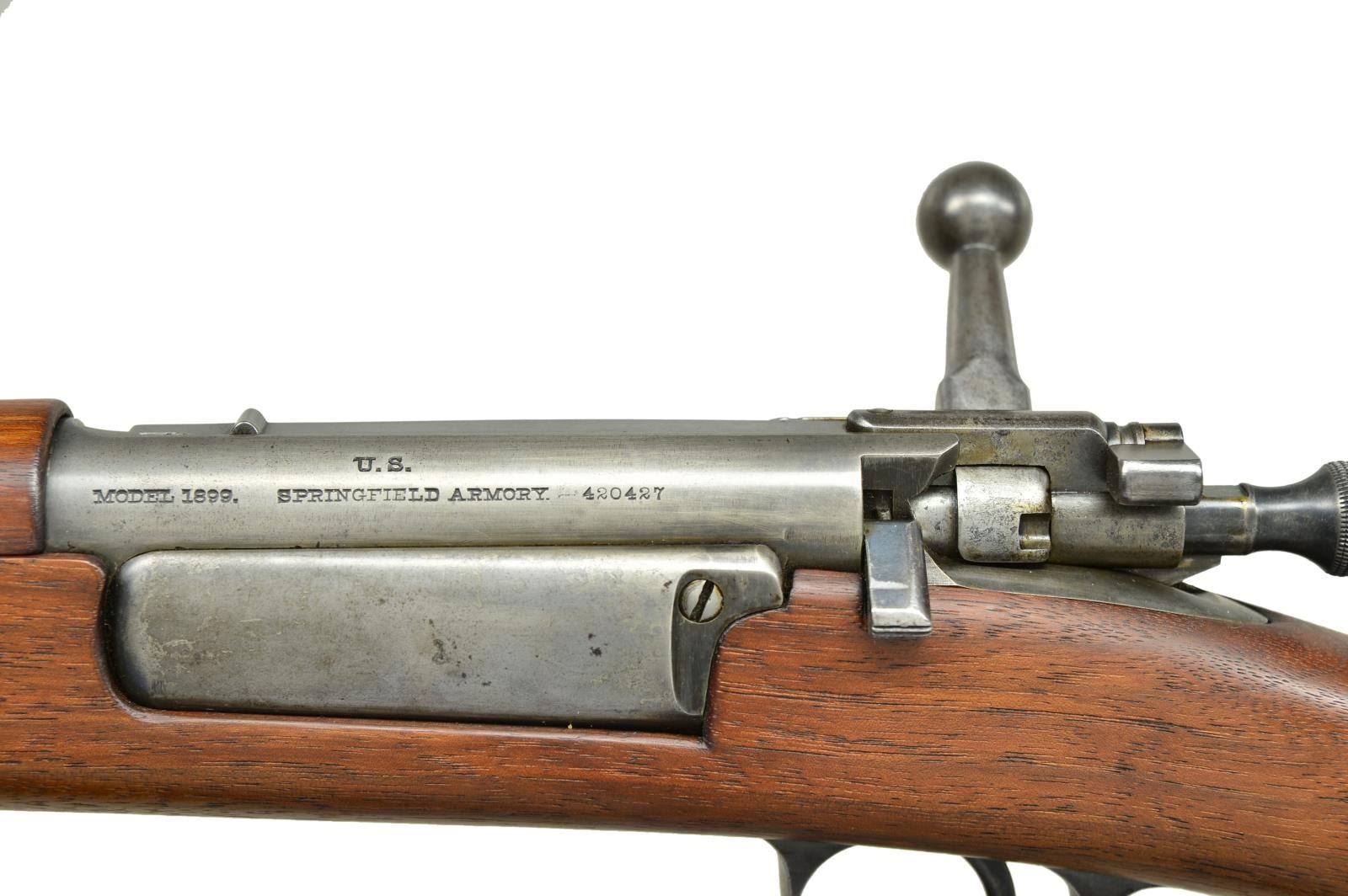 Cal. 30-40 Krag. S# 420427. Standard configuration with 22" bbl. fitted with 1902 type rear sight. Standard Krag action with usual flared cocking knob has model, Springfield and serial number markings on left side. American walnut stock with steel buttplate having trap fastens to bbl. with one band. No inspector’s initials are found on stock. CONDITION: good, metal parts retaining about 30% traces of original blue, mostly with light cleaning to silver gray. Stock with old oil refinish has open grain. Shiny bore shows some scattered light pitting. Mechanically good. (22-3616/MGM). CURIO. $800-1,100.