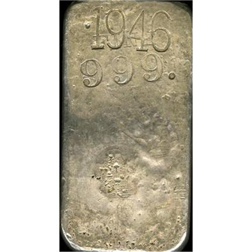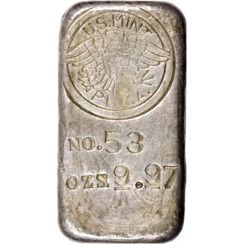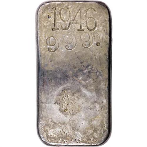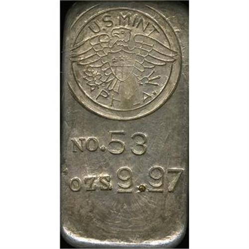 <B>1946 U.S. MS Mint Philadelphia Silver Ingot. 9.97 Ounces.</B></I> 1946 Philadelphia Mint silver ingot. The top side has the circular imprint of the Mint, followed by NO. 53 / OZS 9.97. The top of the back side reads: 1946 / 999. The top side has 10 imprinted. Gray-toned silver. Measures: 34 x 64 mm.<BR><BR><b>Shipping:</b> Coins & Currency (<a target="_blank" href="http://www.heritageauctions.com/common/shipping.php">view shipping information</a>)