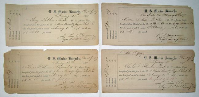 Brooklyn, New York...., 1878. Lot of 4, U.S. Marine transfer documents and transfer paperwork for 4 soldiers transferred into the Marine Barracks, League Island, Pennsylvania, with payment rates of $13 & $15 per month. All were signed by U.S. Marine Corp. Majors or Lieutenants, Deserves further research since it is so close to the end of the Civil War, Items are in Fine condition with toning and edge faults. (4). Sold "AS IS" no returns accepted.
