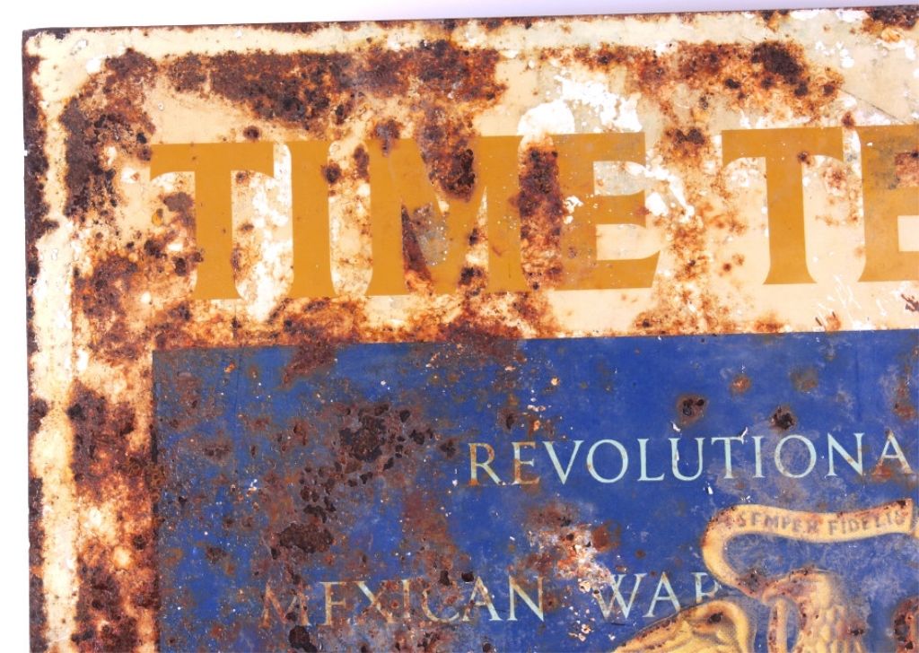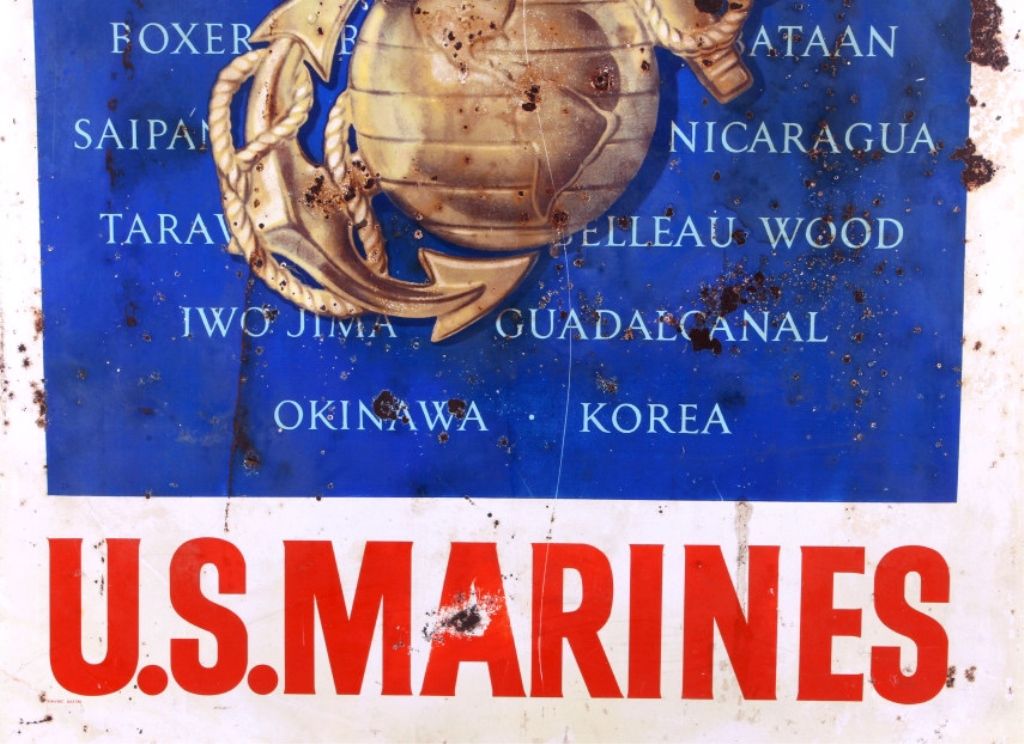 This is a U.S. Marine Corps recruiting sign. This is a double sided sign. It shows the Marine Corps logo consisting of the globe, eagle, and anchor. This sign would have been used at a recruiting office to encourage young men and women to enlist. The sign is in fair condition, showing some rust and wear. It measures 30" x 39.5".