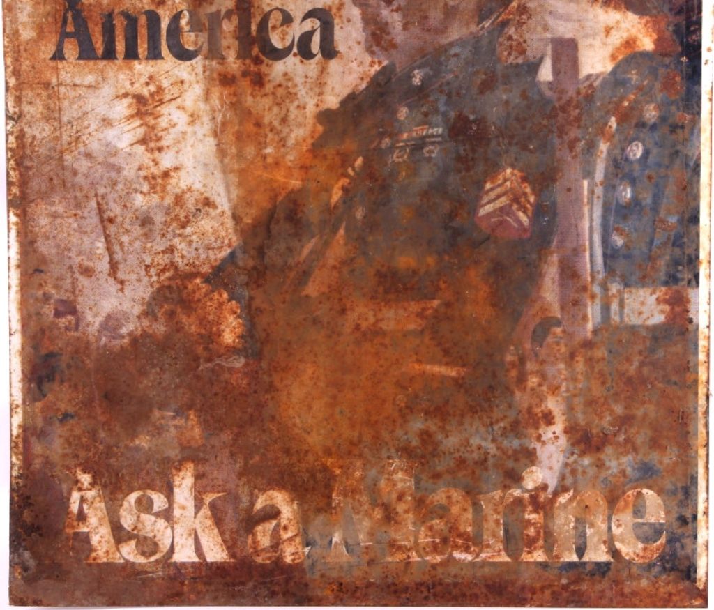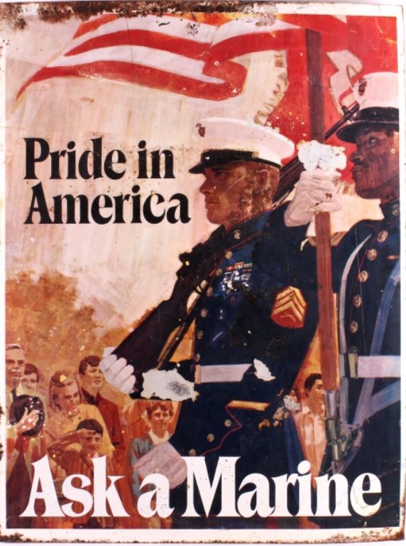This is a U.S. Marine Corps recruiting sign. This is a double sided sign. It shows two Marine Corps soldiers. This sign would have been used at a recruiting office to encourage young men and women to enlist. The sign is in fair condition, showing some rust and wear. It measures 30" x 39.5".