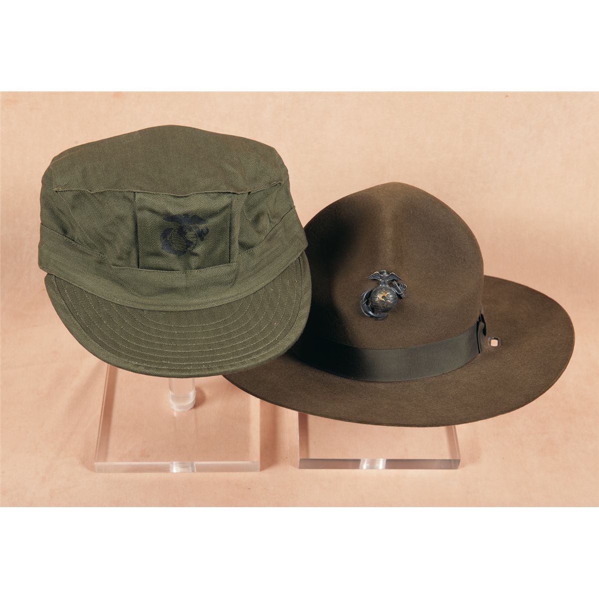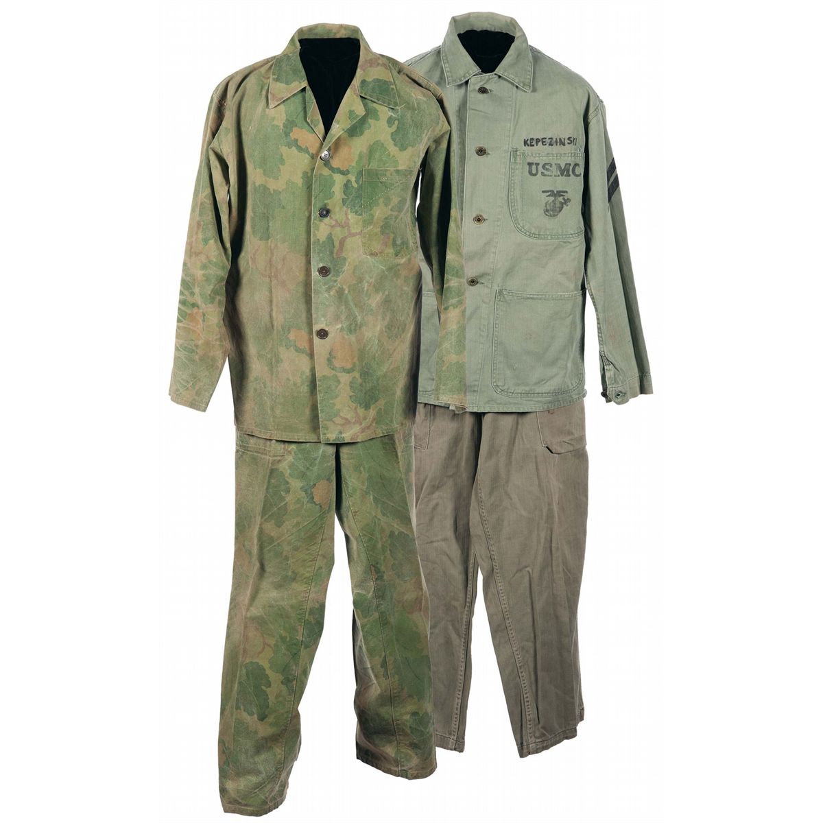 1) USMC campaign style hat with bronze eagle/anchor insignia, size 7 1/8. 2) Field made camouflage trousers (green jungle camouflage on the outside beneath tan camouflage on the inside) with a fly closure with plain buttons, two side pockets and one pocket on the back. 3) Field made camouflage shirt (green jungle camouflage on the outside and beach tan camouflage on the inside) featuring plain buttons and a left breast pocket. 4) Field cap size small. 5) WWII HBT Green corporal shirt with "KEPEZINSKI" marked above the left pocket featuring USMC insignia, corporal chevrons stenciled on both shoulders. 6) Green HBT trousers with the name Kepezinski on the inside.