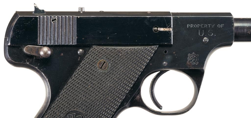There were approximately 14,000 of these pistols manufactured for the U.S. government between 1942 and 1943. Has a fixed front sight and a drift adjustable rear sight. Has the standard markings on the left side of the frame and slide with "PROPERTY OF/ U.S." over the crossed cannon inspection mark on the right side. The top of the barrel is marked "PROPERTY OF U.S.". Fitted with checkered black plastic grips with "HS" in the center.