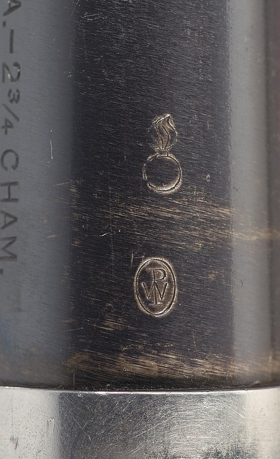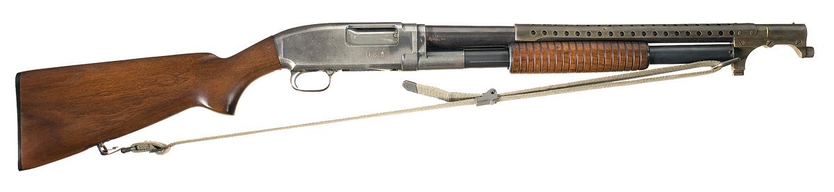 This shotgun has the high polish blue finish on the receiver, barrel and 'four hole' handguard/bayonet lug. The walnut stock and grooved slide handle are oil finished. The black hard rubber buttplate is checkered and has the Winchester trademark in a circle in the center. The right side of the receiver is marked with "U.S." followed by the Ordnance 'Shell and Flame' insignia below the ejection port. A 'Shell and Flame' Ordnance proofmark is stamped on the top of the barrel just in front of the receiver. The left side of the stock is stamped with the ordnance final inspection marks "G.H.D." in a rectangle with a small Ordnance Corps crossed cannons escutcheon immediately below it. The Winchester oval proof is stamped on the top of the receiver and on the top of the barrel at the breech. The left side of the barrel is marked with the standard markings, model designation and bore above "CYL". The factory markings are partially covered by the handguard. The serial number is located on the underside of the receiver and the magazine tube. Winchester Model 12 Trench Guns were used extensively by the Marine Corps in the Pacific Theater during WWII. The WWII production Model 12 Trench Guns remained in the military inventory until the 1990s. Complete with an original green canvas sling.
