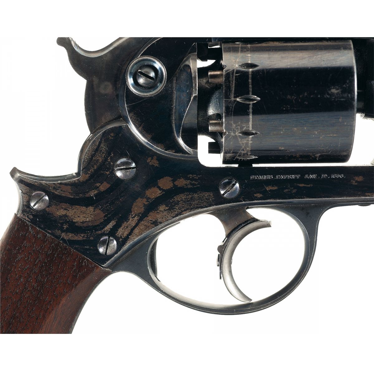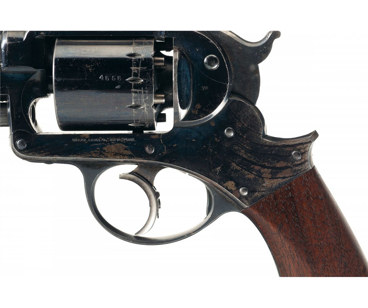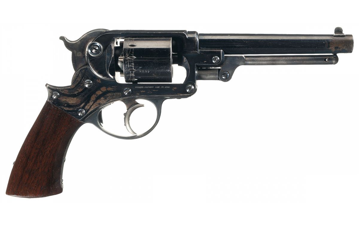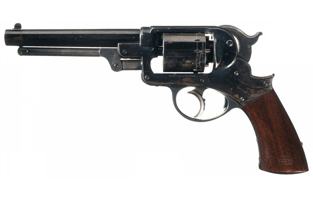 Manufactured during the late 1850s and early 1860s, Starr Revolvers saw combat use in the Civil War as Cavalry sidearms, exposing them to the harsh conditions of warfare. Blade and hammer notch sights with "STARR. ARMS. Co. NEW. YORK." on the left side of the frame and "STARR'S PATENT JAN. 15, 1856." on the right side. Matching numbers are present on the barrel lug, cylinder, hammer and frame, with "W" inspector marks on several parts and an inverted "R.K.K.W." cartouche on the left side of the grip.