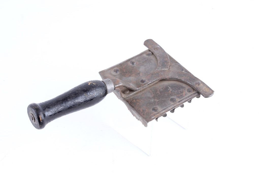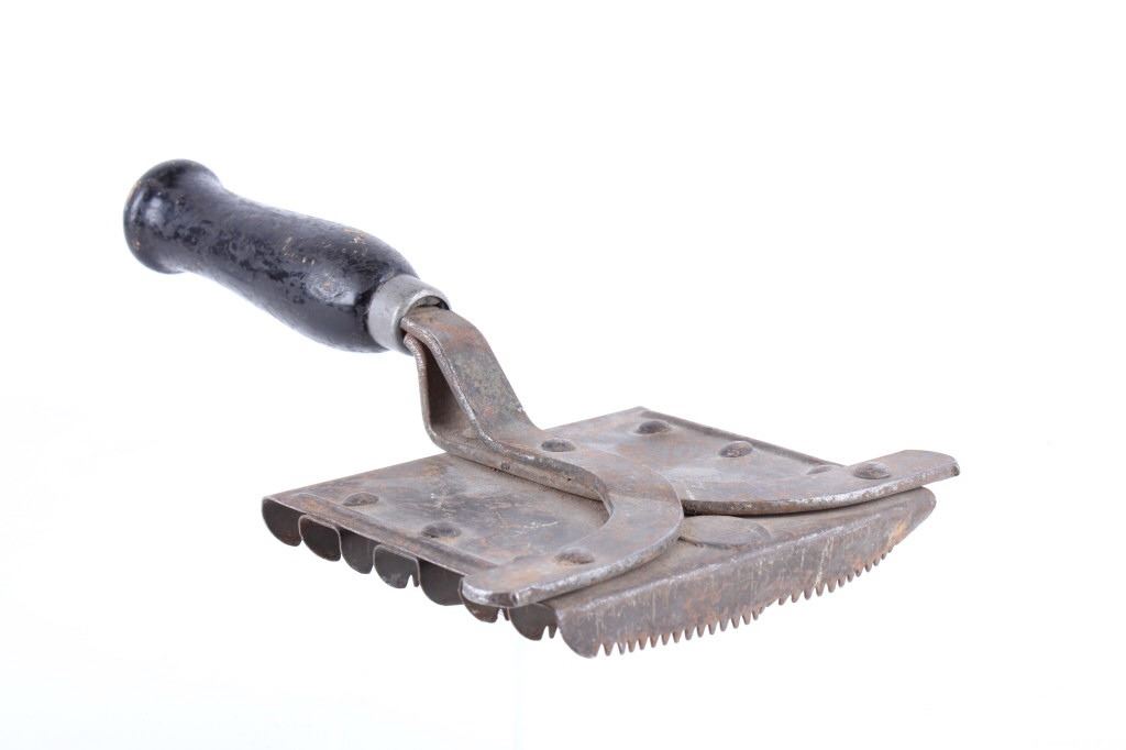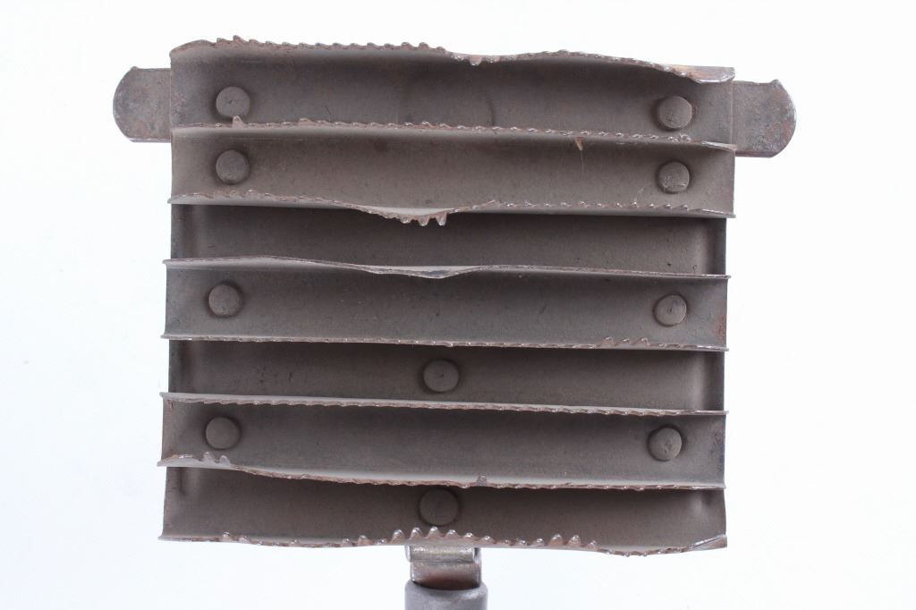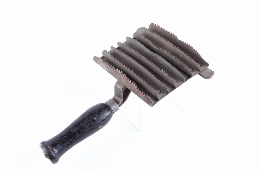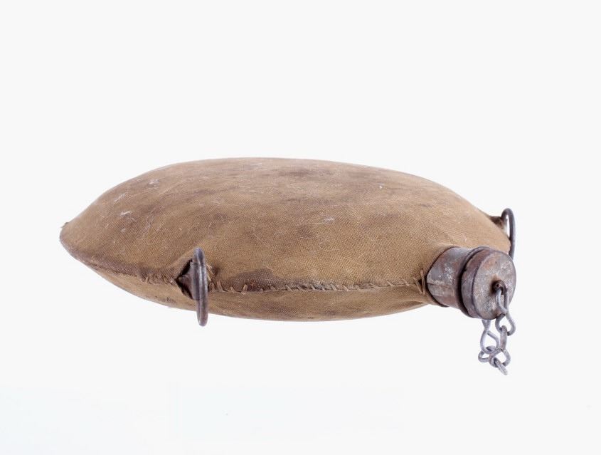 For your consideration is this U.S. Military Cavalry issued canteen and curry comb circa 1860-1920's. The canteen shows design closer to WWI era 1915's with a cork top that is chained to the frame of the canteen and clothed in green canvas. The curry comb shows a slotted design and shows a 'Bluegrass' stamp on the back top of the comb; this comb would have been used to care for the cavalrymen's horse before and after battle or patrol, and the square design would make it easier to store and access with the style of equipment carries of the day. The condition of this issued canteen and curry comb is fair the canteen shows its age and wear consistent with that age and the comb shows good usable condition with very little oxidation. The measurements of this of of the canteen are 8 1/2" x 7 1/2" and the curry comb measures 8 3/4" x 5 1/2" x 2 1/2".