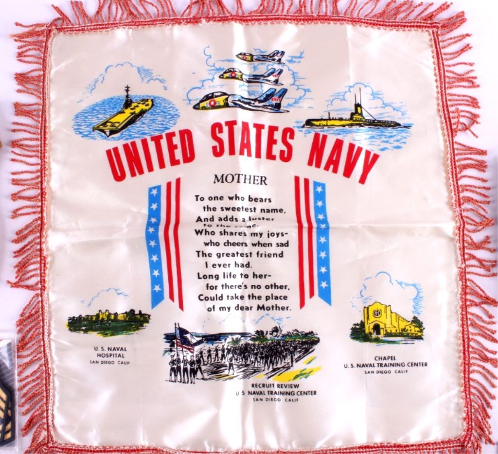 This is a collection of U.S. military items. Included are several patches, pins, medals, dog tags, plaques, and a pillow case. There are pieces in this collection from the Army, Air Force, Marine Corps, and Navy. All the items are in good condition.