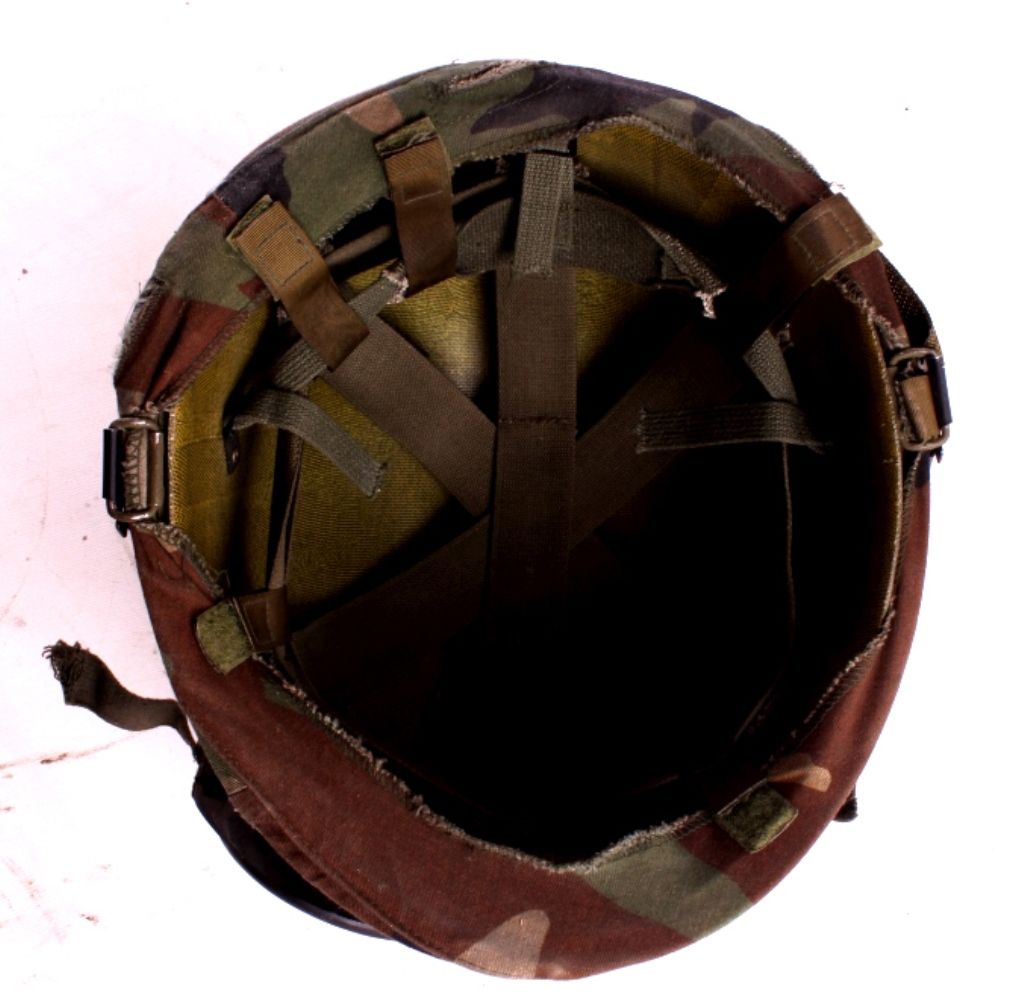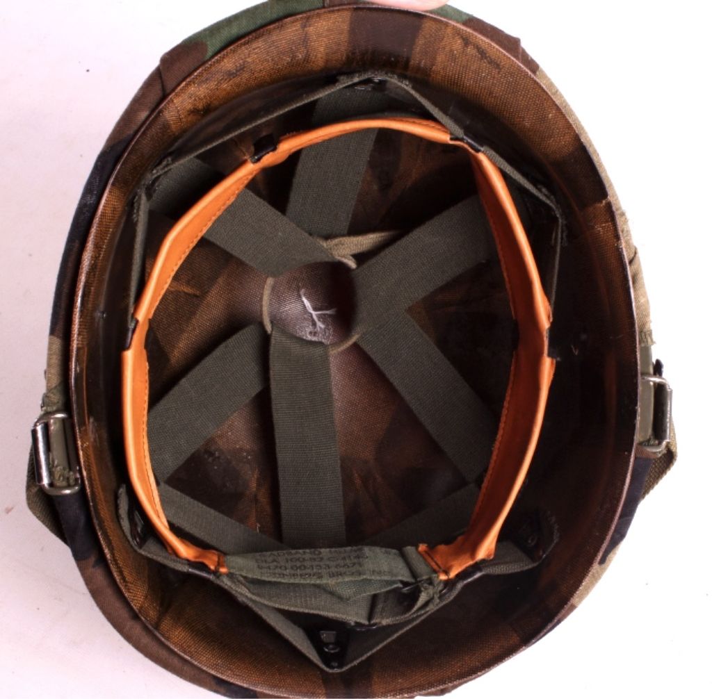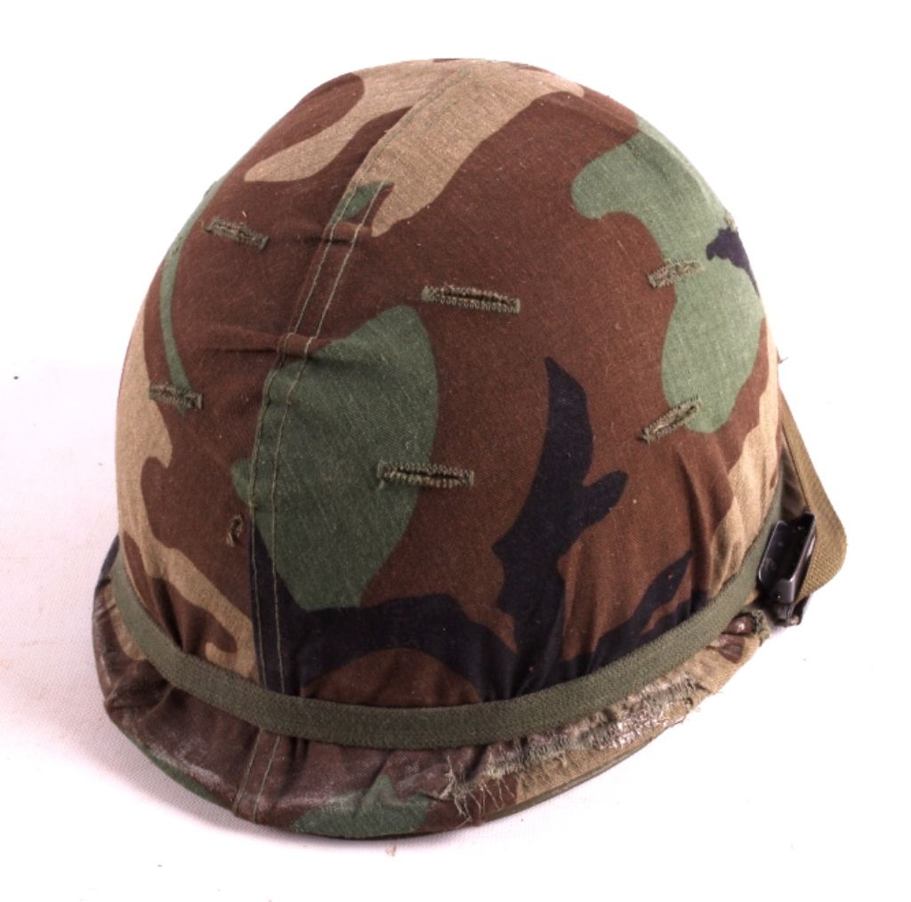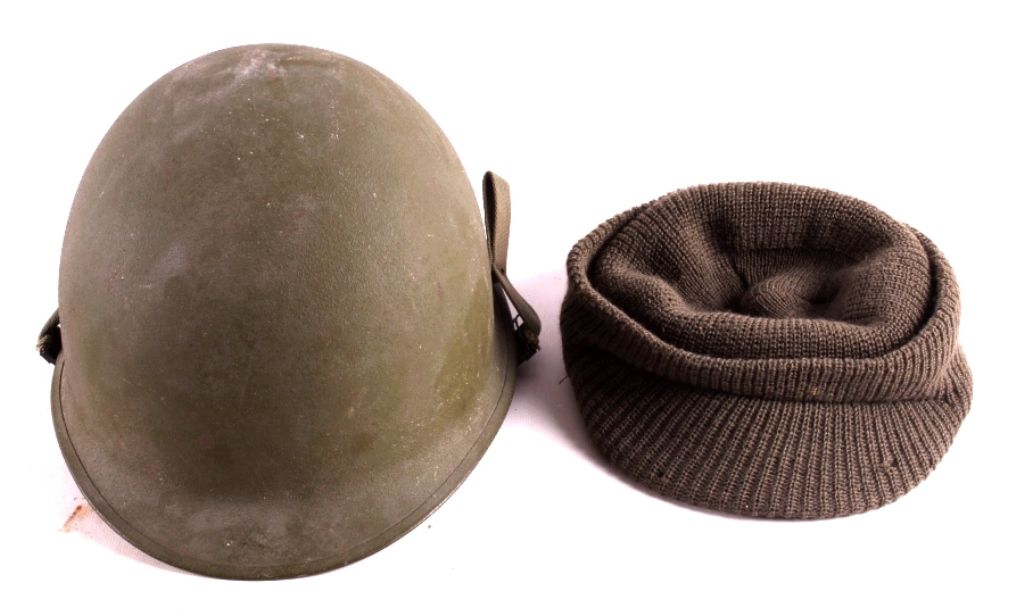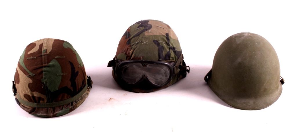 This is a collection of three U.S. military combat helmets. Each of the helmets has a liner. One has an additional wool cap. All the combat helmets are in good condition.