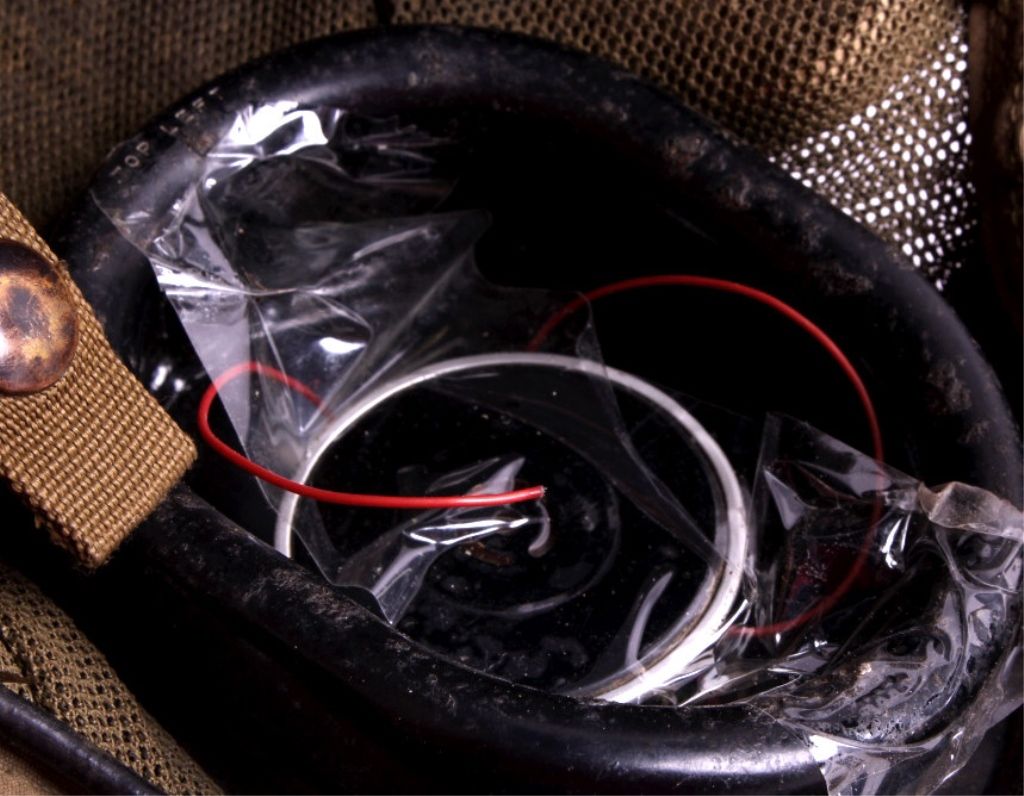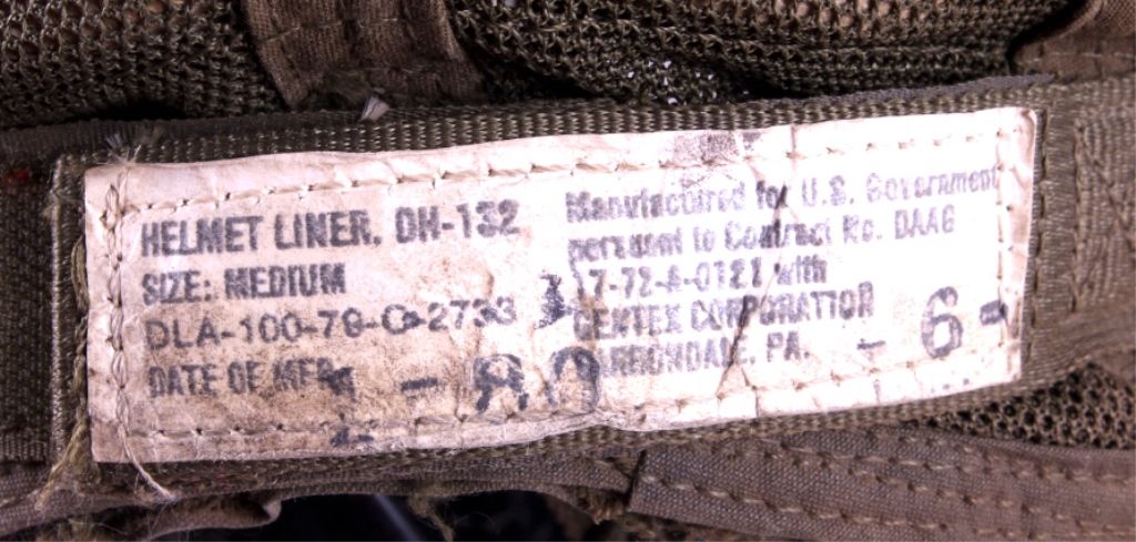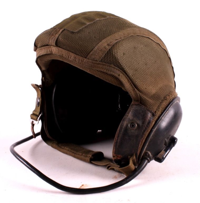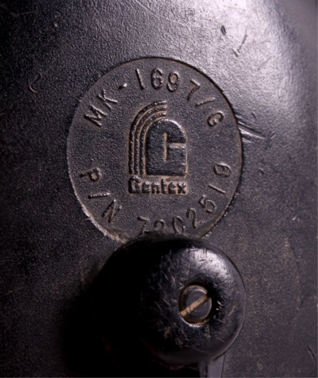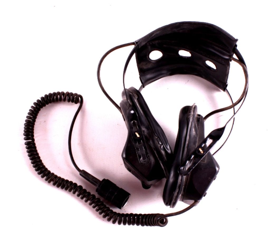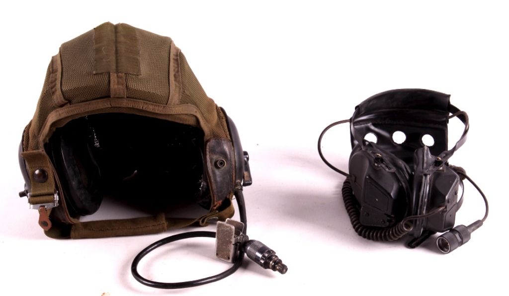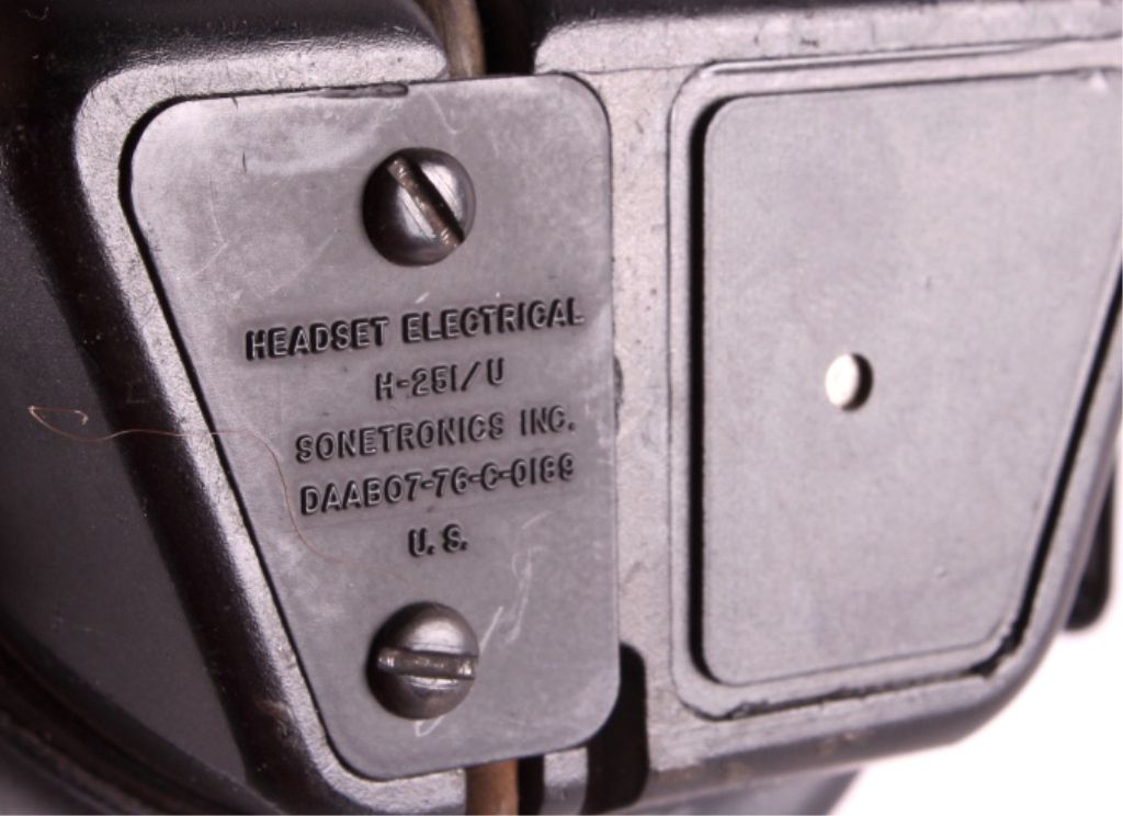 This is a pair of U.S. military communications headsets. One headset is contained in a helmet liner. It is marked "Gentex". One of the ear pieces needs to be repaired. The other headset is marked "Sonetronics". It is in good condition.