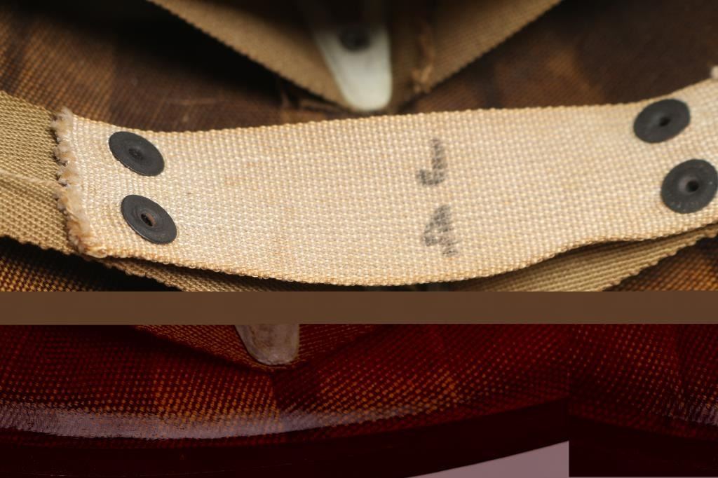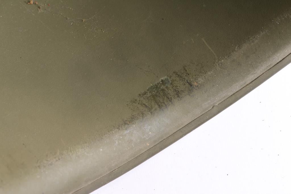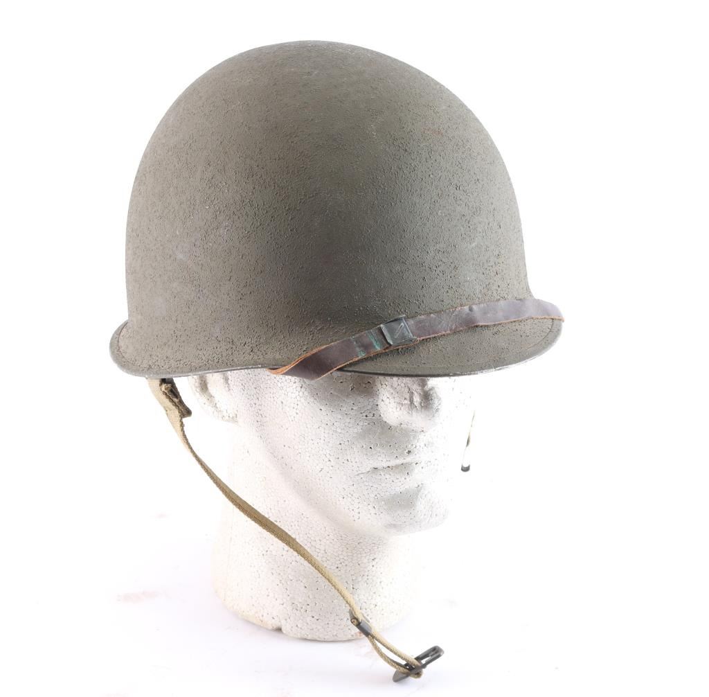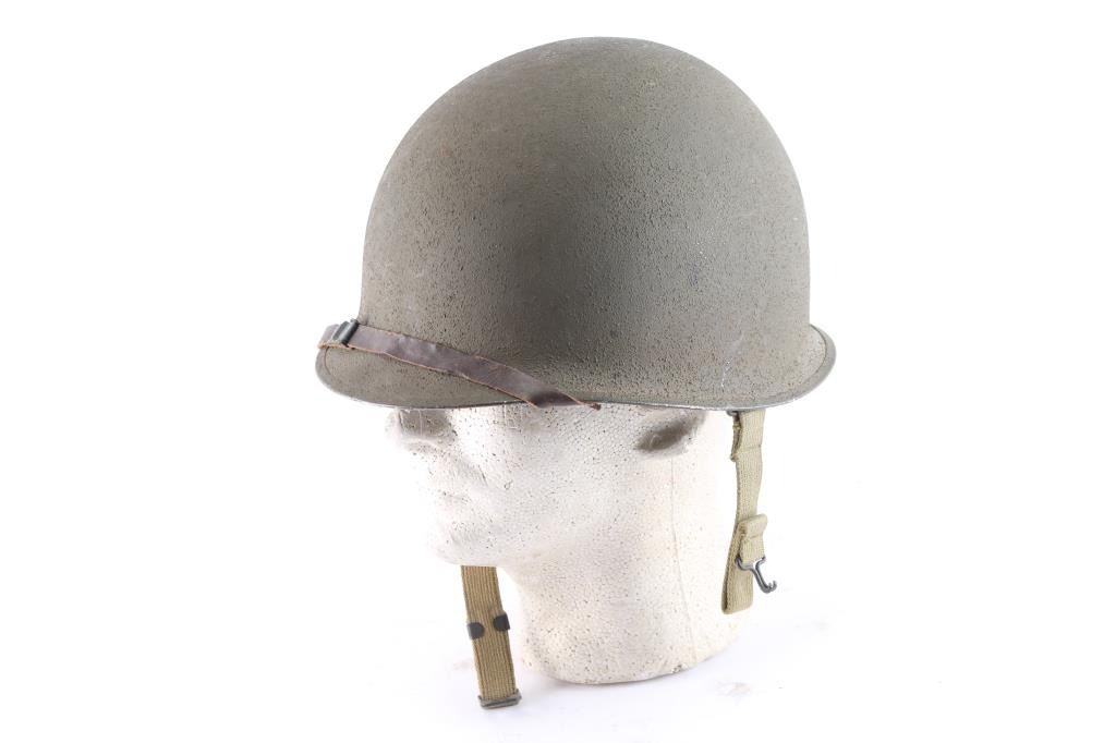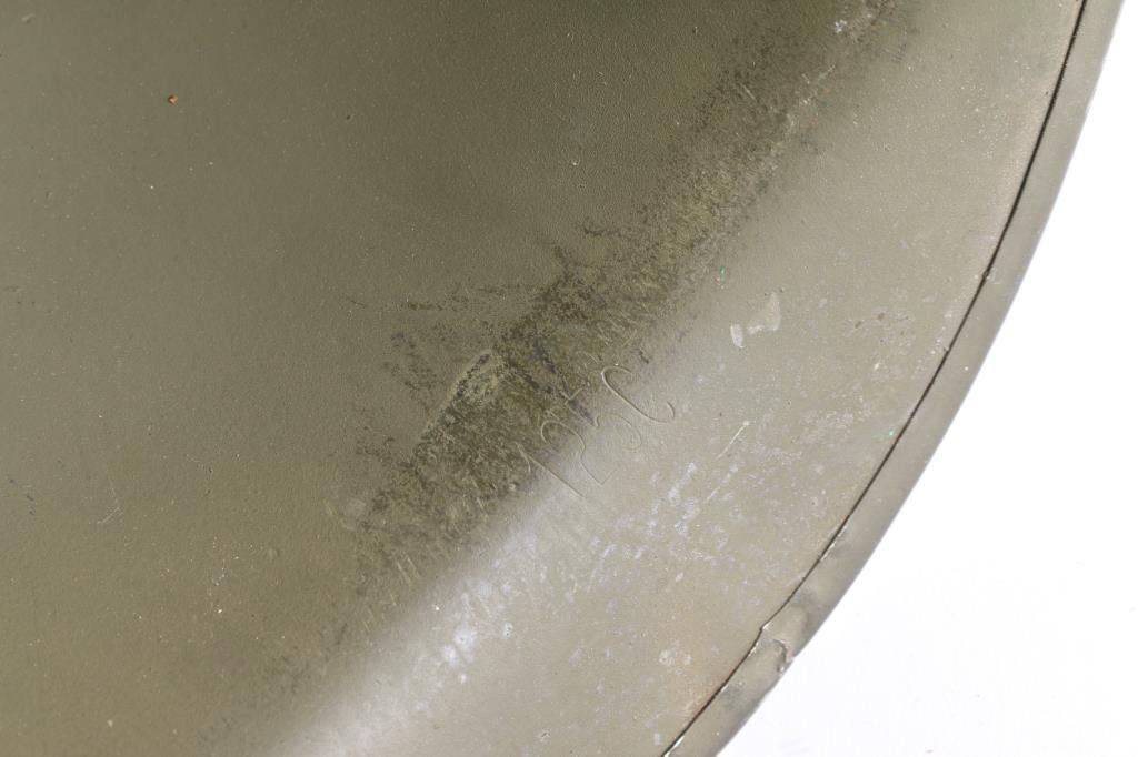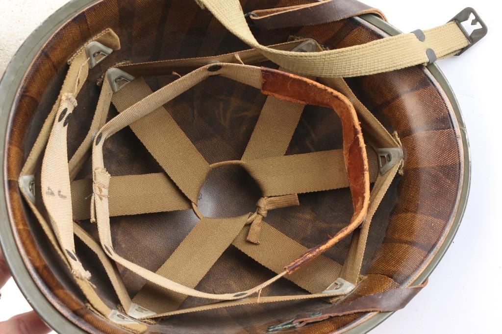 With fiber liner. Helmet dimensions are 11" x 9" x 7". A fine example of the helmet and liner combination worn by U. S. troops in the early campaigns of Guadalcanal and North Africa.