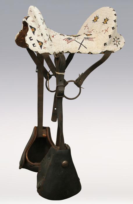 U.S. Military McClellan Saddle. Model 1904. Covered with beadwork. 20th century. Magnificent! Condition Report: Minor beadwork missing on edges. Saddle is discolored from age and use.