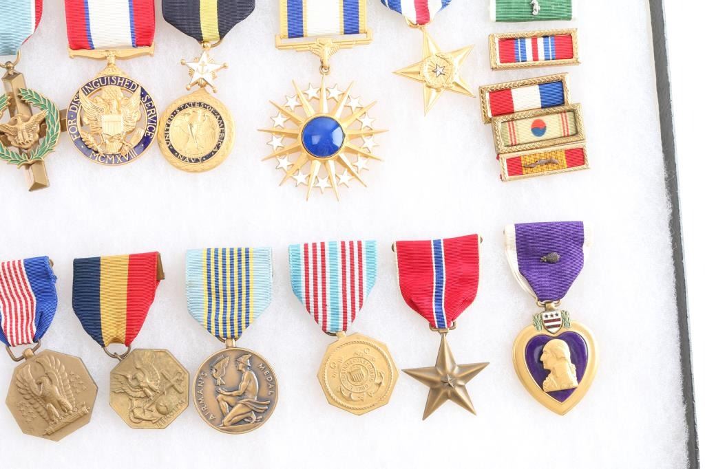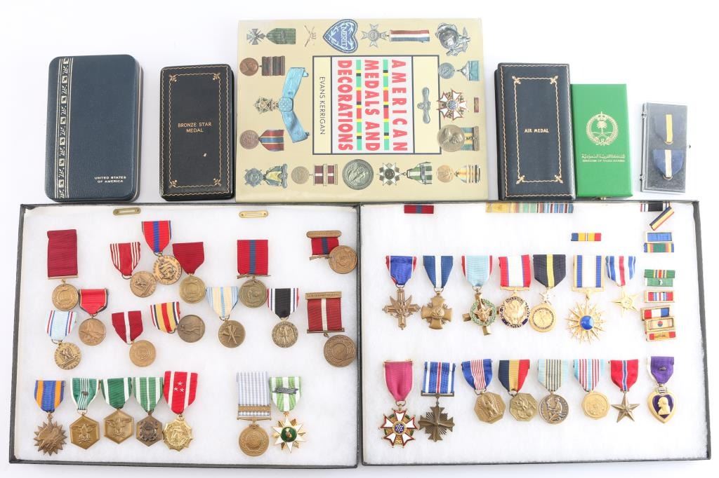 1) 16 1/4" x 12 1/4" glass topped Riker case containing 15 U.S. Personal Decoration medals. Include the Army DSC, Navy Cross, Air Force Cross, Army Distinguished Service Medal, Navy Distinguished Service Medal, USAF Distinguished Service Medal, Silver Star, Army Legion of Merit, Distinguished Flying Cross, Army Soldier’s Medal, Navy & Marine Corps Medal, Airman's Medal, Coast Guard Medal, Bronze Star and Purple Heart with Bronze Oak Leaf Cluster Device. Case also has various single ribbons. 2) 16 1/4" x 12 1/4" glass topped Riker case containing 20 various U.S. Military Medals including Good Conduct Medals, Air Medal. Commendation Medals, Korea Service, etc. Lot also includes two blue leather WW2 era medal cases, both with matching label pins, bronze Star and Air Medal. Blue leather case for the Air Force Cross with ribbon & lapel pin. Saudi Arabian Kuwait Liberation Medal in green leather case with ribbon. Plastic case containing hanging ribbons for the Navy Cross and the Navy Distinguished Service Medal. 1990 Hardcover book "American Medals and Decorations by Evans Kerrigan. All medals are in very Good condition. There is a companion lot of U.S. Military Medals in this auction. 36 Medals total.