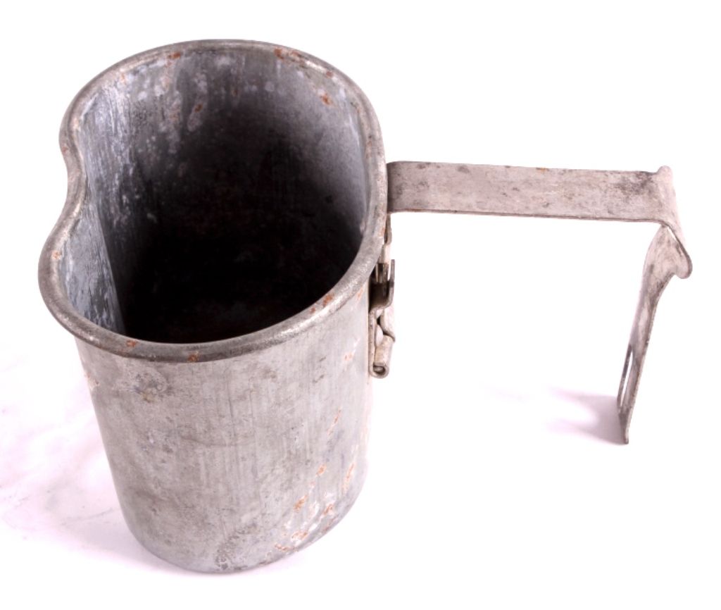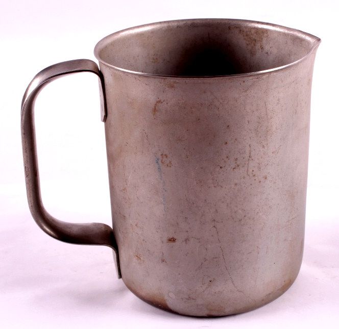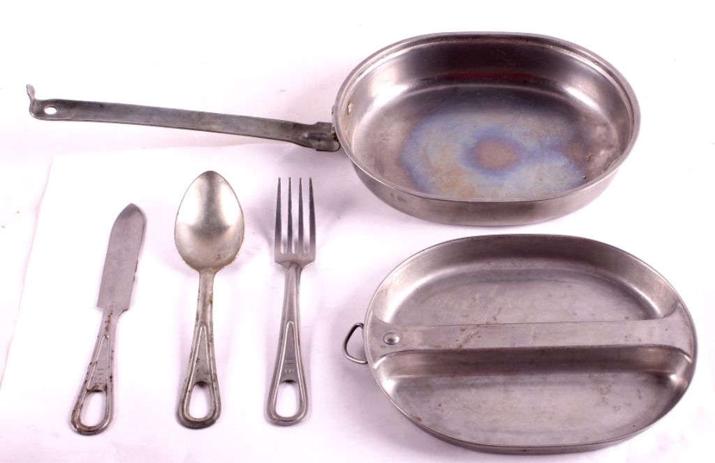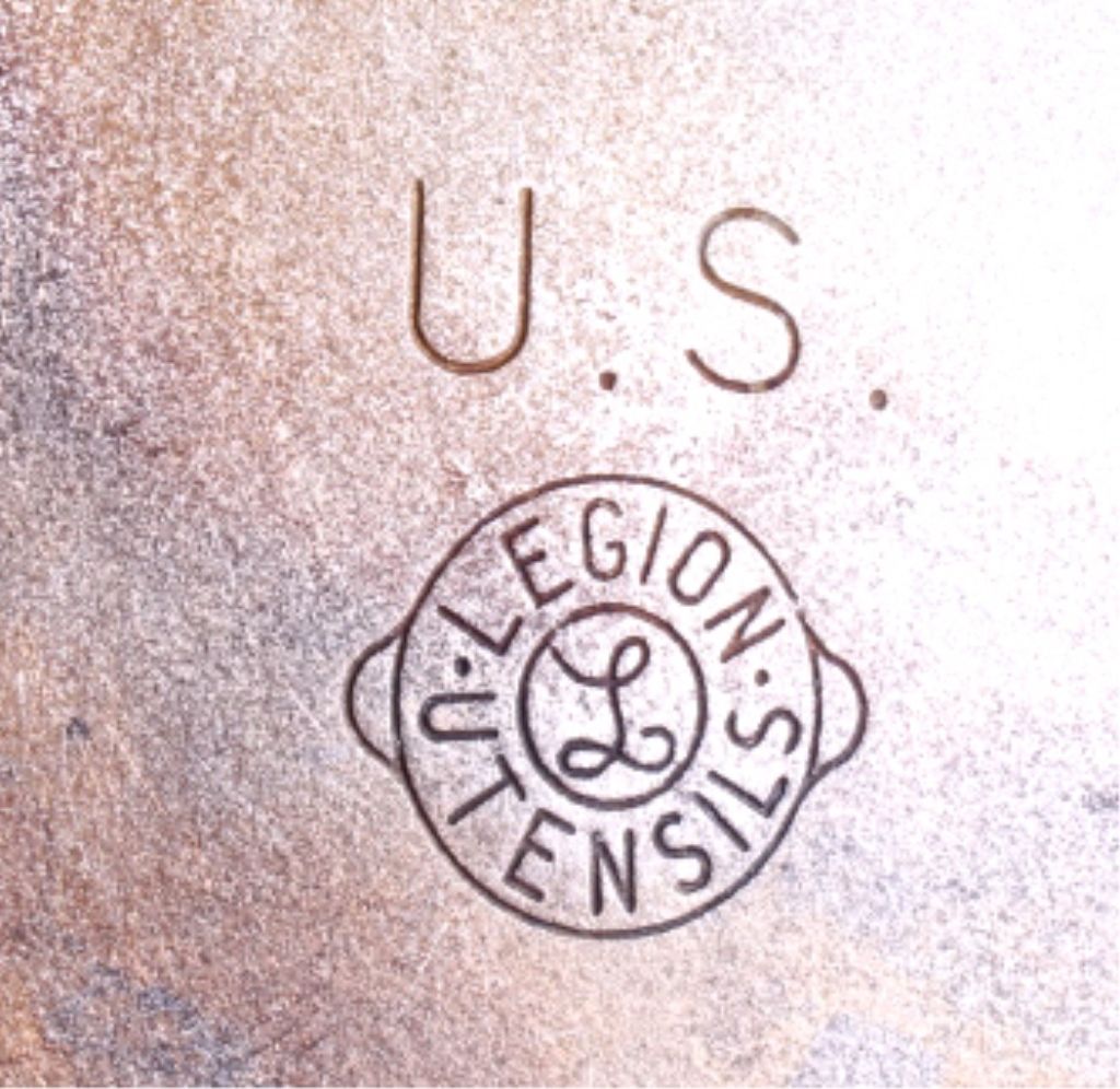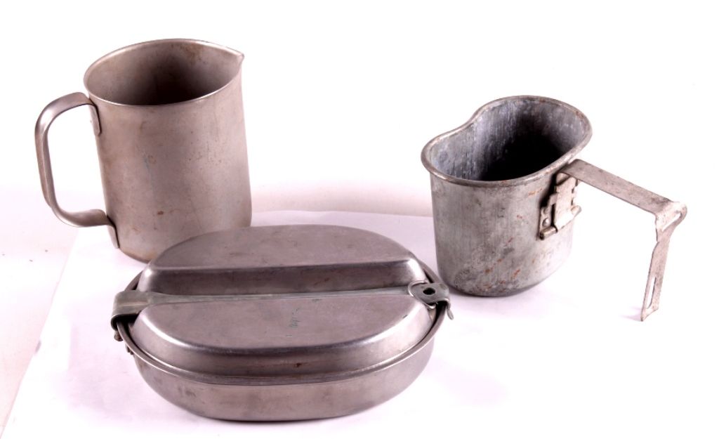 This is a collection of U.S. military mess kit supplies. Included is a small pitcher, a canteen cup, and a folding cook set with utensils. The pitcher is marked "Legion Utensils". The canteen cup is marked "A.G.M. Co. 1943". All the pieces are in good condition.