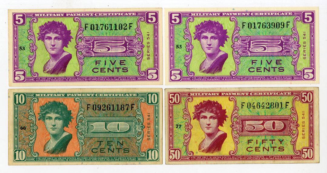 Washington, D.C....., ND (1958). Lot of 4 Issued Series 541, MPCs Includes: 5 Cents, P-M36a (2), Violet on green and yellow-green underprint, Woman with wreath at left, Back is violet on green, both AU to Uncirculated; 10 Cents, P-M37a, Green on orange underprint, Woman with wreath at left, back is green on orange, VF; and, 50 Cents, P-M39a, Brown on green and yellow underprint, Woman with wreath at left, back is red on yellow, VF to Choice VF. (4). Sold "AS IS" no returns accepted.