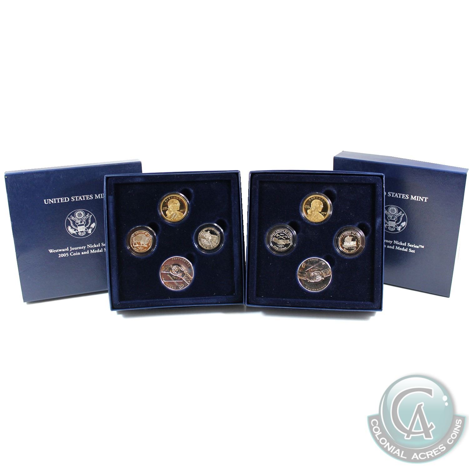 U.S. Mint Issue: 2004 & 2005 Westward Journey Nickel Series Coin and Medal Sets (some coins are toned & 2005 dollar capsule is scratched). 2pcs