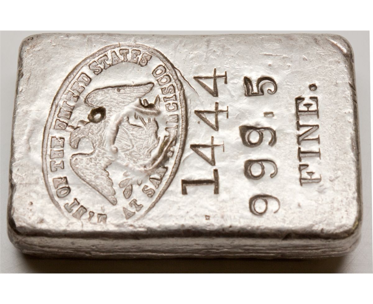 Silver ingot with "MINT OF THE UNITED STATES AT SAN FRANCISCO" seal with Eagle stamped on front side, along with number 1444, and 999.9 FINE. Stamps. Reverse indicates 5.88 OZS stamped in. Measures approx. 2"Lx 1 3/16"Wx 3/8"T.