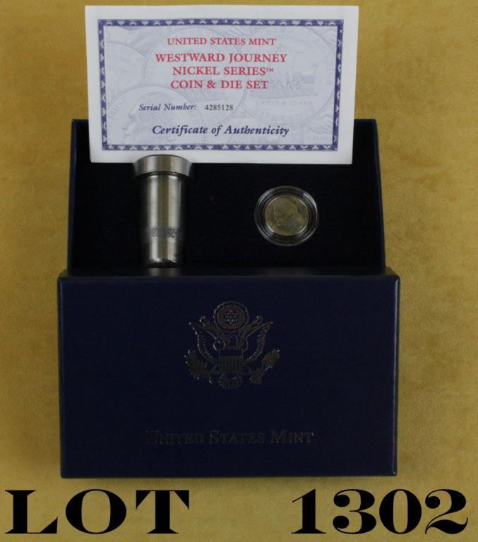 U. S. Mint “Westward Journey” coin and die set. 2004 Lewis and Clark commemorative five-cent nickel in proof condition with mint die, in box. $100 - $300
