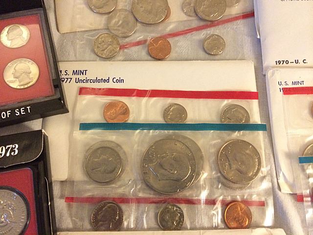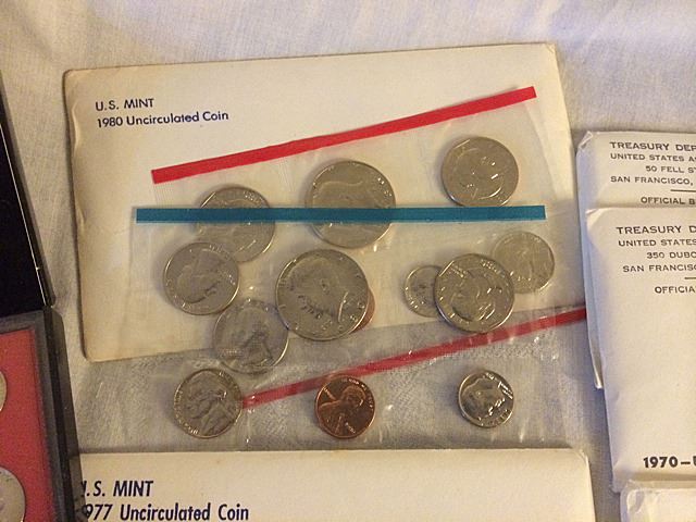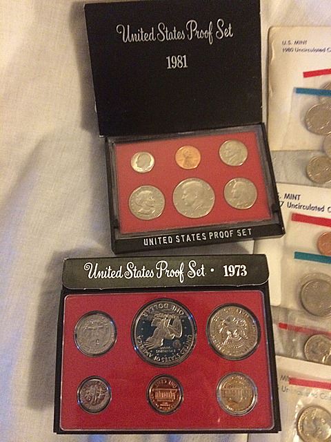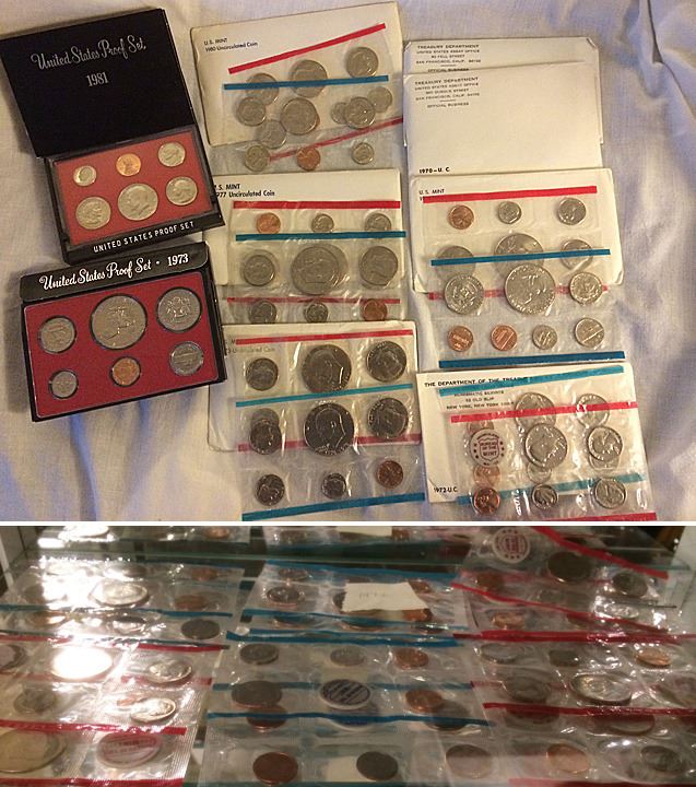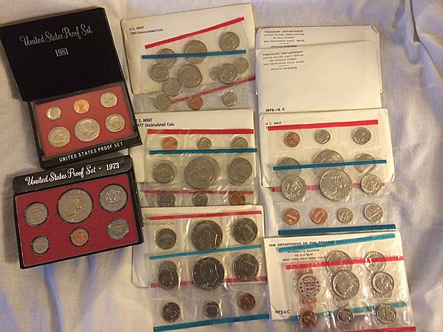 U.S. Mint proof sets includes 1970, 1971, 1972, 1973, 1974, 1976, 1977, 1980 and 1981. Approx. 11 sets of 1972 US Mint Sets in plastic. Approx. 20 sets.