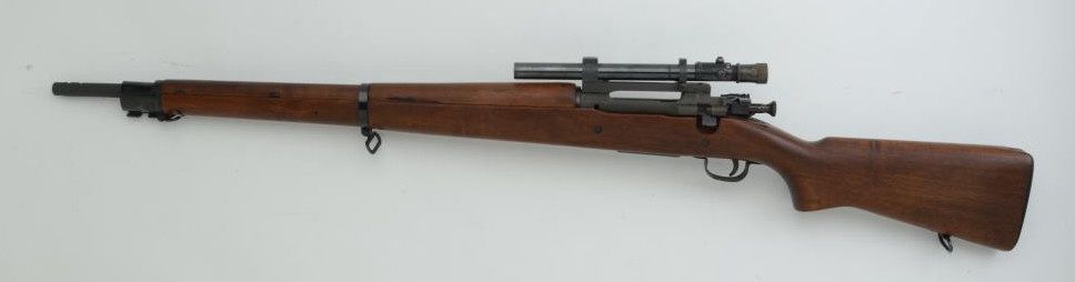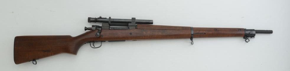U.S. Model 03-A3 by Remington bolt action sniper rifle, .30-06 cal., R.A. 24-1/2” barrel dated 3-44, parkerized finish, wood stock, Weaver Model 330 scope on Redfield base, #3414404. This gun is in overall finecondition as arsenal re-finished showing the majority of its parkerized green finish on the barrel and receiver and blue finish on the bands, bolt, floor plate, trigger guard, butt plate and sling swivels, the bore isfine, the markings are sharp with the correct off-set frame serial number and maker/model, the action is crisp and the stock is fine with very sharp circle P proof behind the trigger guard, sharp RA, FJA and crossedcannons on the left side of the stock above the trigger and sharp sub-inspector’s marks in front of the floor plate. Est.: $1,500-$3,000.