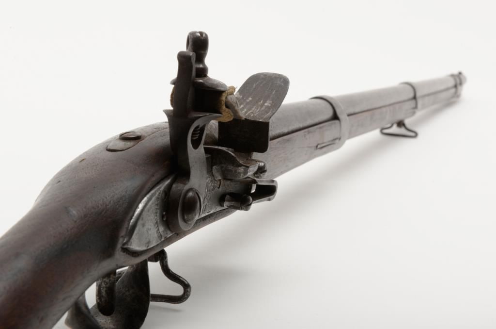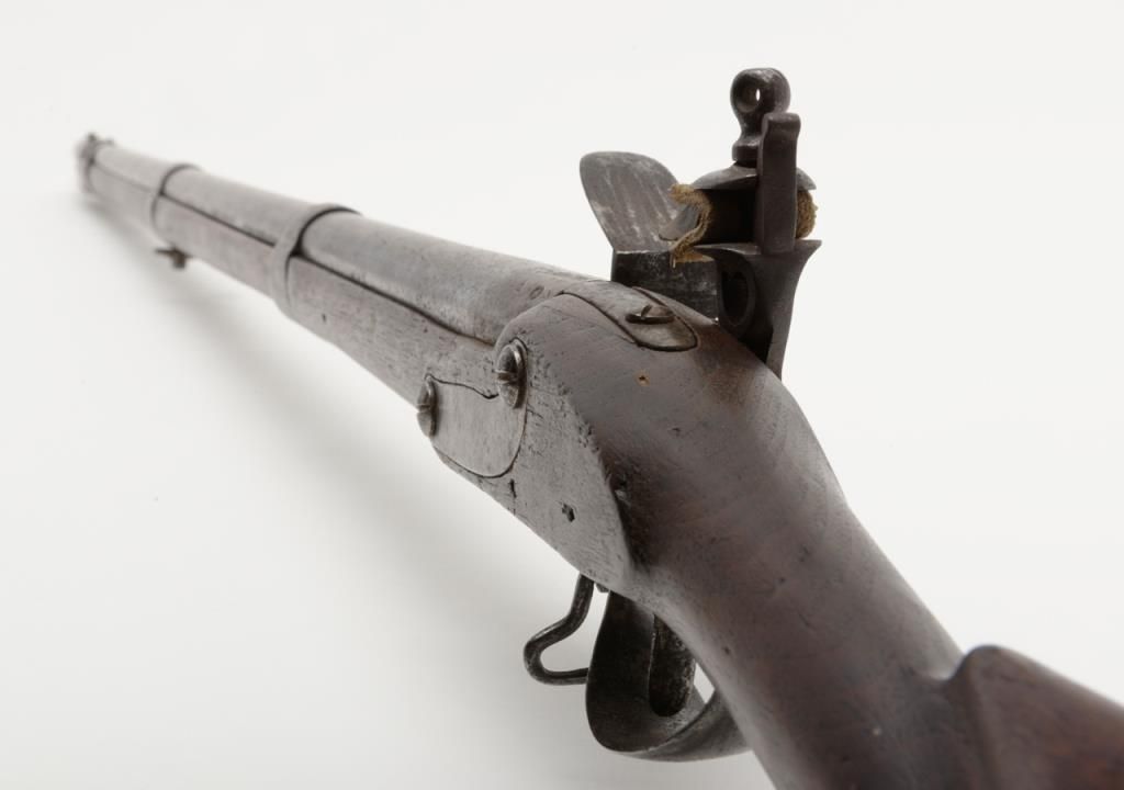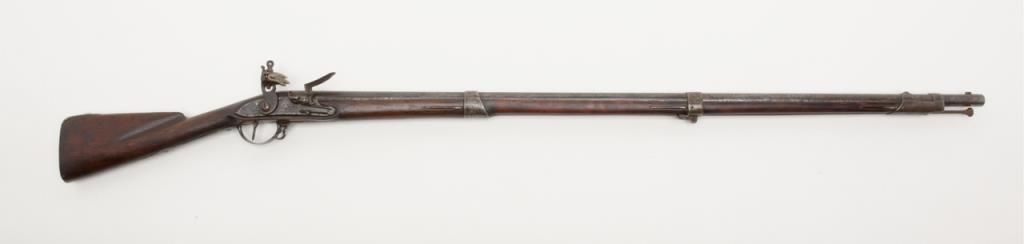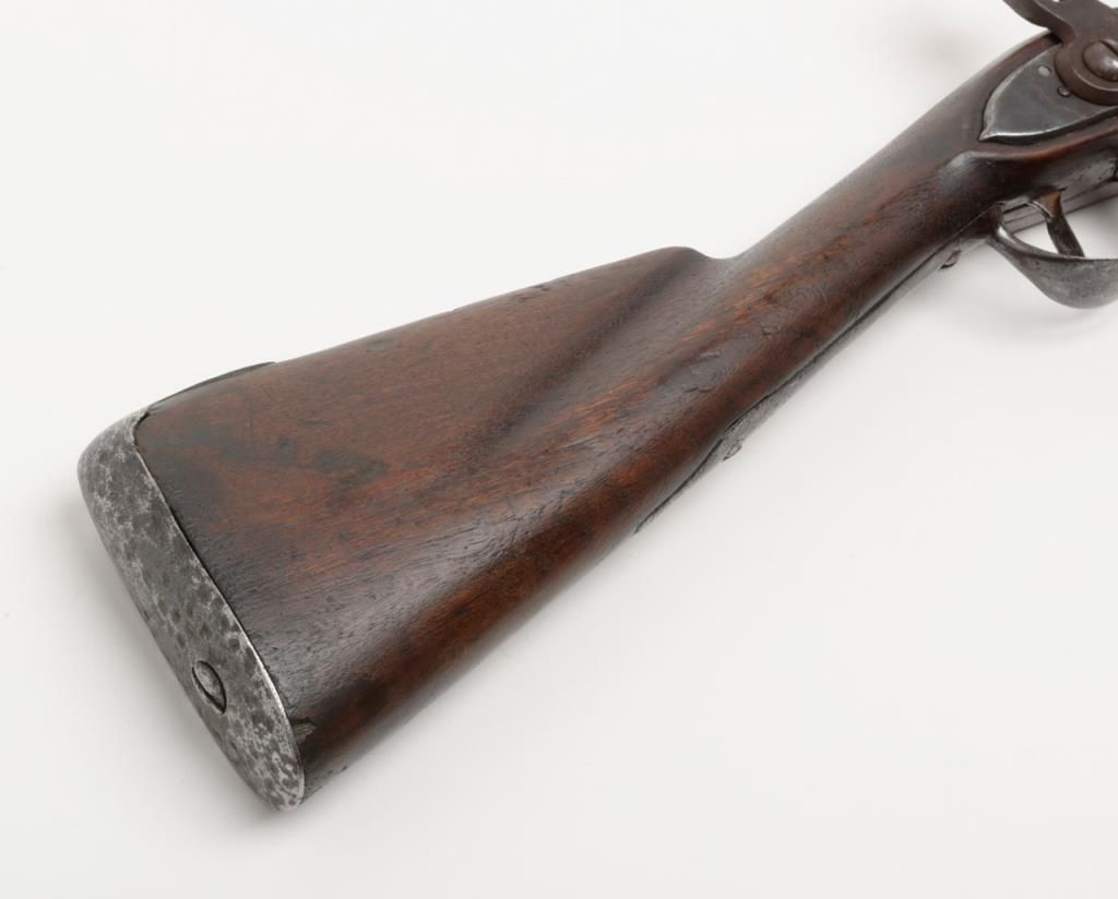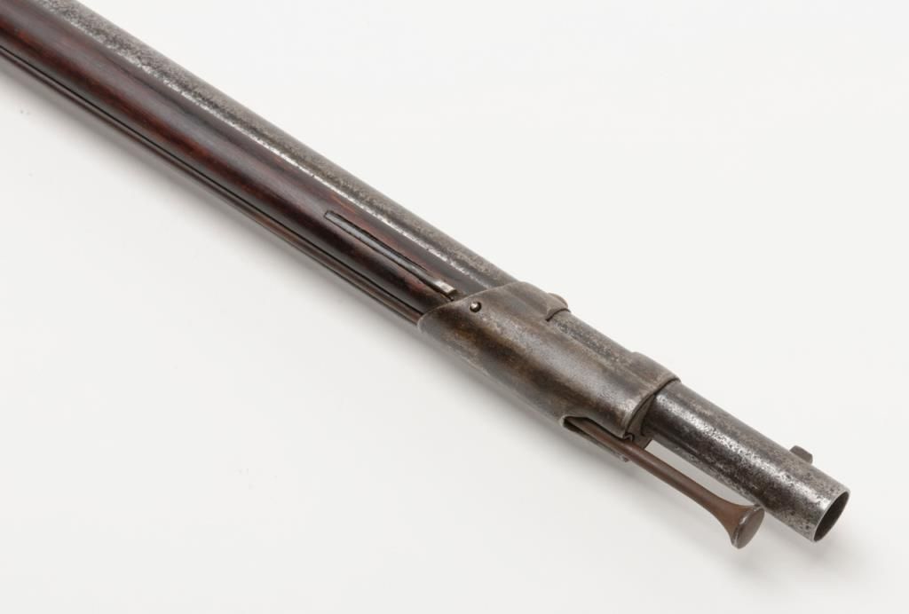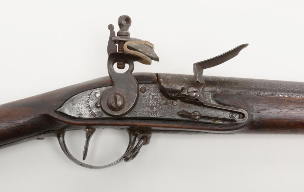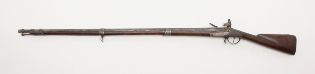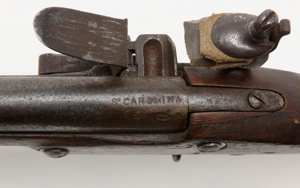 U.S. Model 1795 type 1, .69 caliber smoothbore musket by Springfield Armory showing Springfield in curve at area behind hammer showing features of manufacture pre-1798 with South Carolina marking at the rear of the breech. The lock shows afaceted iron pan and the bayonet stud is 5/8” from the front of the muzzle (Refer Flayderman 9A-005). The metal surfaces show a gray to brown patina finish with scattered light to moderate pitting and erosion with some slightly heavypitting underneath the pan and at the breech end of the barrel. The stock shows well done restoration to the forend in front of the band where the wood is replaced. The butt plate shows heavy pitting with light cleaning and the triggerguard shows a like condition. The musket shows some replaced screws and minor restorations. The lock is in its original flintlock configuration with correct parts. An original type ramrod is included. South Carolina marked 1795 flintlockmuskets were in Armories and were pressed into service by Confederate forces at the beginning of the Civil War. Wiliam A. Gary consigned by his estate. Est.: $2500-$5000