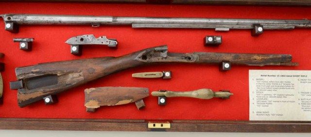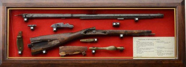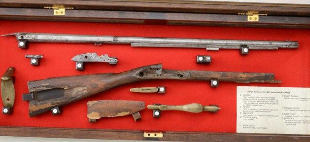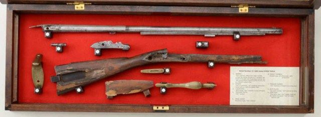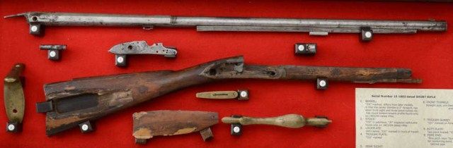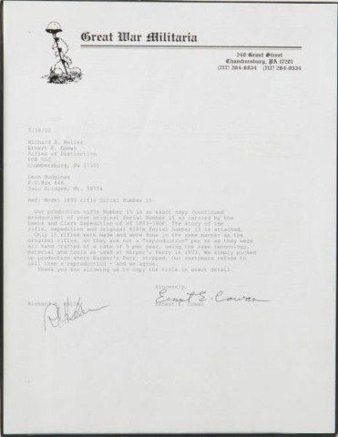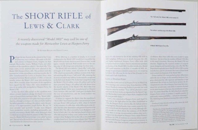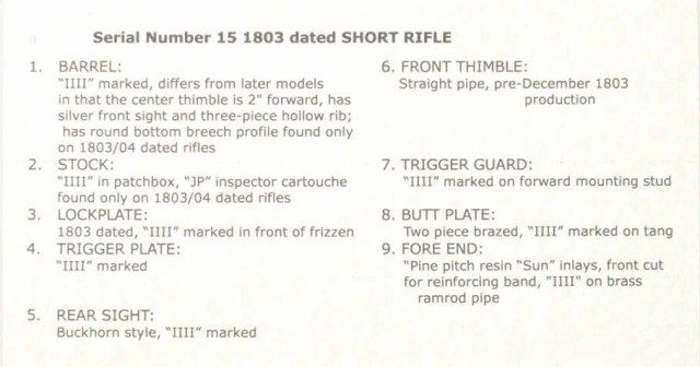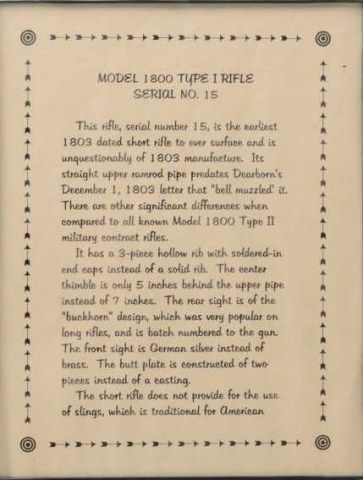 U.S. Model 1800 flintlock rifle serial #15 made at Harper’s Ferry Arsenal under the direction of Joseph Perkin and pre-dating any other known specimen made at a National Armory and presumed to be one of the 15rifles made for the Lewis and Clark Expedition. An article published for the American Society of Arms Collectors by Michael F. Carrick details and documents these short rifles with barrel lengths of 33” and examines this gun’s construction in detail and determines it to be a pre-production example preceding the Army contract. Also, it mentions a .54 caliber and variations in construction of rib and rearthimble. This article is well-written and researched and refers to an article by Richard Keller and Ernest Cowan entitled “The Short Rifle of Lewis & Clark”. This article discusses this rifle, #15, and states that it is a Model 1800 made in the first 11 months of 1803. This article and the prior article provide convincing theory that this Model existed and was produced under Perkin’s supervision for the Lewis and Clark