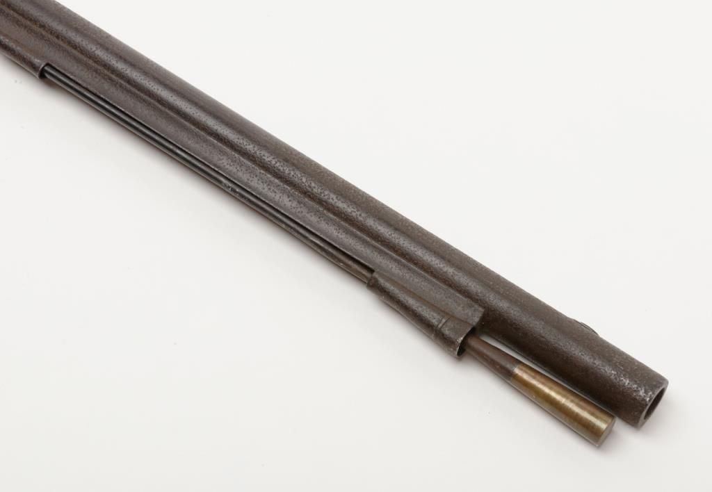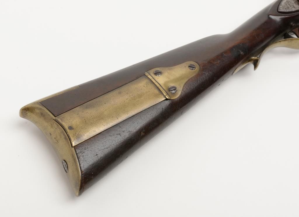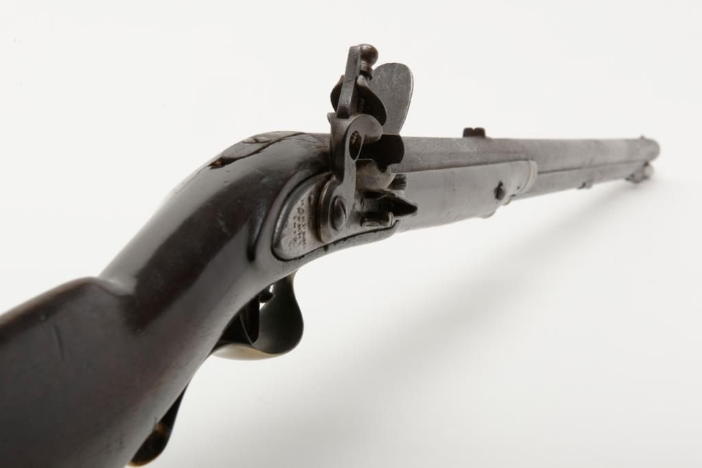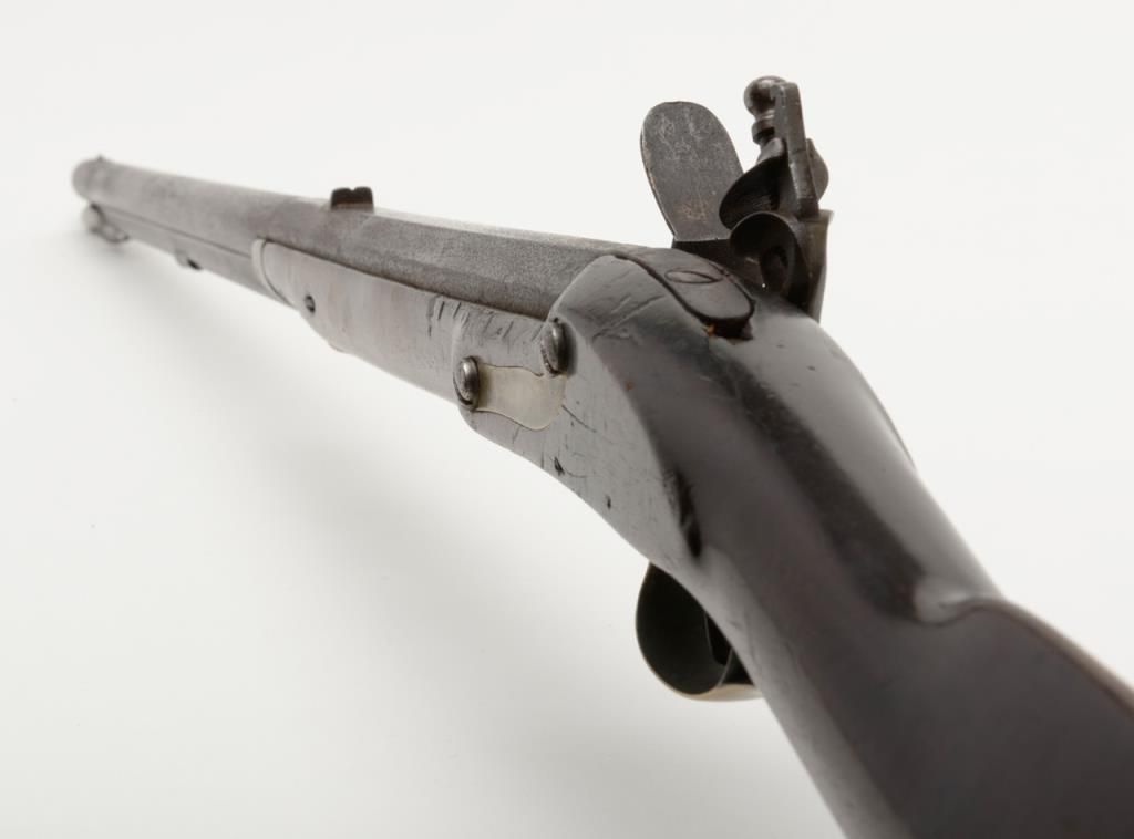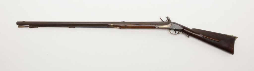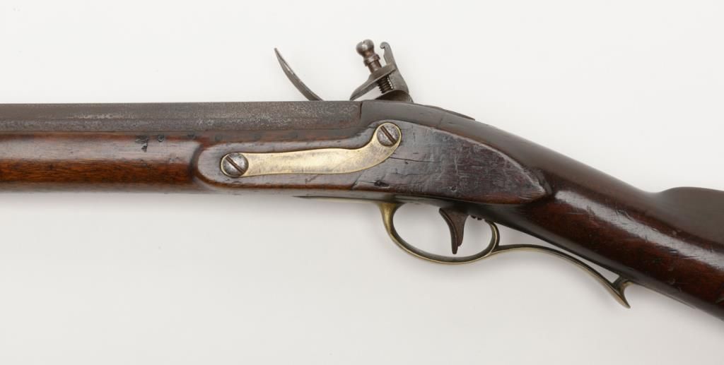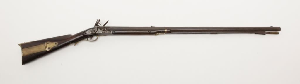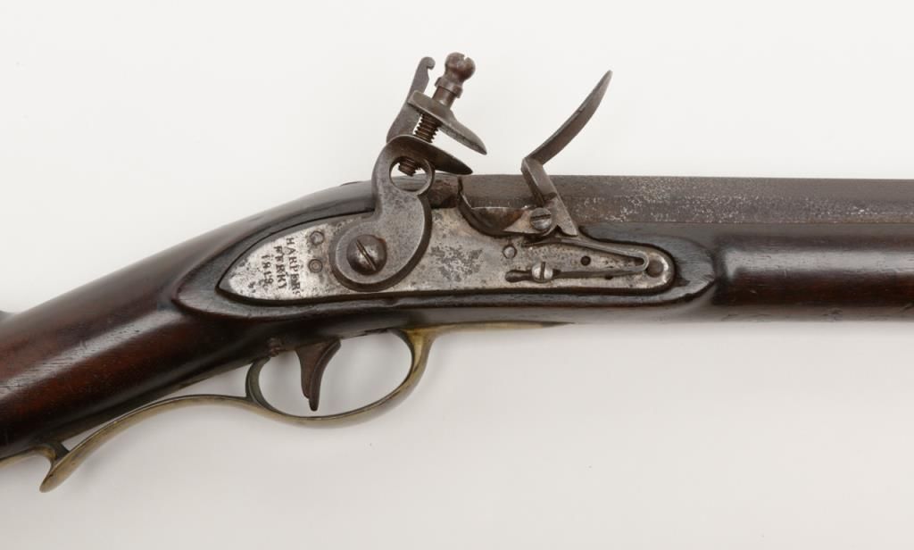 U.S. Model 1803 Harpers Ferry rifle dated 1819 in .54 caliber remaining in good condition showing excellent reconversion back to flintlock. The barrel shows light to heavy scattered pitting and erosion. The lock shows some cleaning and is aging back nicely. The reconversion is difficult to detect as the hammer is made almost perfectly and the work is done well. The stock is in good to very good condition with some small losses around the tang, minor scratches and just light normalaging. The brass mounts show a good patina. A correct style ramrod is included. The area just beneath the lock shows the addition of a screw behind the trigger which may have been used on the sear as a form of homemade set trigger. The rifle shows a 36” barrel with a 30 ½” stock. Refer Flayderman 9A-115. William A. Gary collection consigned by his estate. Est.: $2000-$4000