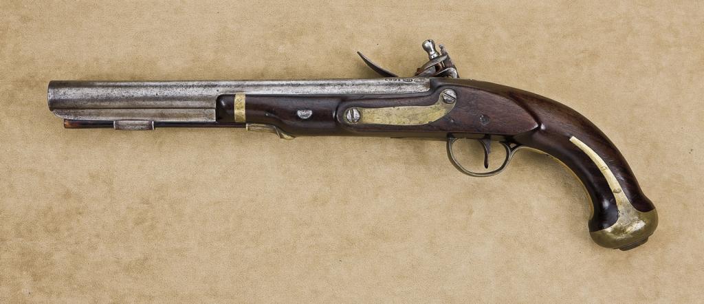 U.S. Model 1805 flintlock pistol by Harper’s Ferry, .54 cal., 10-1/16” barrel, wood half stock. This gun is in overall good + condition showing an excellent quality re-conversion to flintlock, crisp action, dark bore, light brown patina on barrel with scattered areas of erosion and moderate pitting around the touch hole; barrel is US and eagle proofed on the left side at the breech and also has the numbers “1667” at that location, the lock plate shows very good “U.S.” under the spread eagle and very good Harper’s Ferry marking at the rear of the lock plate with the date 1808. The brass mounts are good with a pleasing patina and the wood is good with some wear and old loss at the rear of the lock plate and an old repair of a crack at the underside of the back of the lock plate but otherwise complete and showing good stock marks on the left side above the trigger guard; wood ramrod. A key early Martial Harper’s Ferry pistol that is not easily found in any condition on today’s collector market. From the Richard Wolfe Estate. Est.: $5,000-$10,000.