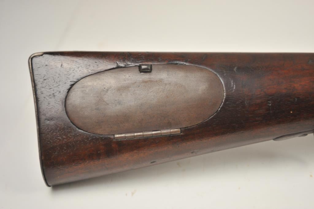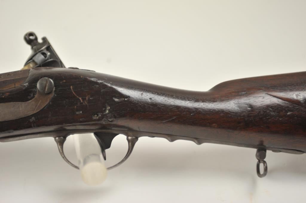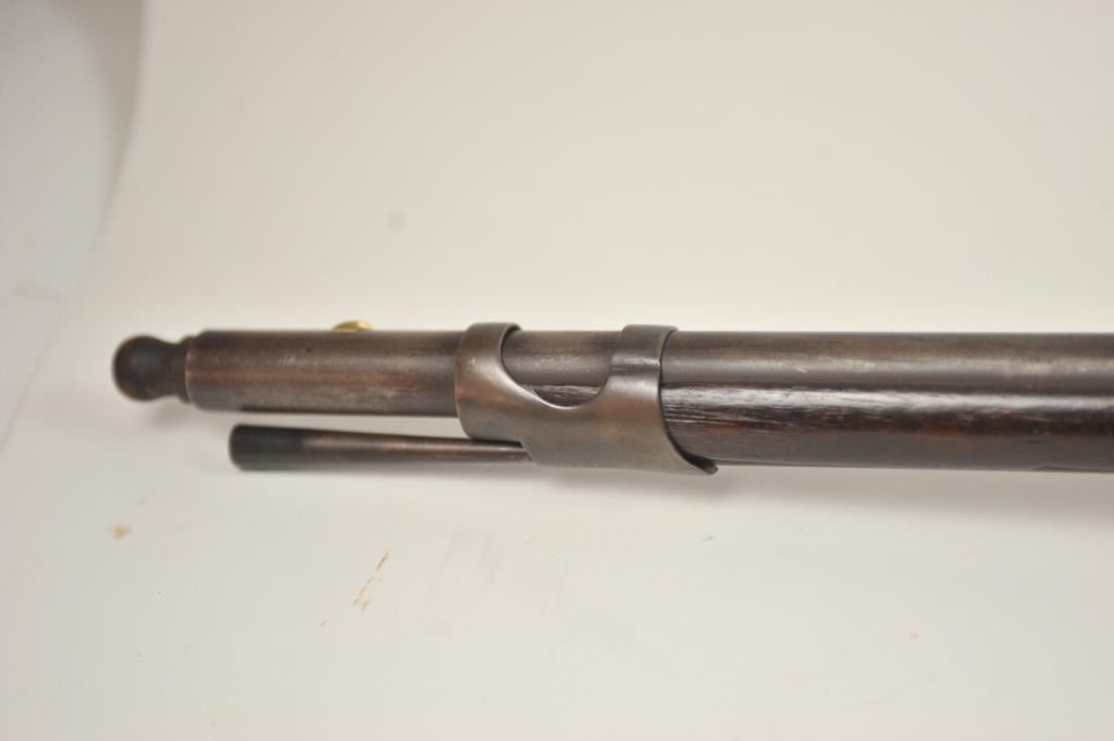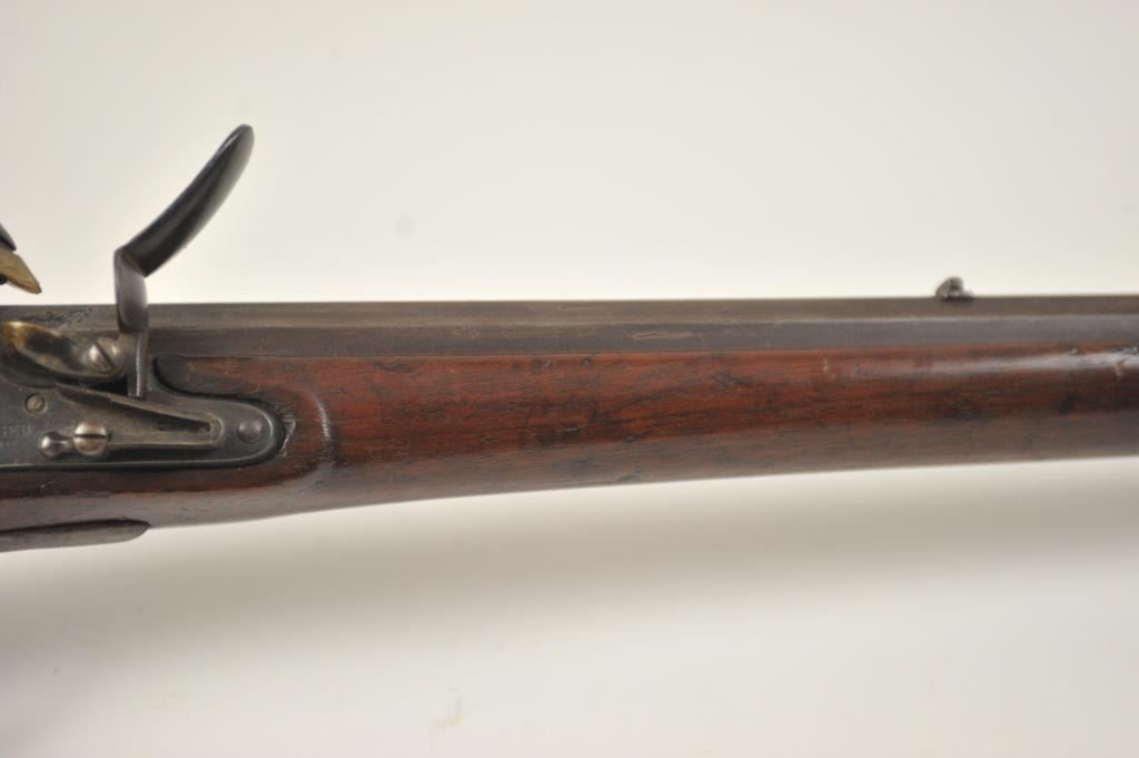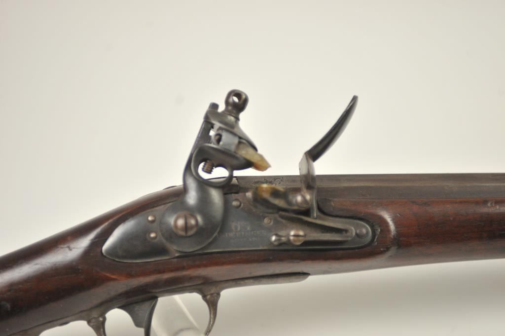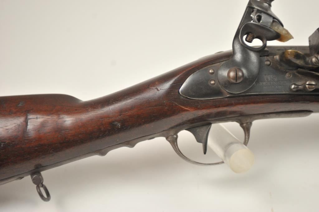 U.S. Model 1814 Common rifle by Henry Derringer with a 33 3/16” barrel marked with a large U.S. on the lock and H. Derringer, Phila. Also marked in two lines on the barrel, .54 caliber rifled and expertlyre-converted back to flintlock from percussion. The stock shows some restoration and refinishing and a couple areas of small losses of wood during use. Only 2,000 were delivered by H. Derringer, who’s name becameinfamous with the Lincoln assassination pistol. The rifle is in N.R.A. good overall condition. Est.: $1,400-$2,800. (Antique).