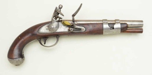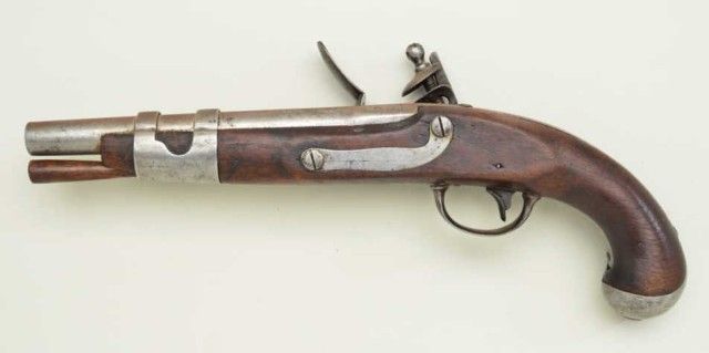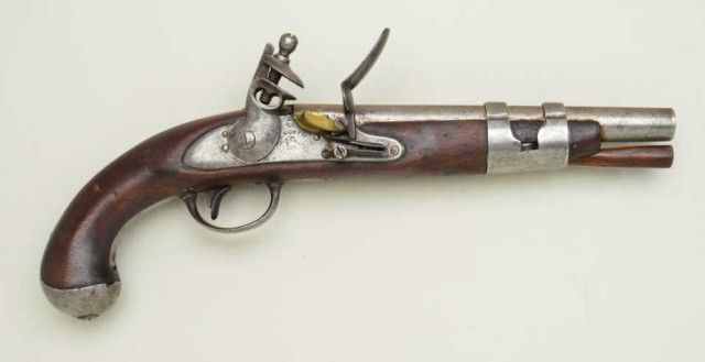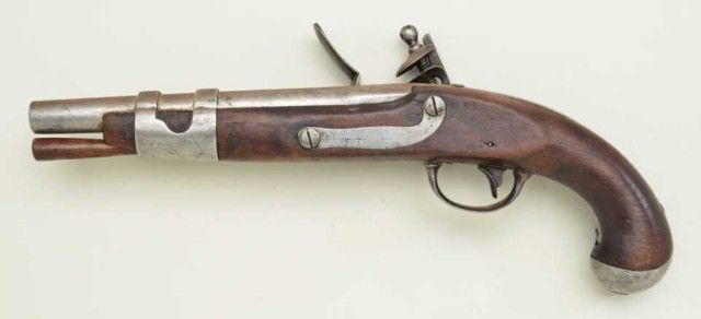 U.S. Model 1816 Flintlock pistol by S. North in 54 cal smooth bore, all features as standard issue on this model with larger dye stamps of name and address indicating slightly earlier mfg. Refer Flayderman6A-017. The metal surfaces show some light to moderate erosion and pinprick pitting. The bottom line of lock marking missing after the d in Midltn Con. The stock shows some cleaning but fits up to the metal with acouple of small losses at the tang and no visible cartouches. We would rate the stock at good. A correct style ram rod is included. The flintlock parts are all correct. From an old N.Y collector’s estate. Est.;$900-$1,800.