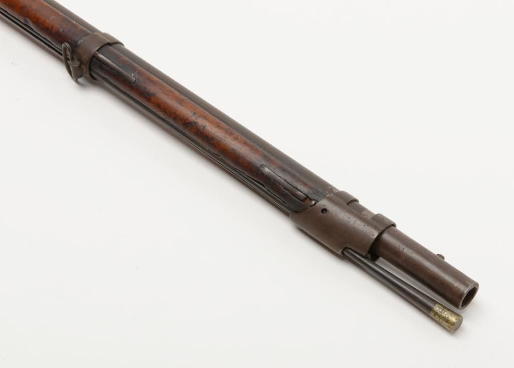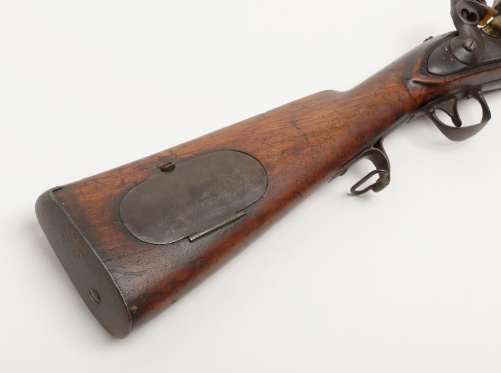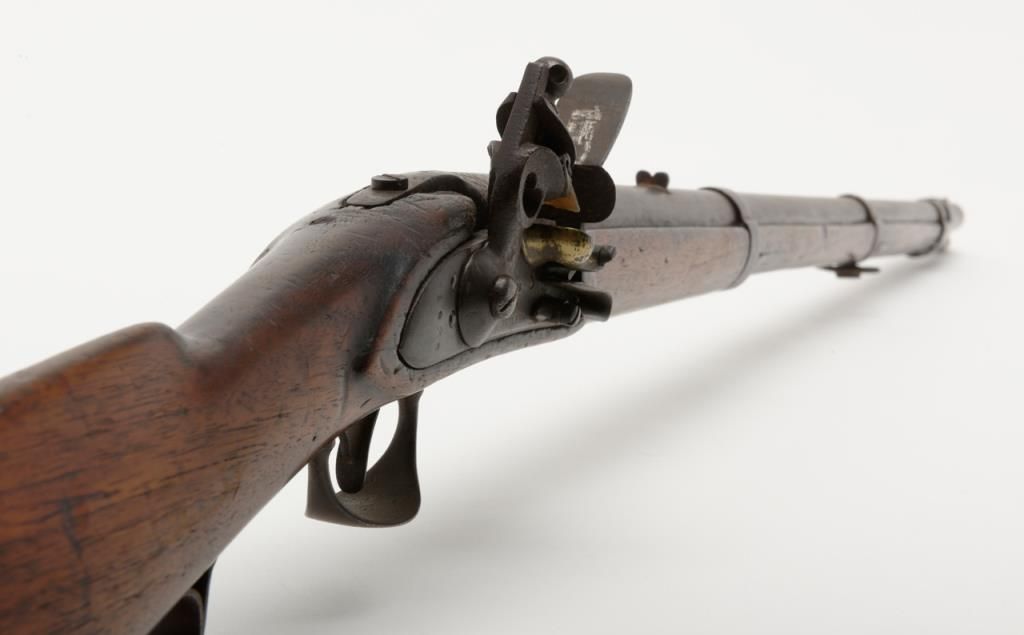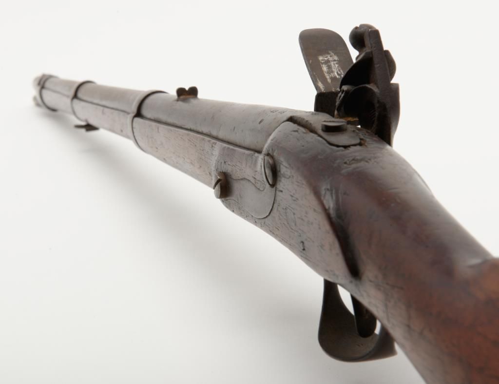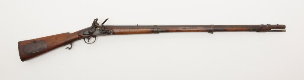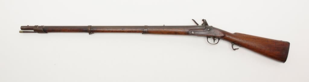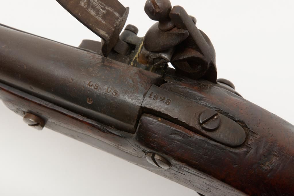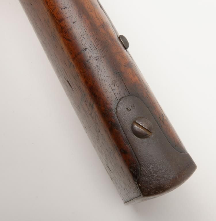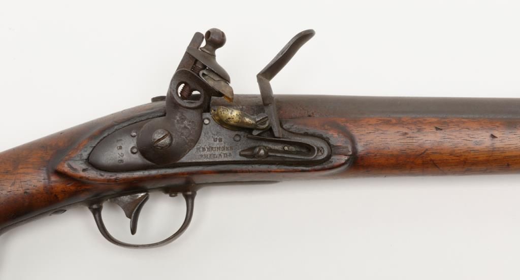 U.S. Model 1817 flintlock common rifle by Henry Derringer of Philadelphia dated 1828 on the rear of the lock and barrel in .54 caliber rifled with 36” barrel and iron mounts. The rifle remains in good condition showing a deep brown patina finishwith some scattered light to moderate pitting and erosion and some slightly heavier pitting in the breech at the end of the barrel and some heavy pitting on the hammer. The lock is well marked and remains in its original configuration withcorrect hammer, top jaw, screws and parts. The barrel is well marked and the mounts all show a similar patina with no cleaning and a nice out of the attic look. The stock shows some small losses, minor imperfections and some considerable loss of wood behind the hammer and around the tang but generally good overall with a mostly visible cartouche just over the trigger on the left side. The original sling swivel bands are retained with a correct style ramrod. Approximately 13,000 wereproduced by Derringer who of course was a famous manufacturer of small percussion pocket pistols which became infamous with the assassination of Lincoln. The collection of William A. Gary consigned by his estate. Est.: $2500-$5,000