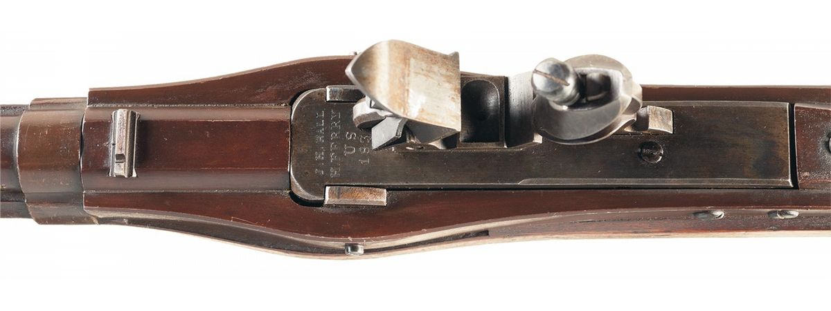 Manufactured at the U.S. Harpers Ferry Armory in 1838. The Model 1819 Hall Rifle is an extremely important U.S. martial arm. The Hall rifle was the first breechloading firearm adopted as a regulation weapon by a major power and the first mass produced firearm with completely interchangeable parts. Approximately 19,680 Model 1819 Hall rifles were manufactured at Harpers Ferry between 1823 and 1840. Hall rifles were used in the Mexican War and small numbers were still in service at the outbreak of the Civil War. This Third Model Hall Rifle has a brown lacquer finish on the barrel and iron furniture, casehardened breechblock and lock, bright iron button head ramrod. The distinctive trigger guard has a prominent finger spur, pin-fastened barrel bands and rectangular front sight base that serves as a lug for a socket bayonet. In addition to the unique breechloading flintlock action with pivoting breechblock, the barrel is bored smooth for approximately 1 1/2 inches from the muzzle to facilitate loading the rifle from the muzzle. The breech block is stamped "J.H. HALL/H. FERRY/U.S./1838" in four lines. The stock and barrel are correctly not stamped with final inspection marks or proofs.