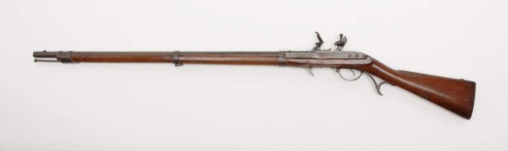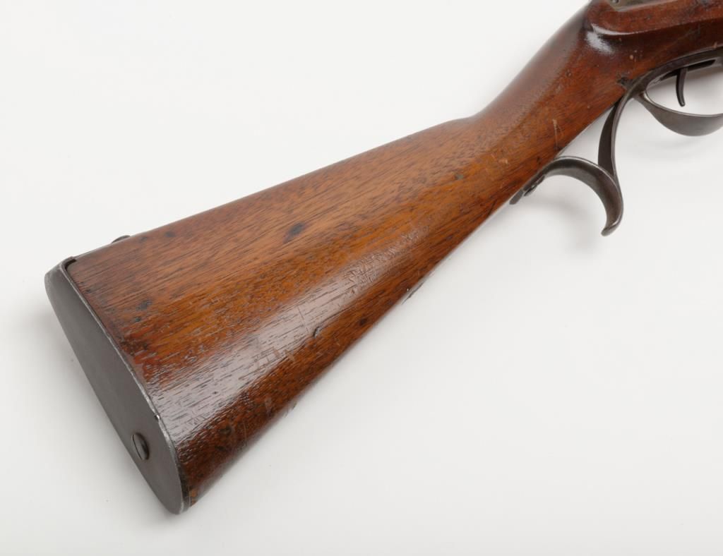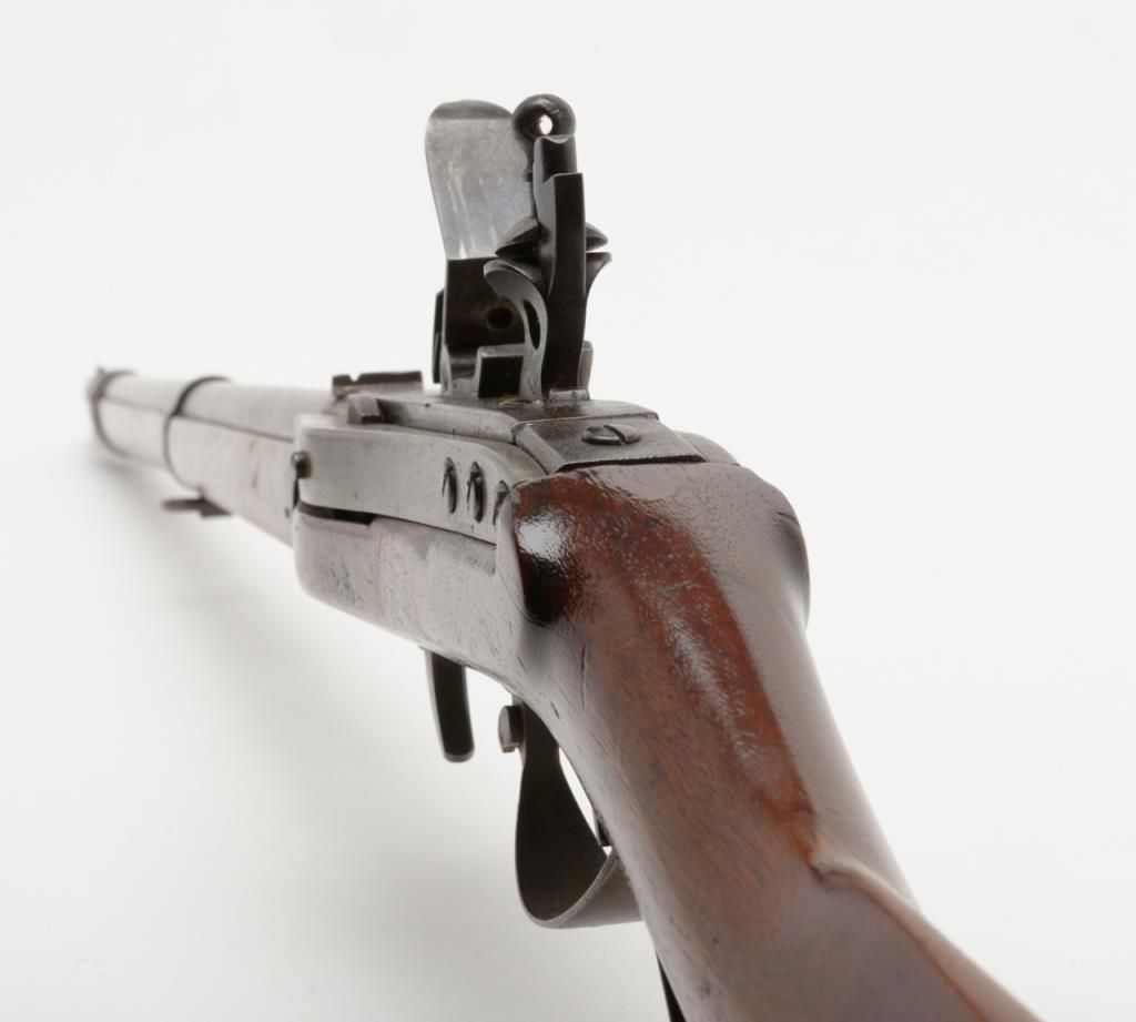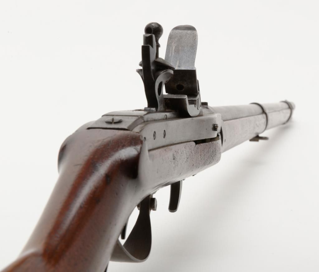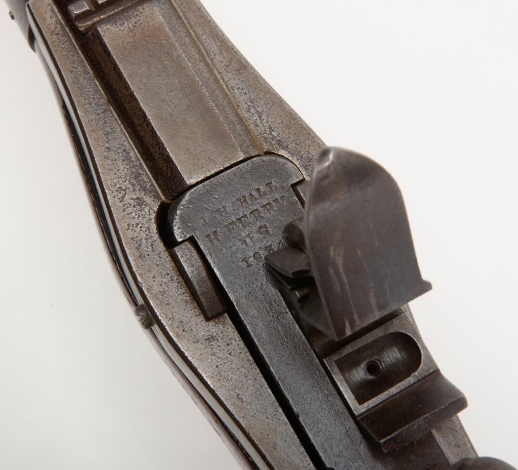 U.S. Model 1819 Hall breech loading flintlock military issue rifle dated 1834 with Harpers Ferry Arsenal markings and of 2nd configuration (refer Flayderman 9A – 249). The metal surfaces remain in good original condition with traces of originalbrown mixed in the patina on the barrel. The remainder of metal surfaces shows scattered light to moderate pitting and erosion none of which is major or unsightly. The markings on the breech block are good to very good and the stocks aregood with small losses, dings, mars, scratching and a light over coating of varnish or shellac but no evidence of sanding. There are a few minor losses of wood along the ramrod channel. The action works well and the arm is in its originalflintlock configuration with correct hammer and parts. William A. Gary collection consigned by his estate. Est.: $1700-$3400