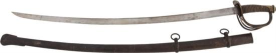U.S. Model 1840 Cavalry Saber by Sheble & Fisher. Having a 35-inch curved blade, the ricasso marked: Sheble & Fisher/Philada. One wide fuller. Standard brass three-bar guard. Brass wire-wrapped black leather ribbed grip. Original steel scabbard with ring mounts. Nicknamed inthe Old Wristbreakerin for its reputation for breaking wrists in cavalry charges, it was the standard U.S. cavalry saber for approximately 20 years. Condition: Very good. Metal with light wear, pitting and spotting. Hilt with age wear and patina. Scabbard with age wear, patina and what appears to be a bullet impact dent under the top mount.